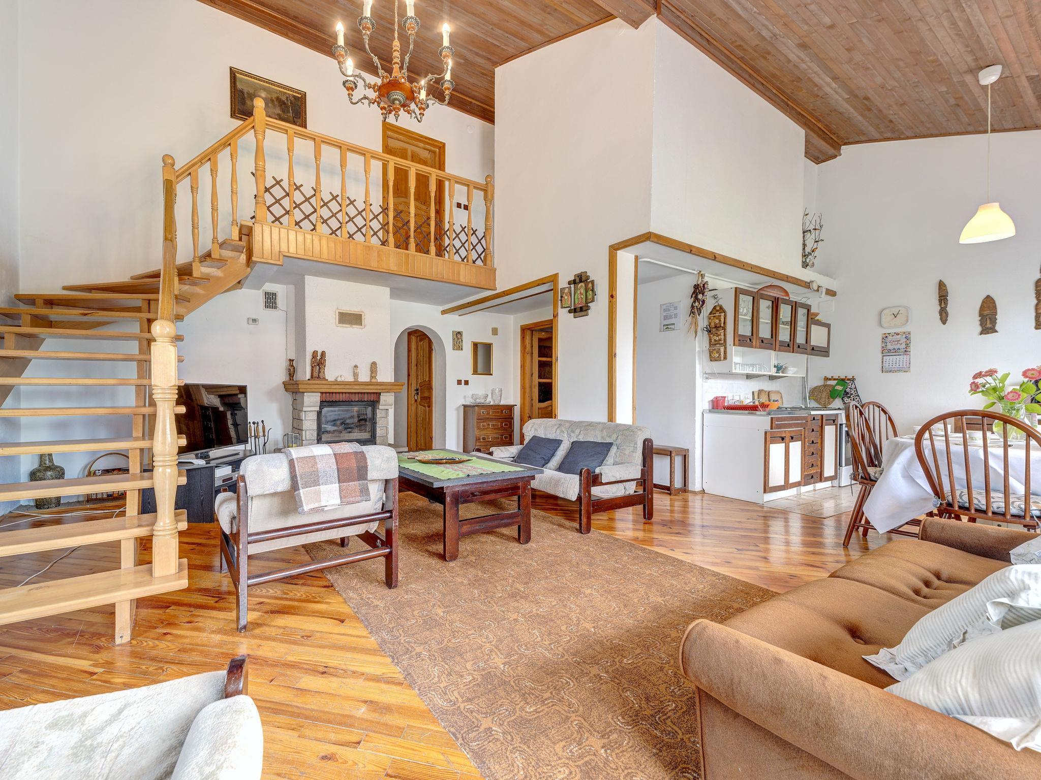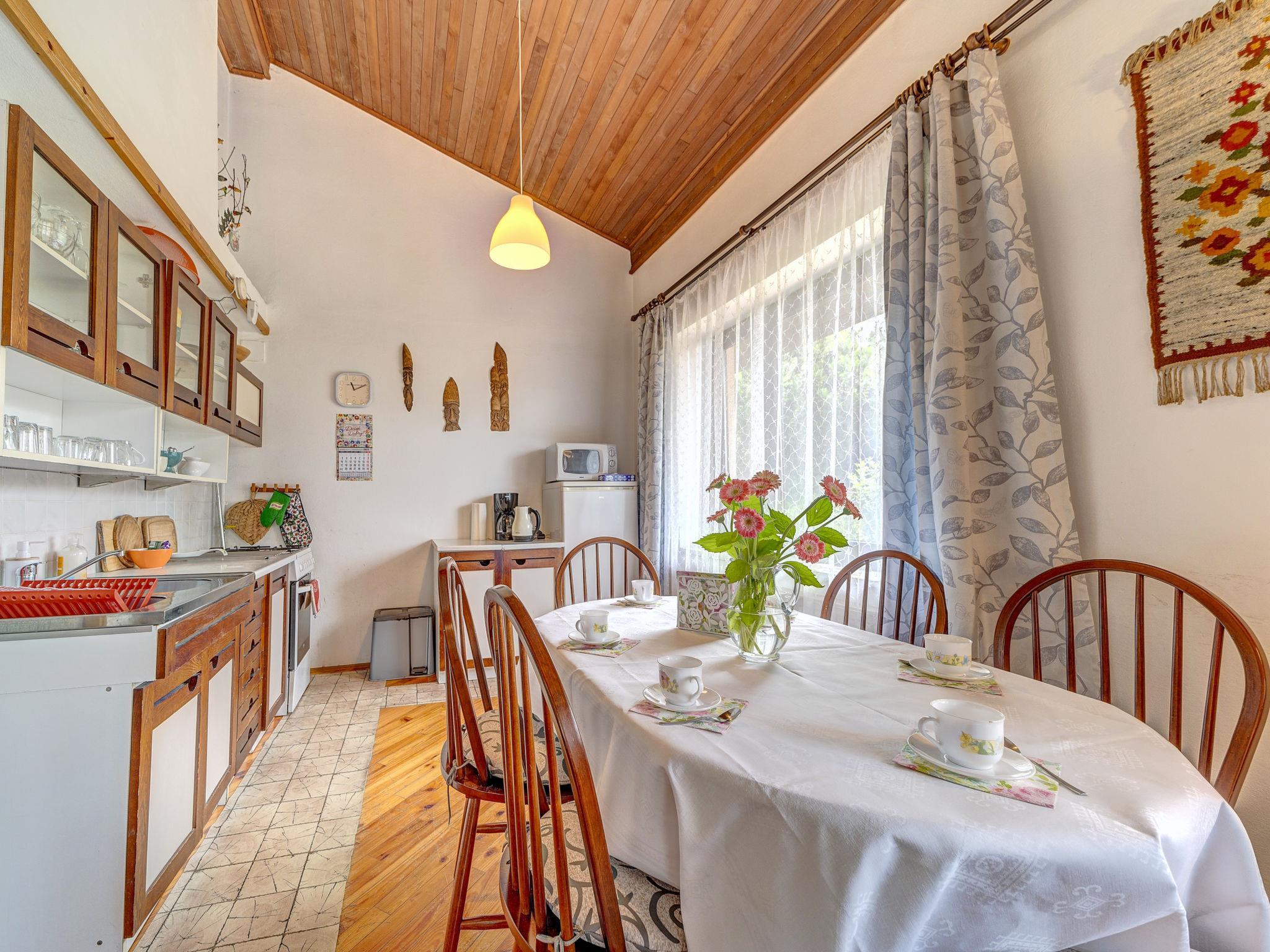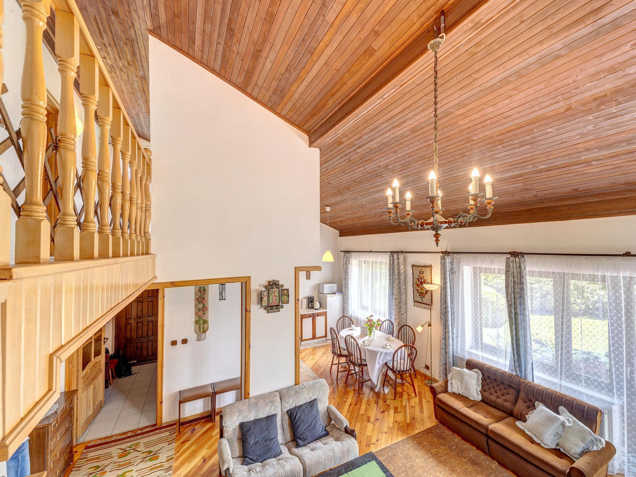 3-room house 100 m2 on 2 levels. Partly with sloping ceilings: living/dining room with open-hearth fireplace, digital TV, radio and DVD. Exit to the garden, to the terrace. Open kitchen (4 hot plates, oven, microwave, electric coffee machine). Sep. WC. Upper floor: 1 room 13 m2 with 2 double sofabeds (150 cm, length 200 cm). Exit to the balcony. 1 room 16 m2 with 2 beds (90 cm, length 200 cm), 1 double sofabed (135 cm, length 200 cm). Exit to the balcony. Shower/bidet/WC. Gas heating. Balcony 4 m2, balcony 5 m2. Deck chairs (6). View of the lake and the mountains. Facilities: iron, hair dryer. Internet (WiFi). Please note: maximum 1 pet/ dog allowed. Smoke alarm.