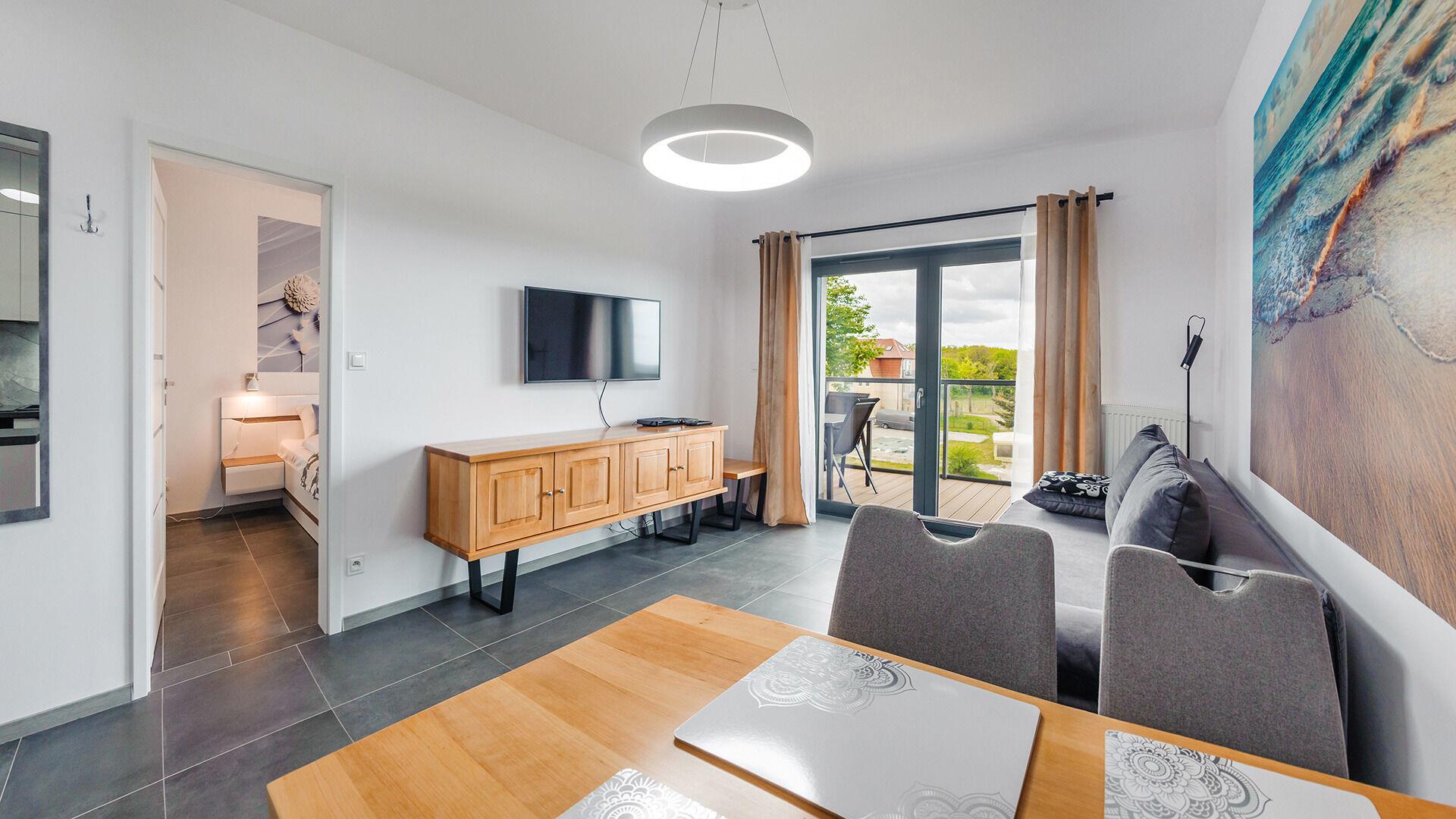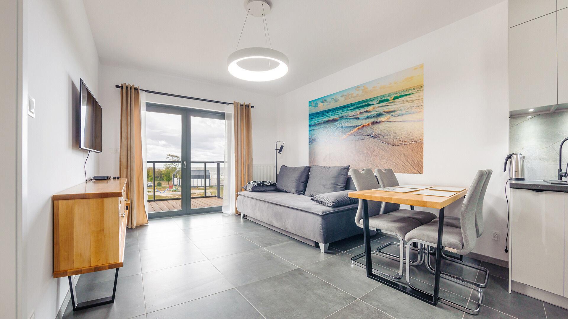 Nur 100 Meter trennen die Apartments vom breiten, sandigen Strand – ideal für Sonnenanbeter ebenso wie für ausgedehnte Spaziergänge entlang der Küste. Das Rauschen der Wellen und die frische Meeresbrise schaffen eine unvergleichliche Atmosphäre, die zur vollkommenen Entspannung einlädt.