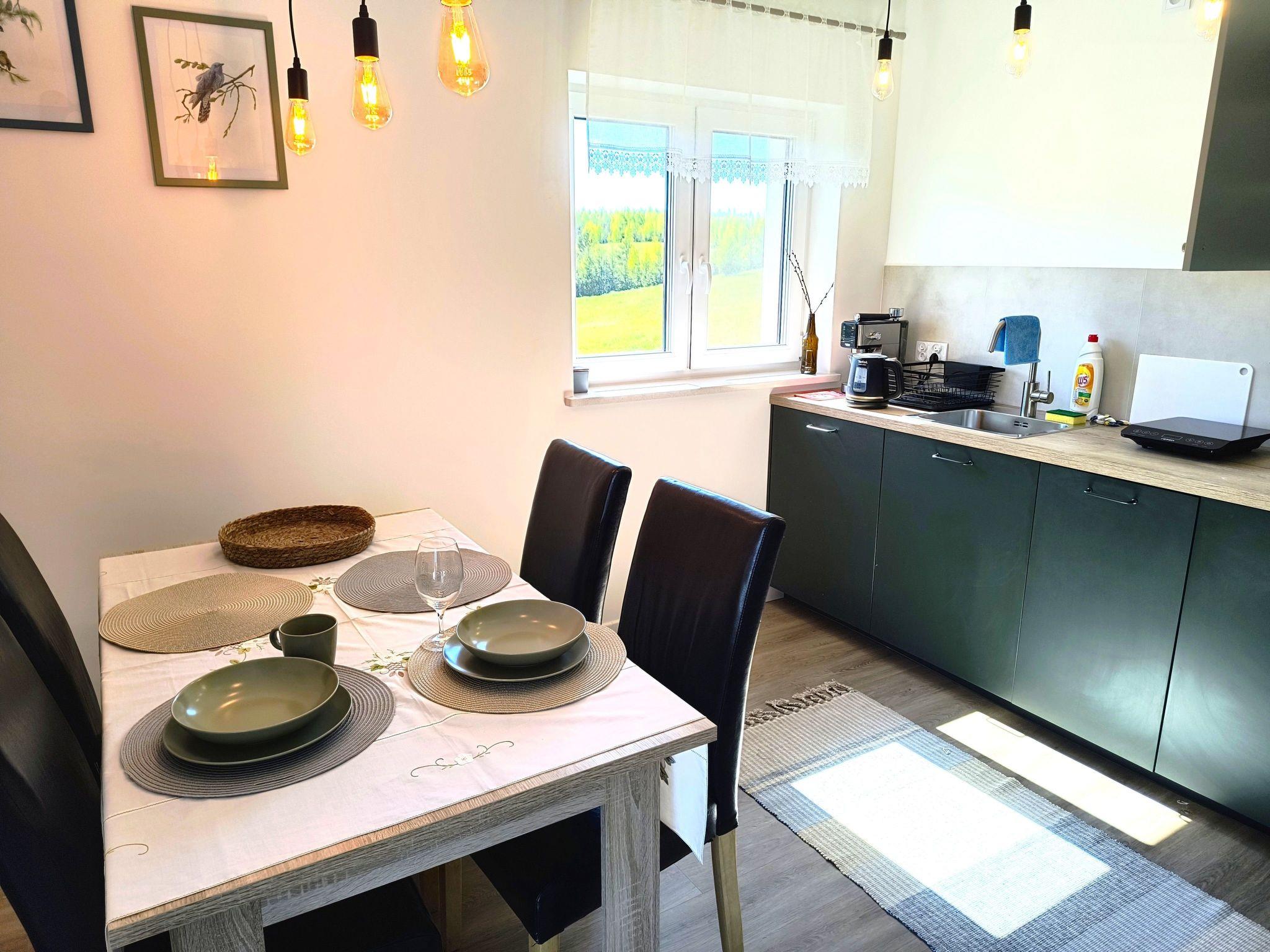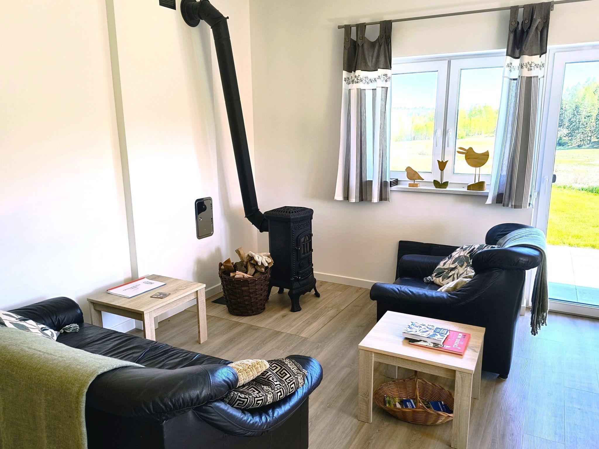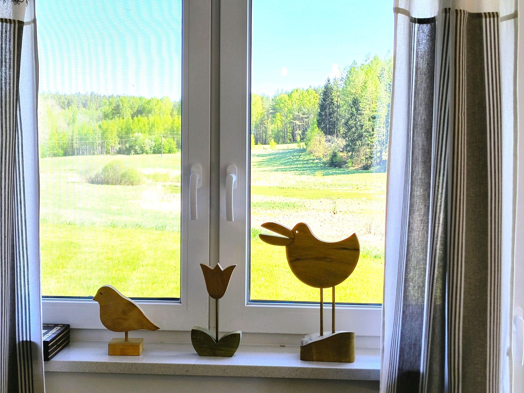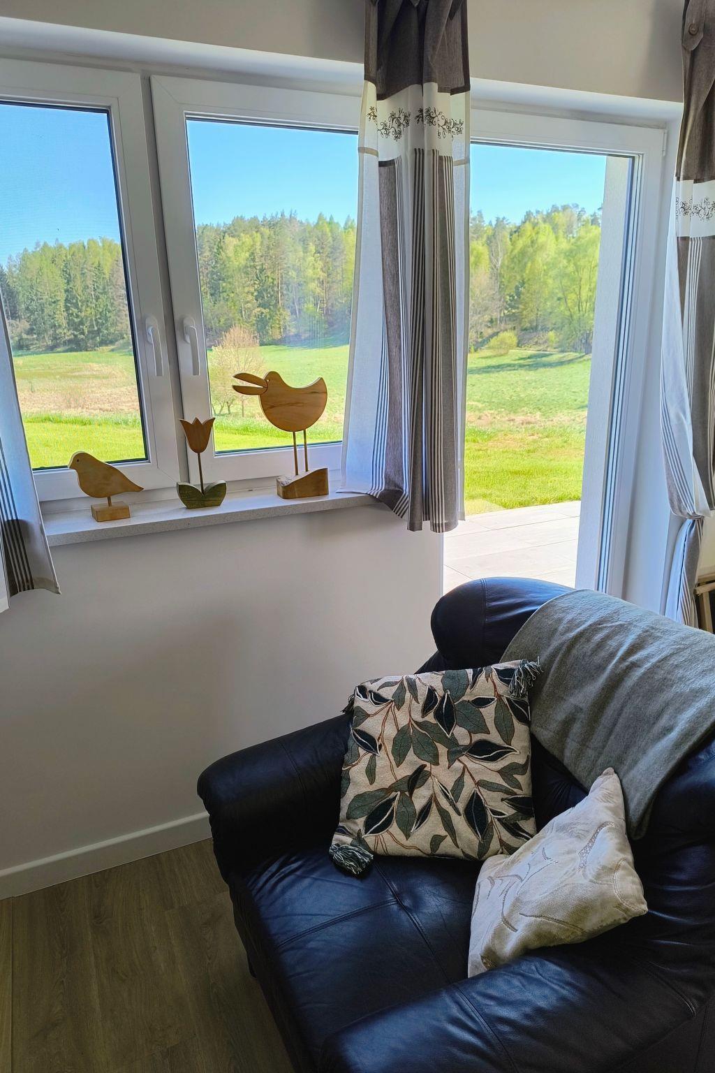 Ptasi Zakatek is a peaceful place on the border of Warmia and Mazury. Here everyone can relax. The facility is located on a 7ha plot on the edge of Tomaryny village. Space, peace and closeness to nature are our main assets. The 75m2 holiday flat occupies half of the segment. The windows and terrace overlook the forest and the floodplain. From morning to evening you can watch the visiting birds (cranes, storks, brambles, swallows, sometimes eagles) and the animals that appear on the plot (roe deer, deer, foxes, hares) On the ground floor there is a kitchenette with an eating area, a seating area around the fireplace/goat and a bathroom . The bedroom, furnished with a double bed and a sofa bed, has been arranged on the first floor (access via stairs). There are books and board games in the flat, and bicycles are available for those who wish to use them.