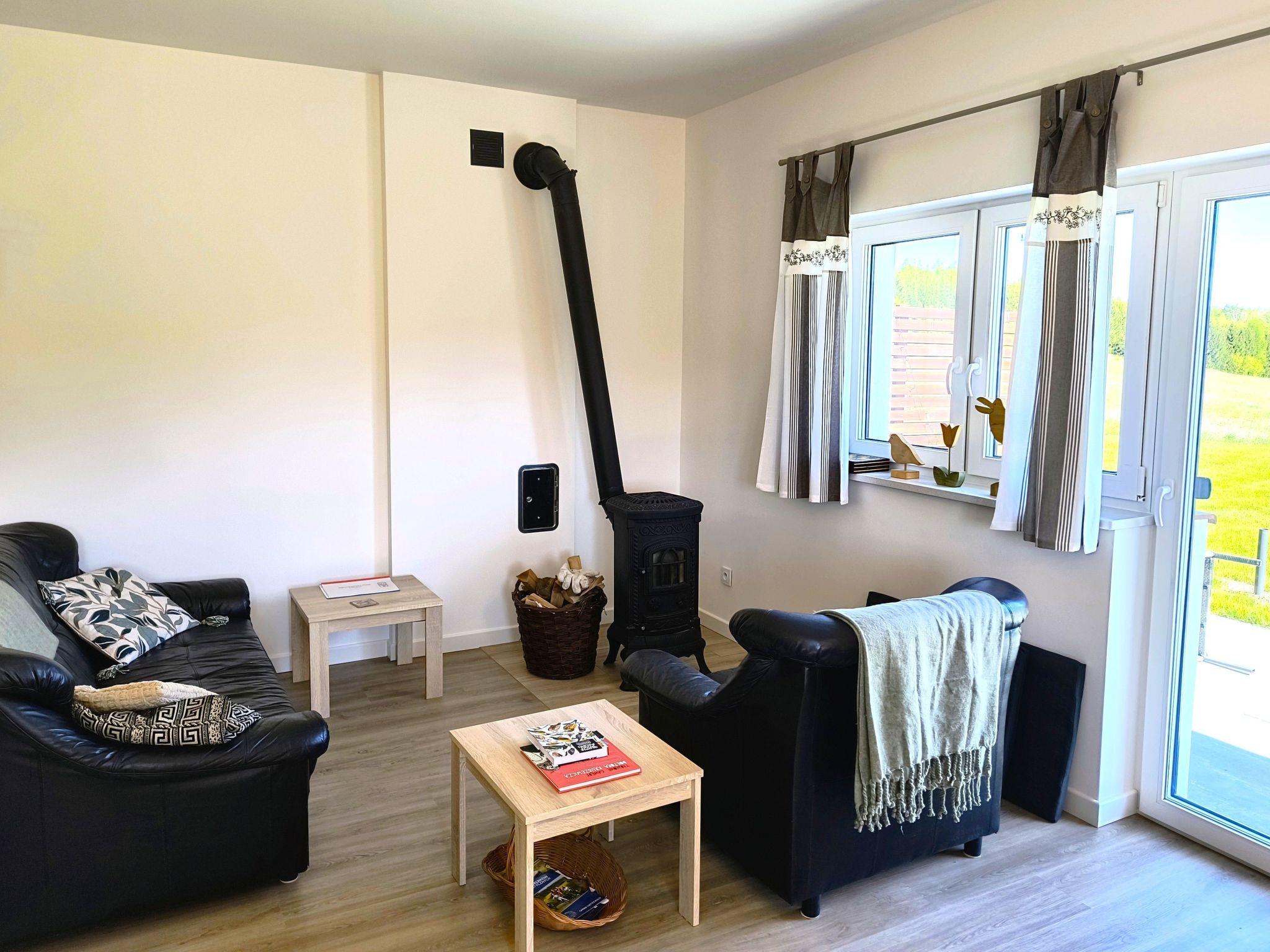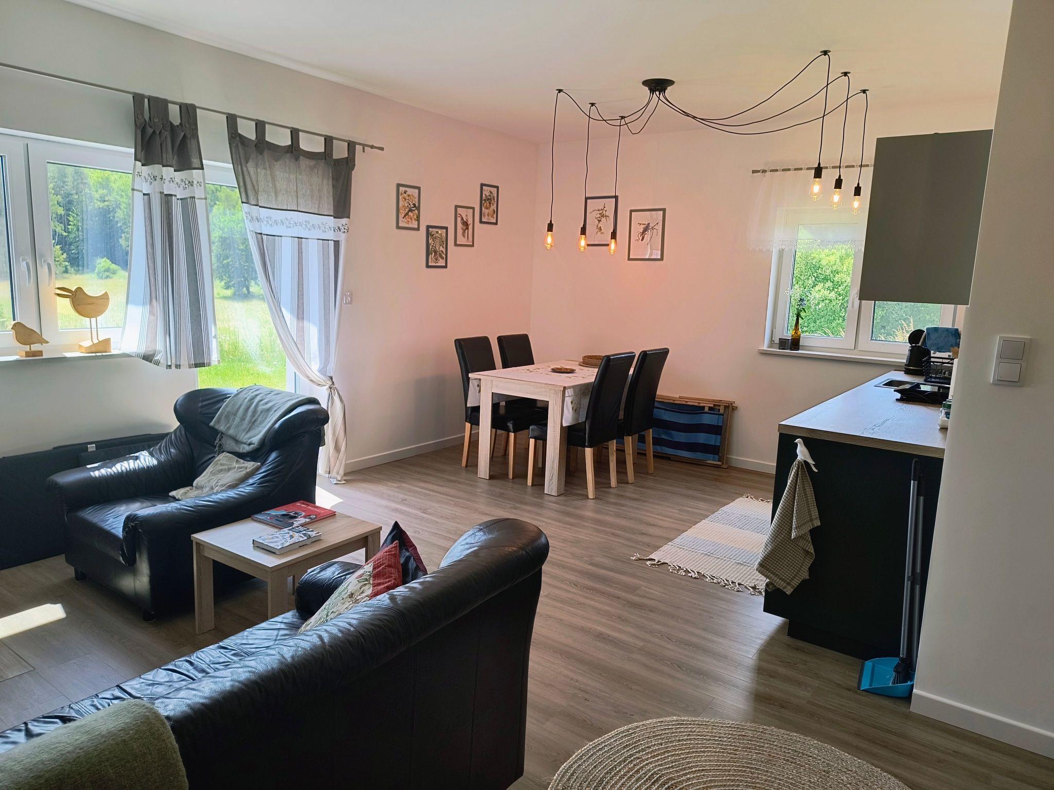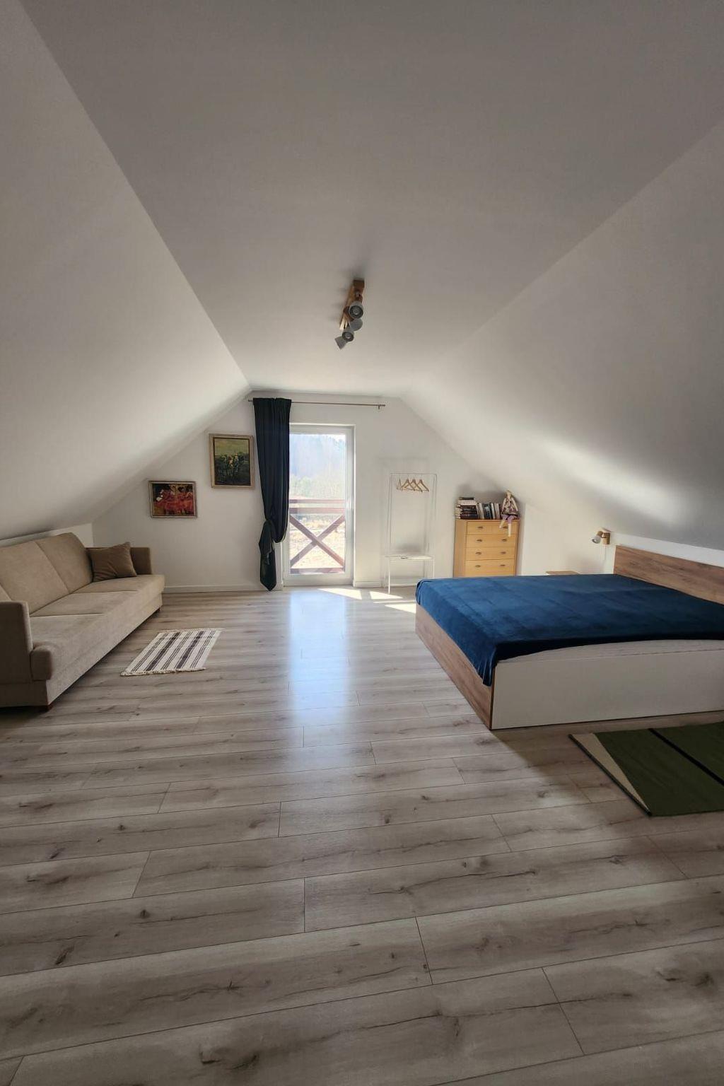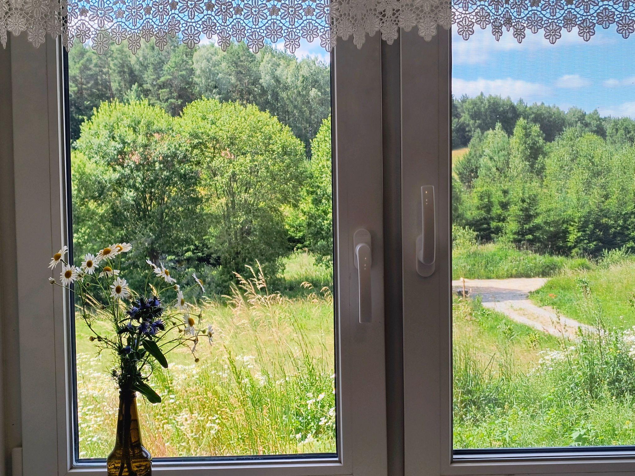 Ptasi Zakatek is a peaceful place on the border of Warmia and Mazury. Here everyone can relax. The facility is located on a 7ha plot on the edge of Tomaryny village. Space, peace and closeness to nature are our main assets. The 75m2 holiday flat occupies half of the segment. The windows and terrace overlook the forest and the floodplain. From morning to evening you can watch the visiting birds (cranes, storks, brambles, swallows, sometimes eagles) and the animals that appear on the plot (roe deer, deer, foxes, hares) On the ground floor there is a kitchenette with an eating area, a seating area around the fireplace/goat and a bathroom . The bedroom, furnished with a double bed and a sofa bed, has been arranged on the first floor (access via stairs). There are books and board games in the flat, and bicycles are available for those who wish to use them.