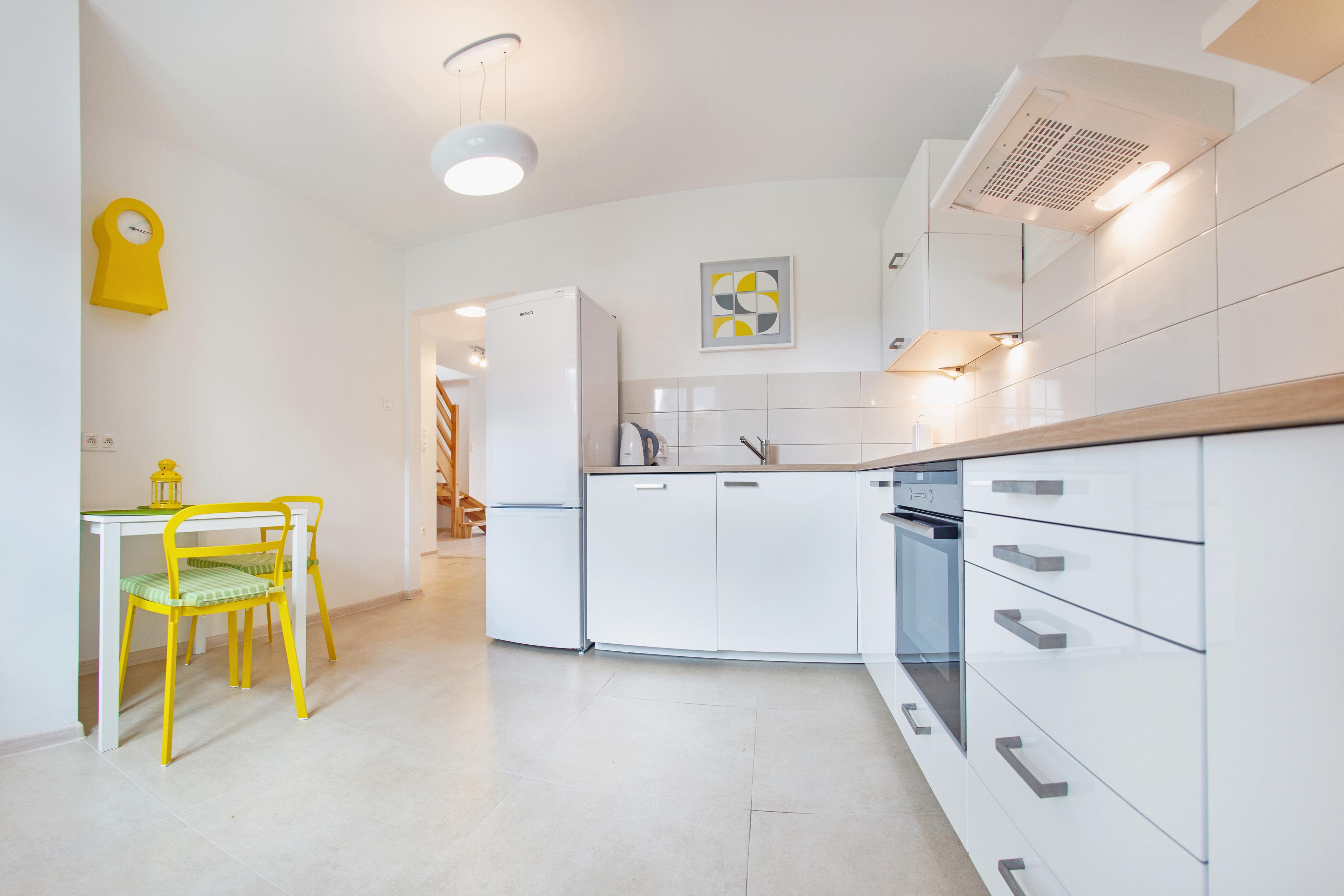 Jede Wohnung verfügt über eine voll ausgestattete Küchenzeile und einen Kamin (Holz wird nicht gestellt).