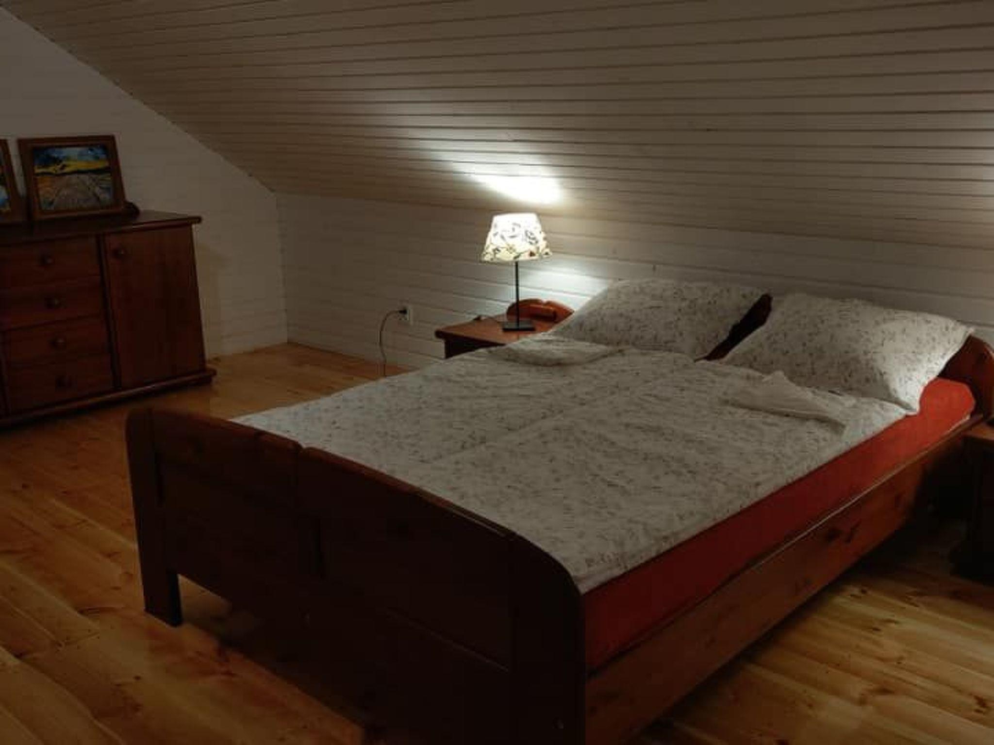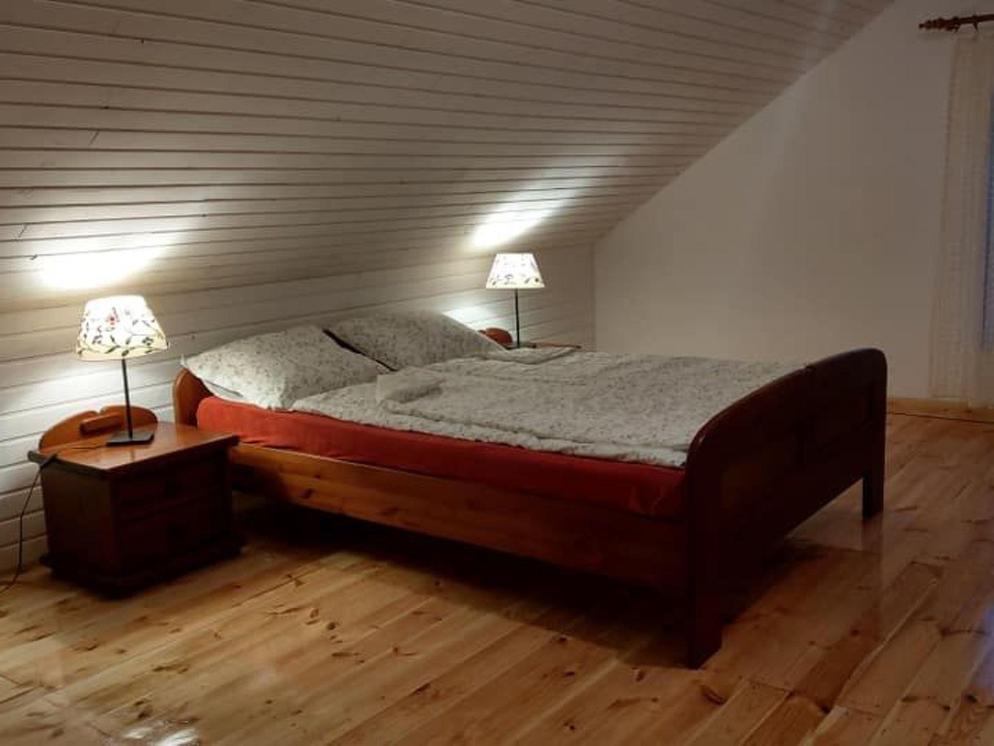 The house consists of a sleeping area in the high attic (two bedrooms: 4 x single bed + 2 x double bed + cot) and a living area on the ground floor (large living room, smaller room, kitchen, WC, bathroom with shower).