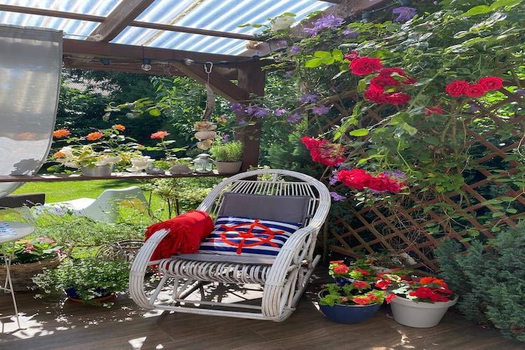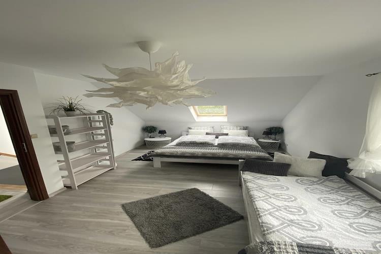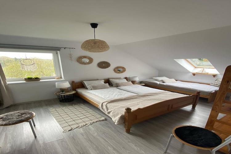 Stueetage: (Stue(Fjernsyn(Tyske TV-kanaler), spisebord, pejs, sofahjørne), åbent køkken(elkedel, cooker, brødrister, emhætte, espressomaskine, ovn, mikrobølgeovn, opvaskemaskine , køle-fryseskab, Blender, elektriske kogeplader), soveværelse(dobbeltseng), badeværelse(badekar, håndvask, toilet), veranda) På 1. etage: (soveværelse(enkeltseng, dobbeltseng), soveværelse(enkeltseng, dobbeltseng), badeværelse(bruser, håndvask, toilet), badeværelse(bruser, håndvask, toilet)) Internetadgang, have(privat, indhegnet, anlagt have, 600 m2), havemøbler, solstole, grill, parkering, Parasol, legeredskaber, bordtennisbord, hængekøje