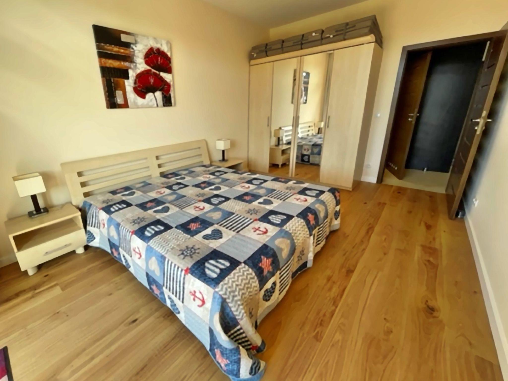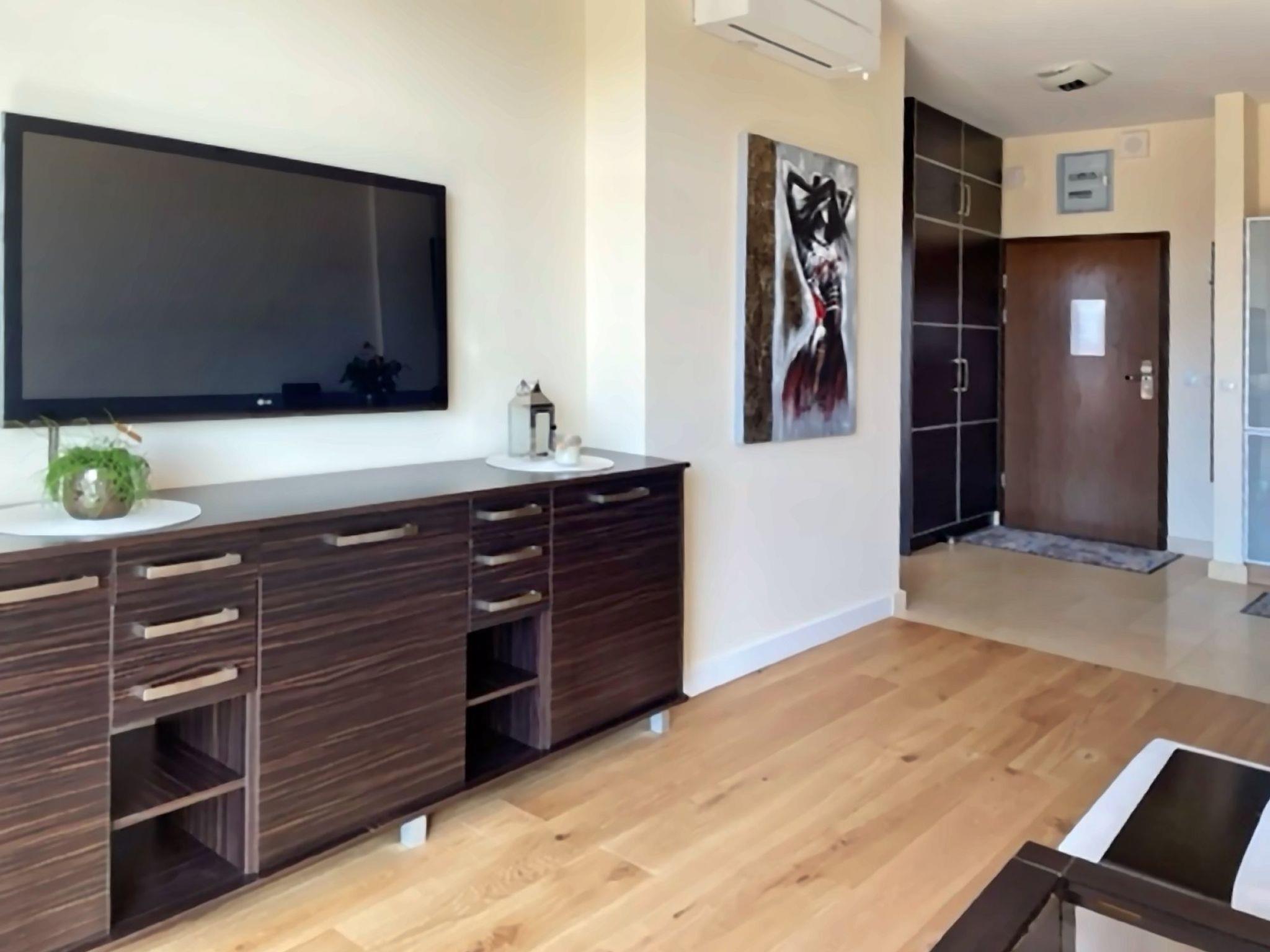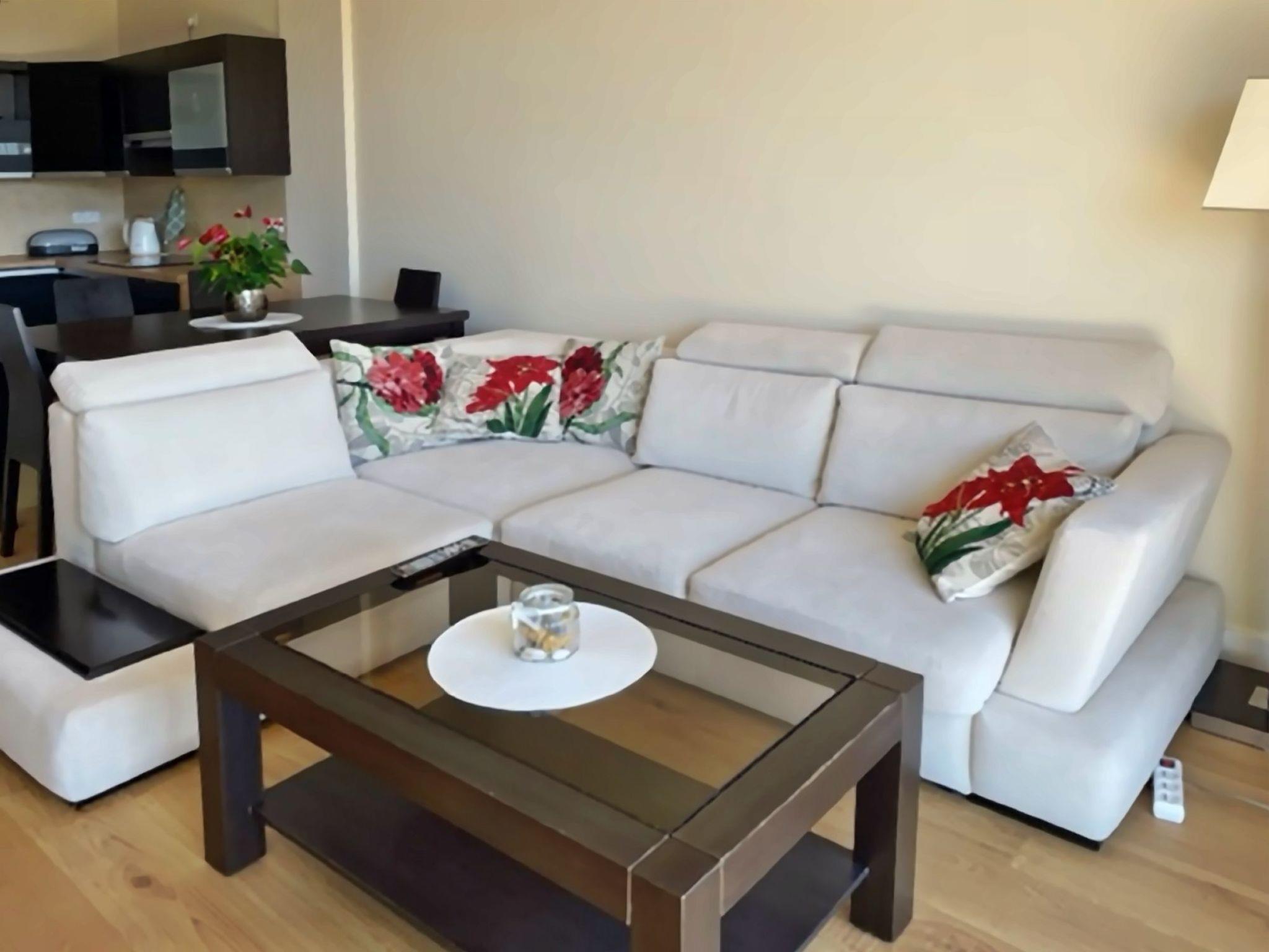 A living room with a large 2-seater sofa bed (160cmx200cm), LED TV (50"), a low coffee table; in the living room there is a dining area with a table and 4 chairs;A kitchenette equipped with a ceramic hob, oven, fridge, dishwasher, toaster, Tchibo pressure coffee machine (15bar), tableware, pots, cutlery etc.;A bedroom with a large double bed (180cmx200cm) with a set of professional damask hotel linen, a large wardrobe;A bathroom with a shower cubicle, washbasin, toilet, hairdryer, cotton towels and washing machine;A large Terrace (16m2) with a table and 4 comfortable chairs; from the balcony, during periods when there are no leaves on the trees, there is a beautiful side view of the sea;In addition, the flat has beach equipment (sun loungers, screen), a laundry dryer, an iron and ironing board, as well as a safe;A great advantage of this flat is its own free parking space in the underground garage.