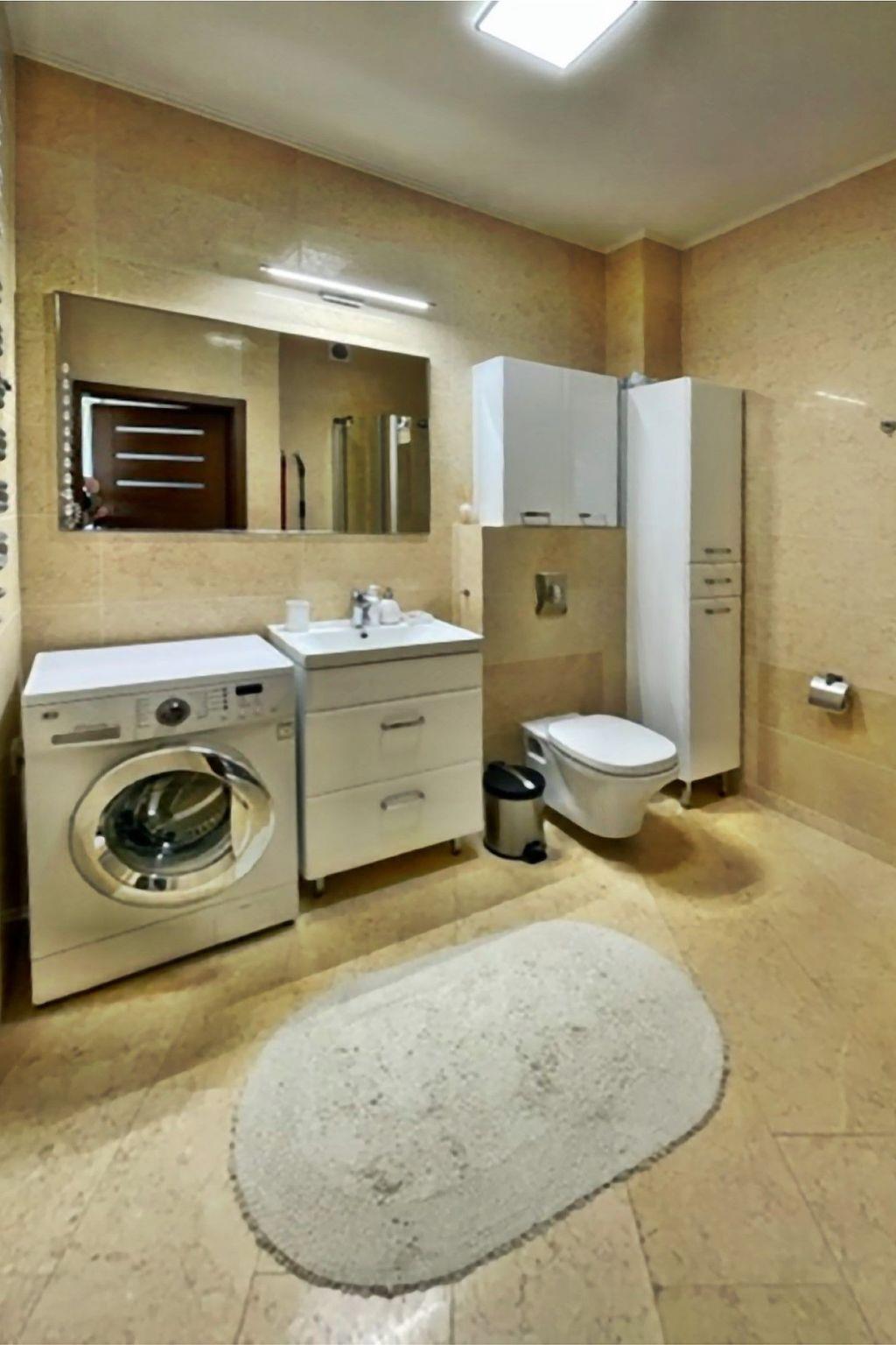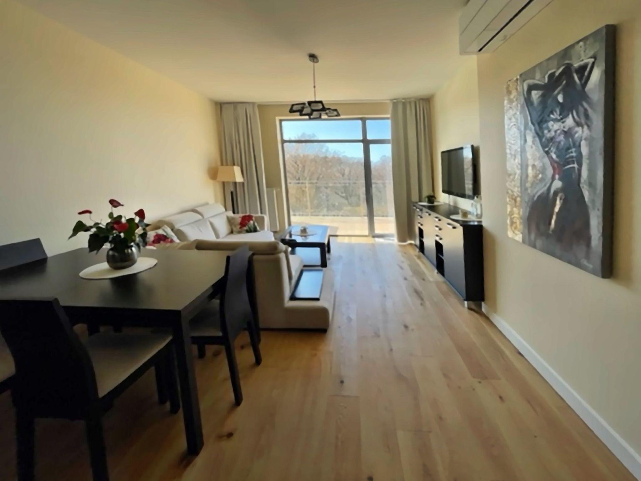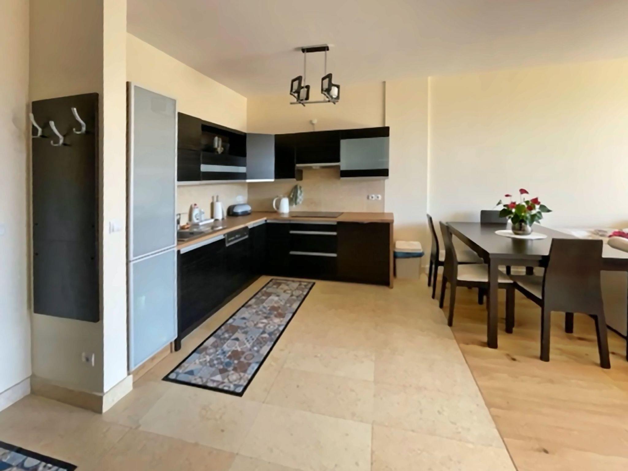 A living room with a large 2-seater sofa bed (160cmx200cm), LED TV (50"), a low coffee table; in the living room there is a dining area with a table and 4 chairs;A kitchenette equipped with a ceramic hob, oven, fridge, dishwasher, toaster, Tchibo pressure coffee machine (15bar), tableware, pots, cutlery etc.;A bedroom with a large double bed (180cmx200cm) with a set of professional damask hotel linen, a large wardrobe;A bathroom with a shower cubicle, washbasin, toilet, hairdryer, cotton towels and washing machine;A large Terrace (16m2) with a table and 4 comfortable chairs; from the balcony, during periods when there are no leaves on the trees, there is a beautiful side view of the sea;In addition, the flat has beach equipment (sun loungers, screen), a laundry dryer, an iron and ironing board, as well as a safe;A great advantage of this flat is its own free parking space in the underground garage.