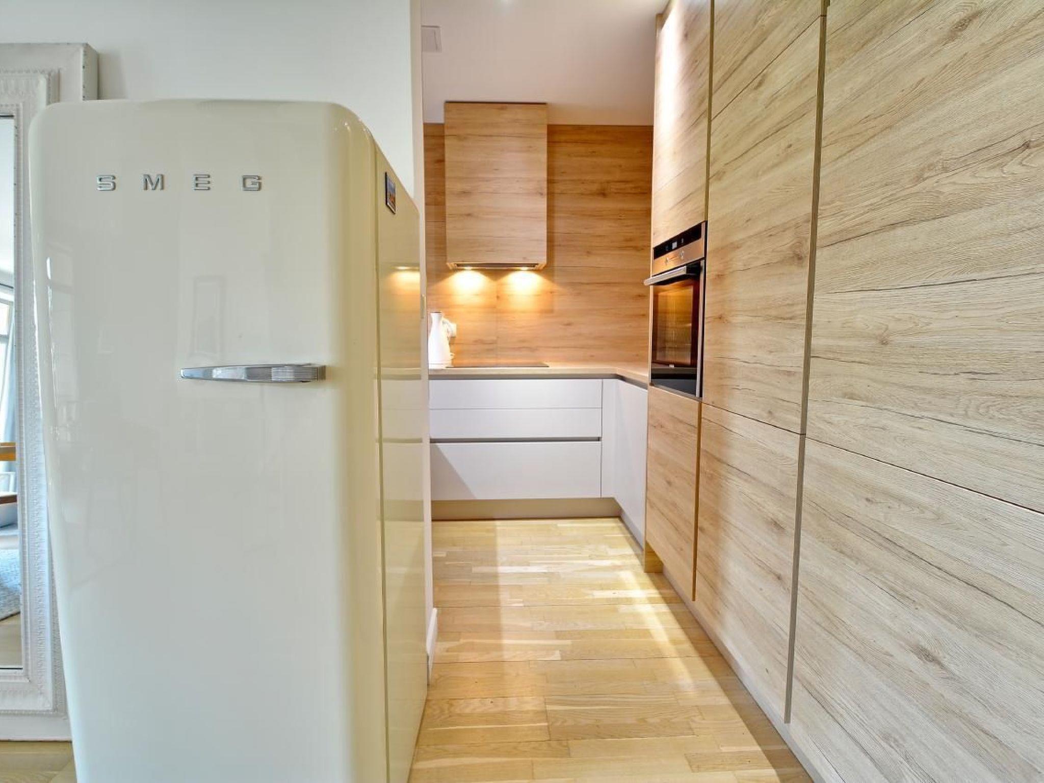 - Dining room connected to the living room, which has a large oak table with chairs for 8 people, a huge standing mirror and a stylish large refrigerator by SMEG