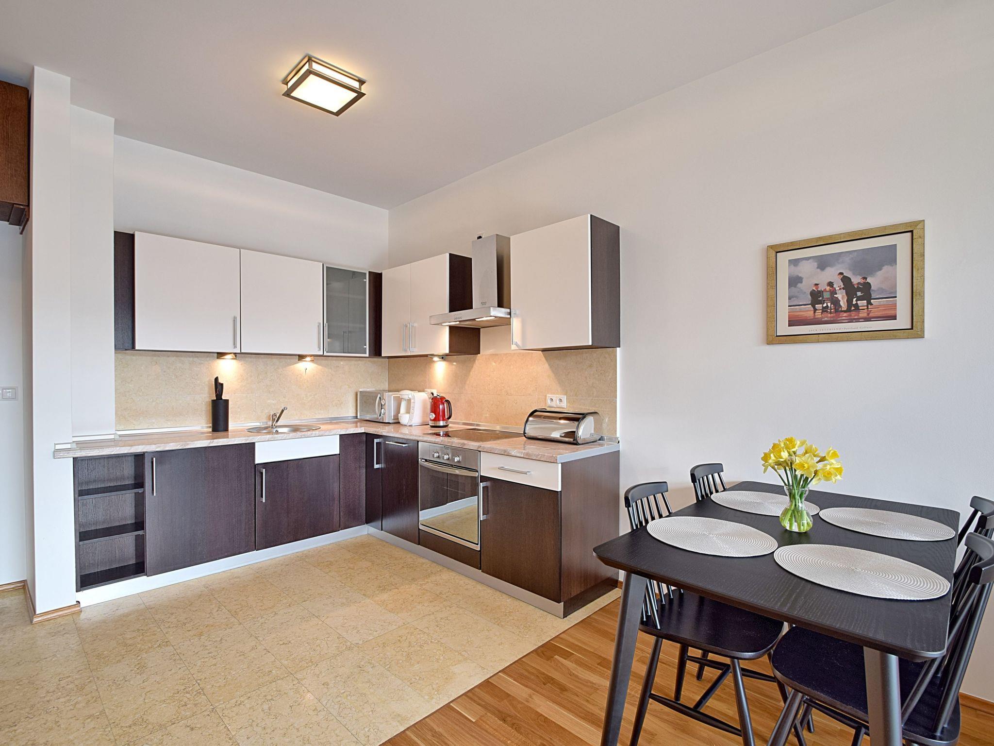 - Kitchenette equipped with ceramic hob, oven, fridge, dishwasher, microwave, toaster, Tchibo pressure coffee maker (15bar), tableware, pots, cutlery etc.;