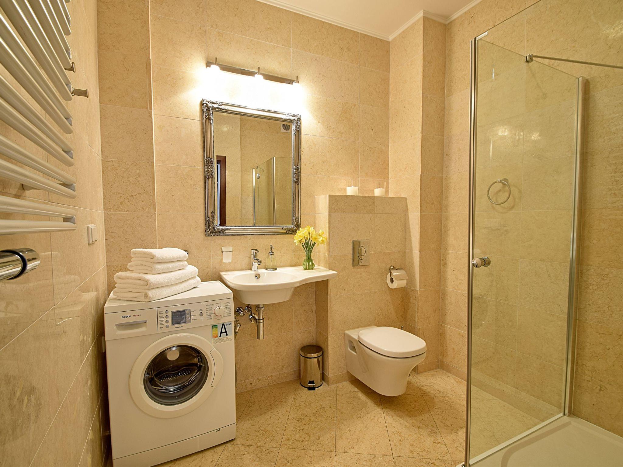 - Bathroom with shower, washbasin, toilet, hairdryer, cotton towels and washing machine;