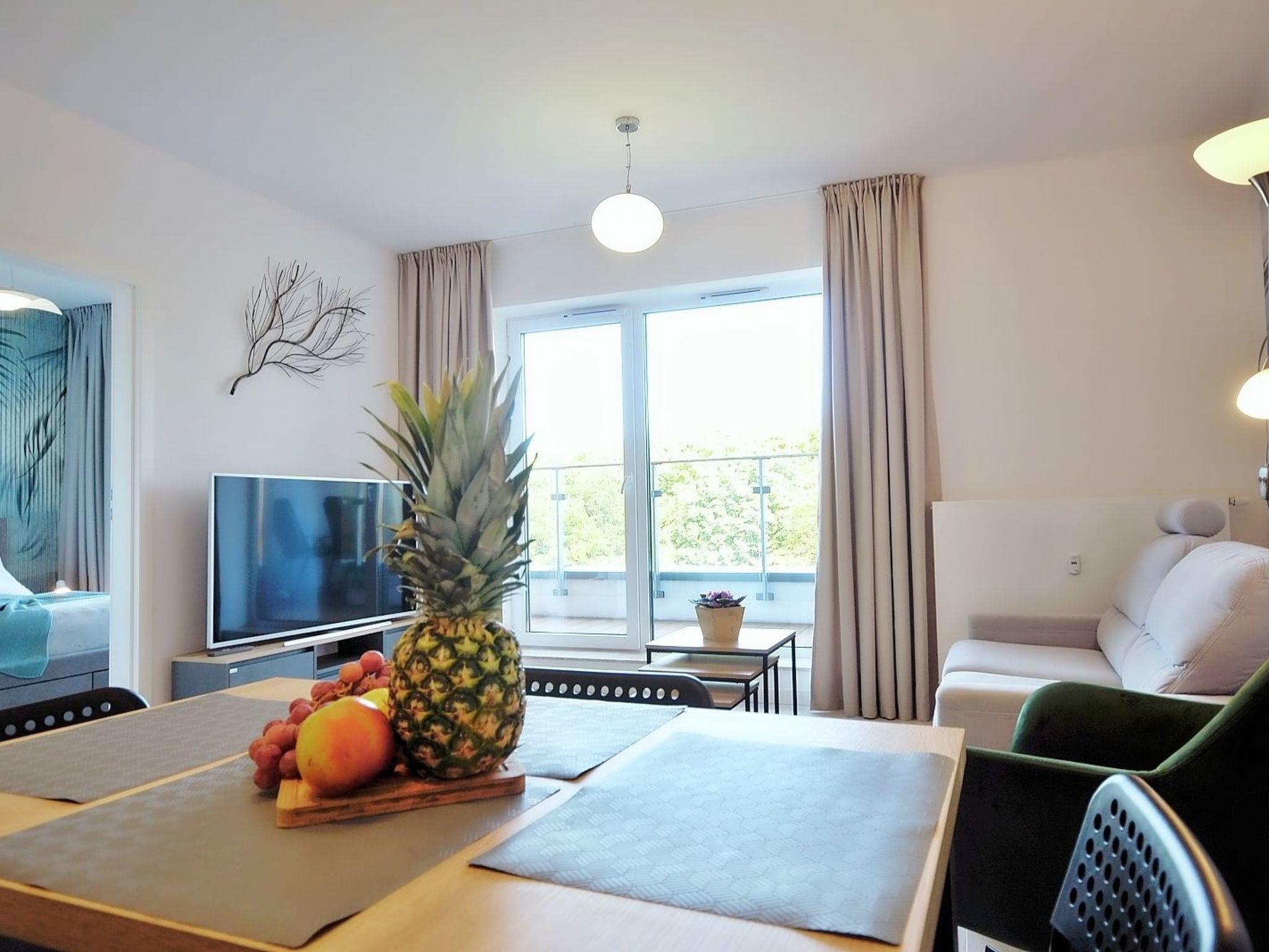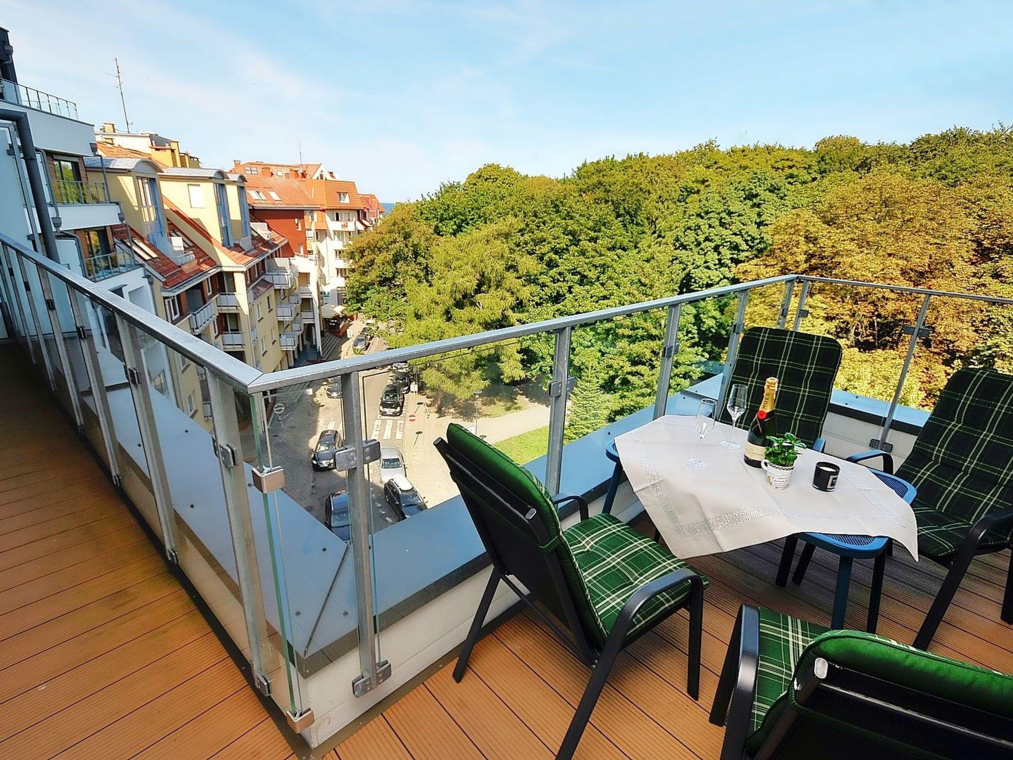 The seaside complex in which the flat is located offers extensive recreational facilities. Guests can enjoy both the indoor pool, jacuzzi, sauna, well-equipped gym and outdoor activities such as the infinity pool and children's paddling pool. The complex is surrounded by beautiful terraces overlooking the harbour and seaside park, providing space to relax and enjoy the picturesque scenery.