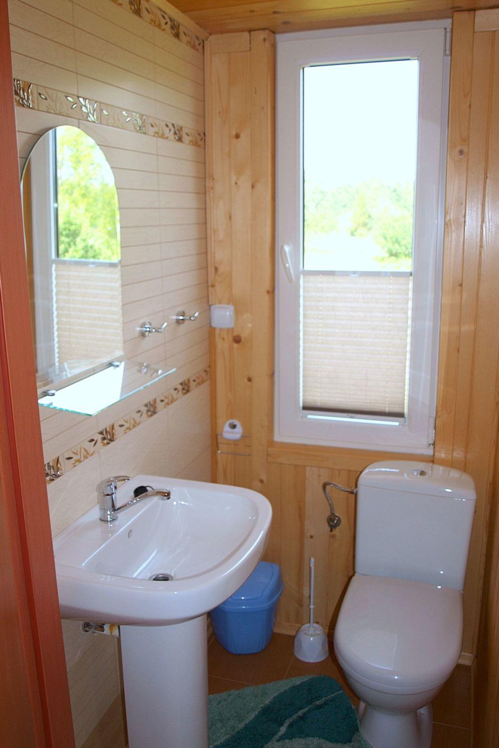 The interiors of the cottage are cosy and finished in wood, with comfortable wooden furniture creating the perfect environment for relaxation. The cottage is designed to comfortably accommodate up to seven people. There are bathrooms on both floors - on the ground floor with a shower, and on the ground floor with a toilet and washbasin. There are two bedrooms upstairs and a double bed on the ground floor, as well as a fully equipped kitchenette and a living room with a 32-inch TV, sofa and romantic fireplace.