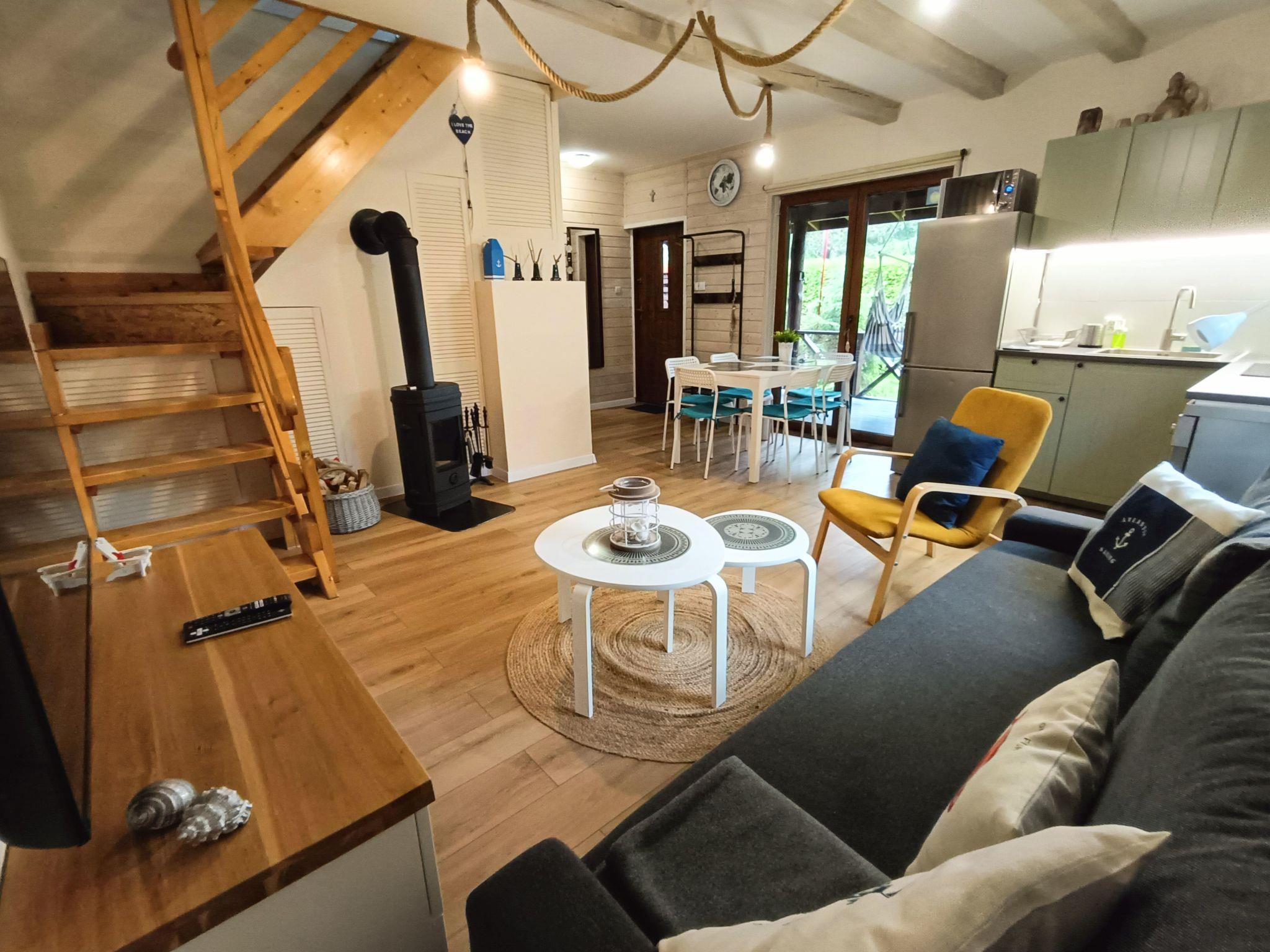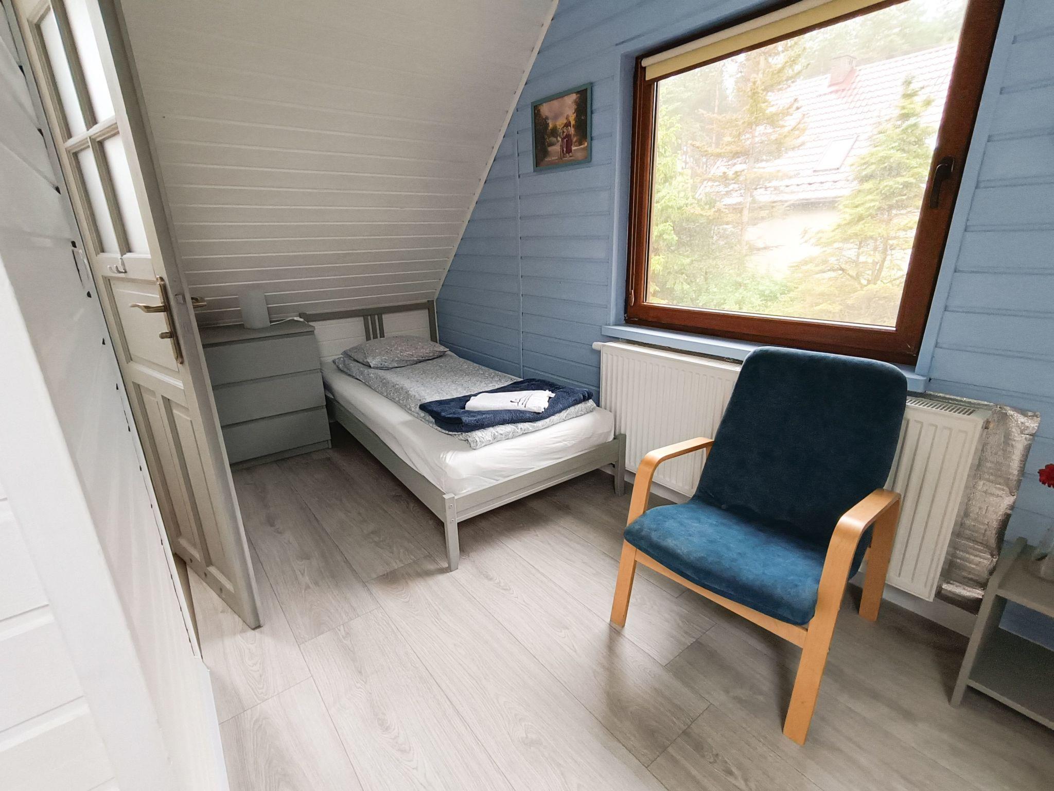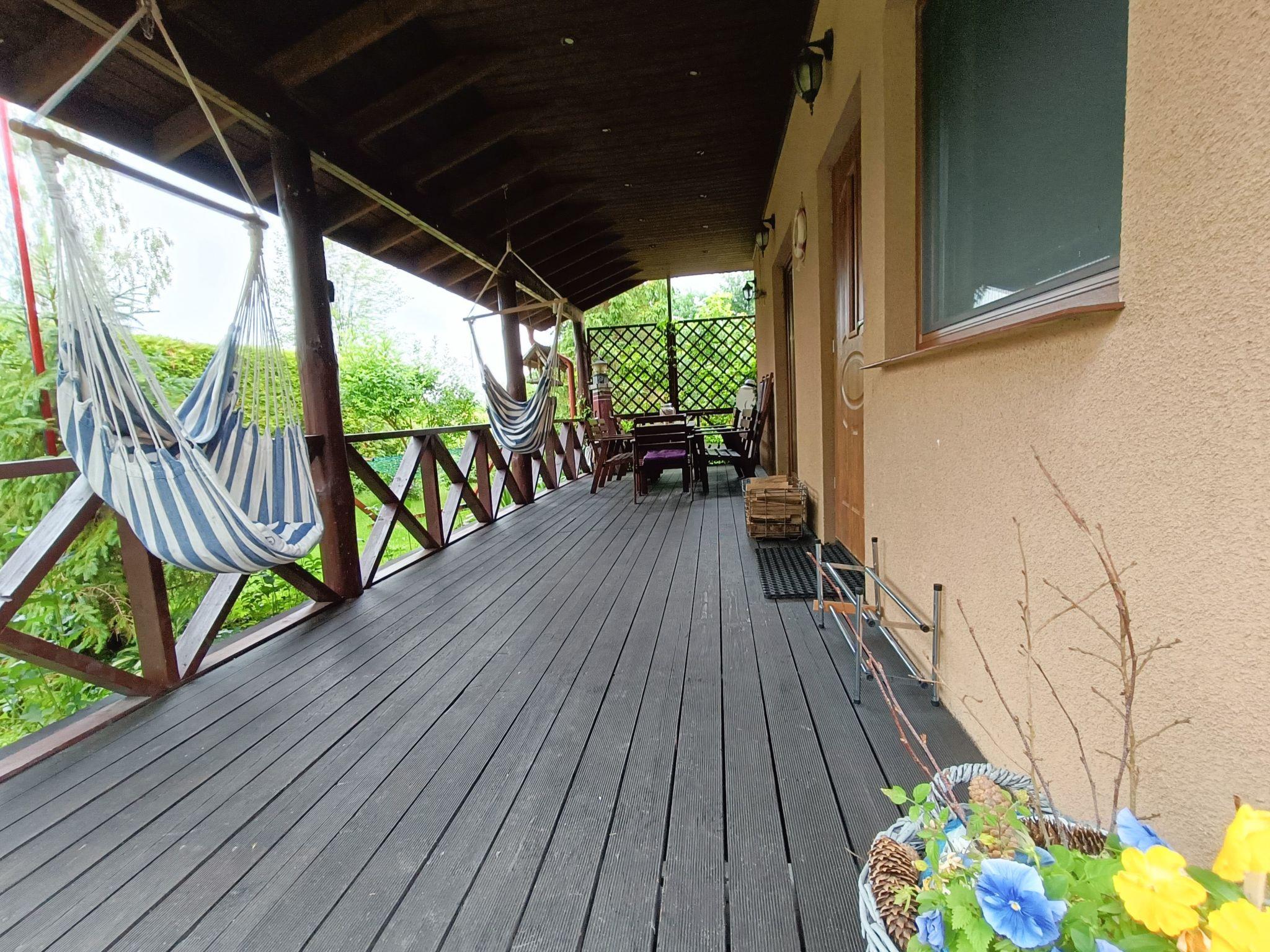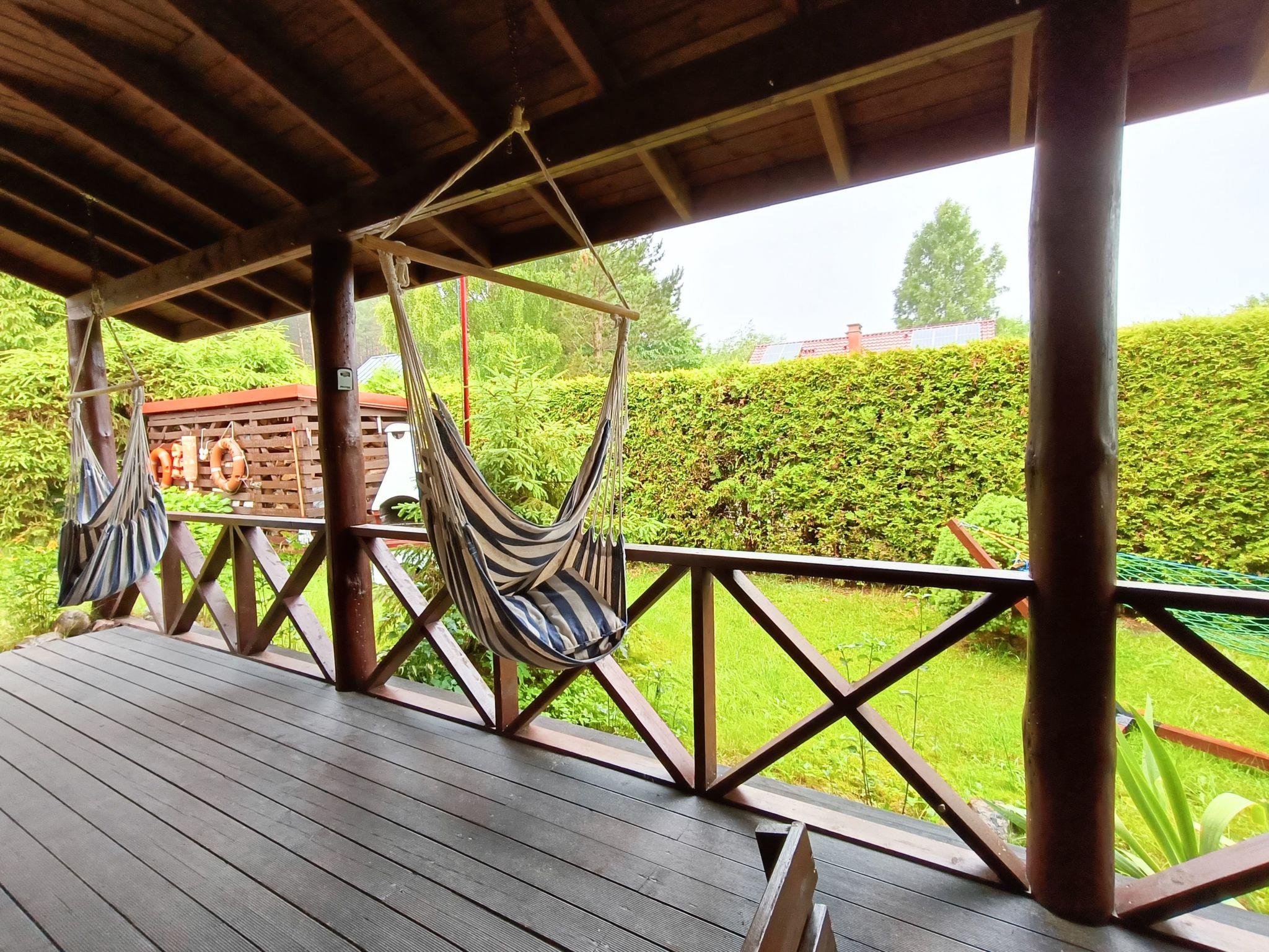 The proposed 4-bedroom, 4-bathroom house for rent in Kopalin of over ninety square metres has two en-suite bedrooms in the attic - one with a double bed and one single bed, and the other with two single beds. On the ground floor there is an additional bedroom with en-suite bathroom, a large living room with a fully equipped kitchenette (fridge, induction hob, dishwasher, microwave, coffee machine, pots and pans along with a set of crockery and cutlery) and a bathroom with washing machine. Each room and bathroom on the ground floor of the year-round house for rent has a window with a mosquito net in place. Romantic moments in the evenings are ensured by a wood-burning fireplace. In front of the house is a very large covered terrace with garden furniture. In front of the terrace there is a concrete barbecue and a hammock. This house was built in 2011 and the interior was renovated in 2023.