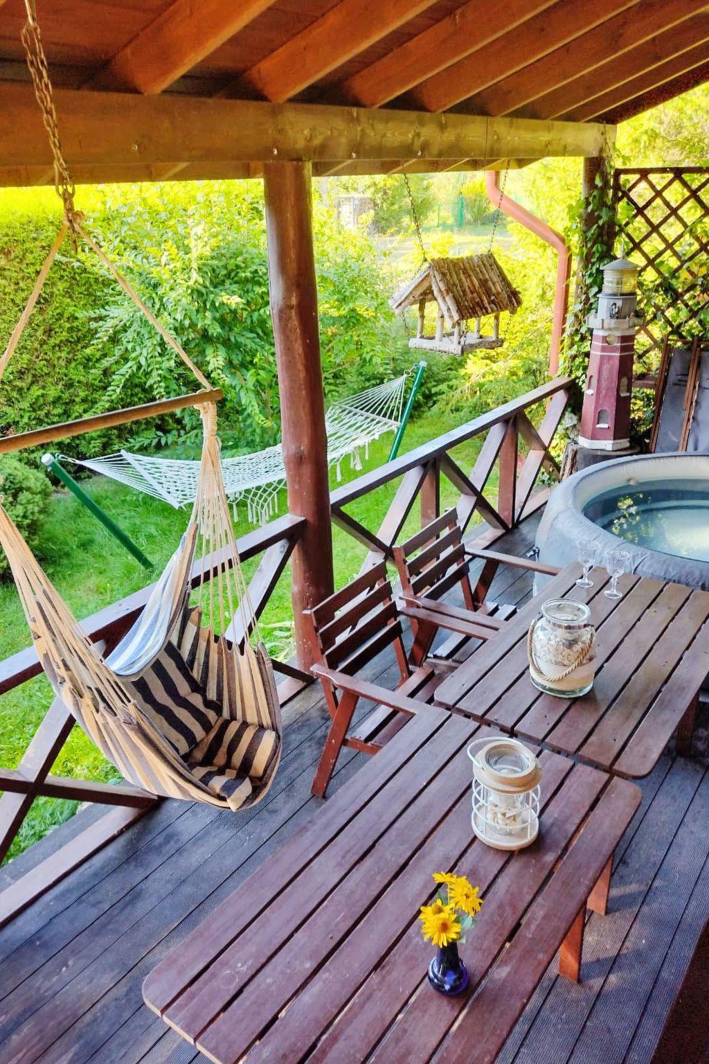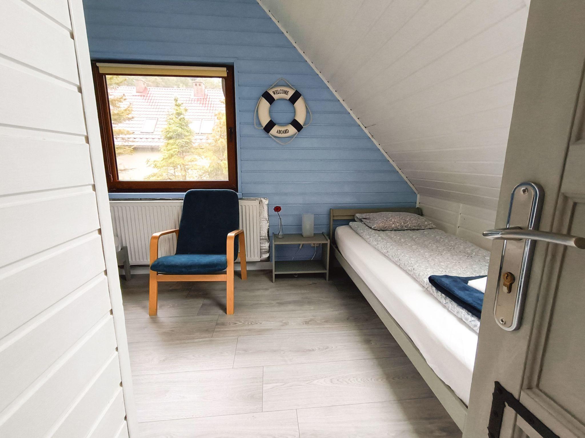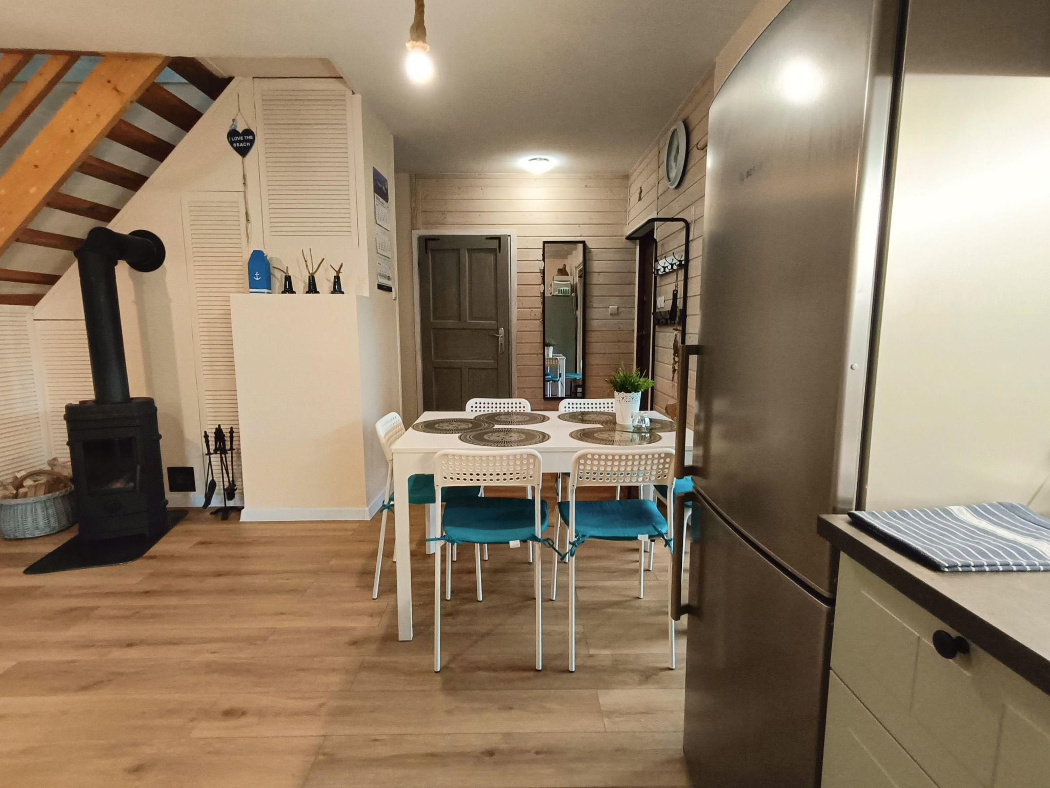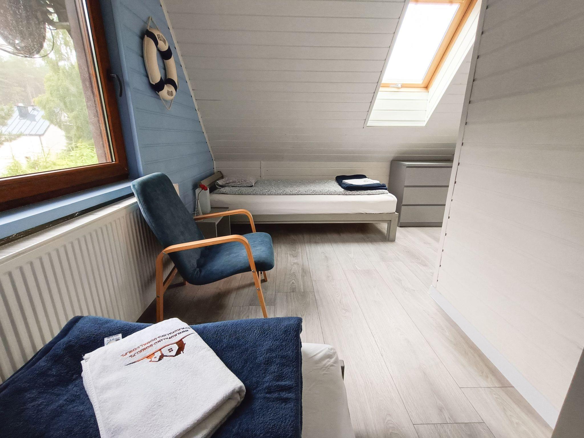 The proposed 4-bedroom, 4-bathroom house for rent in Kopalin of over ninety square metres has two en-suite bedrooms in the attic - one with a double bed and one single bed, and the other with two single beds. On the ground floor there is an additional bedroom with en-suite bathroom, a large living room with a fully equipped kitchenette (fridge, induction hob, dishwasher, microwave, coffee machine, pots and pans along with a set of crockery and cutlery) and a bathroom with washing machine. Each room and bathroom on the ground floor of the year-round house for rent has a window with a mosquito net in place. Romantic moments in the evenings are ensured by a wood-burning fireplace. In front of the house is a very large covered terrace with garden furniture. In front of the terrace there is a concrete barbecue and a hammock. This house was built in 2011 and the interior was renovated in 2023.