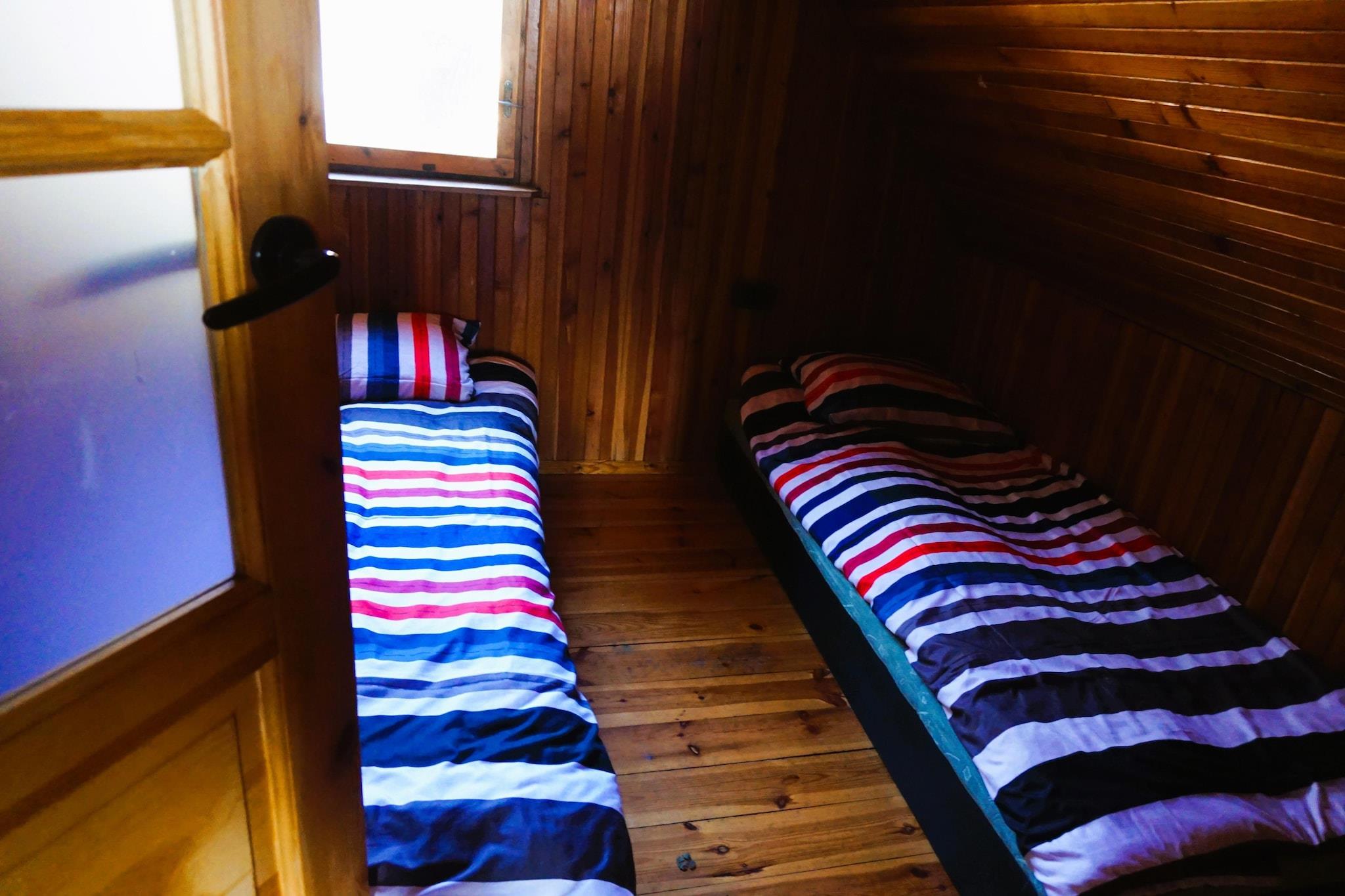 Stueetage: (åbent køkken(elkedel, cooker, komfur(Komfur med fire kogeplader, gas), køle-fryseskab), Stue/soveværelse(dobbeltsovesofa, dobbeltsovesofa, Fjernsyn, spisebord, sofahjørne), badeværelse(bruser, håndvask, toilet)) På 1. etage: (soveværelse(enkeltseng, enkeltseng), soveværelse(enkeltseng, dobbeltseng)) trampolin, legeredskaber, rutsjebane