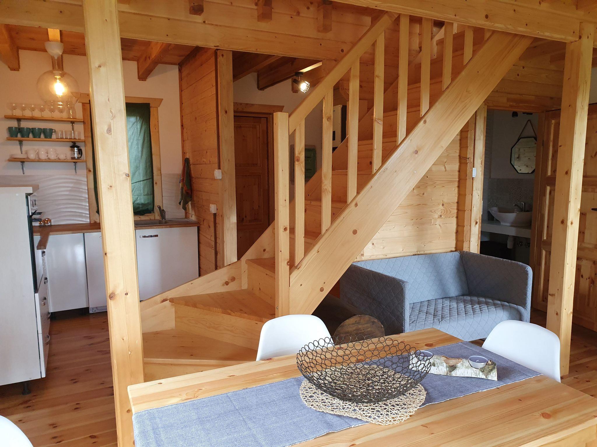 The house is wooden, has 80 metres, is single-storey with a usable attic. On the ground floor is the living area, which consists of a living room with dining area and kitchen. The kitchen is equipped with all necessary appliances such as dishwasher, oven, ceramic hob, coffee maker, all dishes and utensils necessary for preparing meals. The sofa in the living room has a fold-out bed for 2 persons. But in principle it is an alternative, because the night area is on the floor. From the living room there is an exit to the terrace. In addition, on the ground floor there is a hall and a bathroom with shower. On the first floor there are two bedrooms, one of which has a double bed (master bedroom) measuring 160 by 200 cm. The second bedroom is a 3-bedded room with 3 single beds, measuring 90 by 200 cm. We also have a baby cot. WIFI in the house and garden.