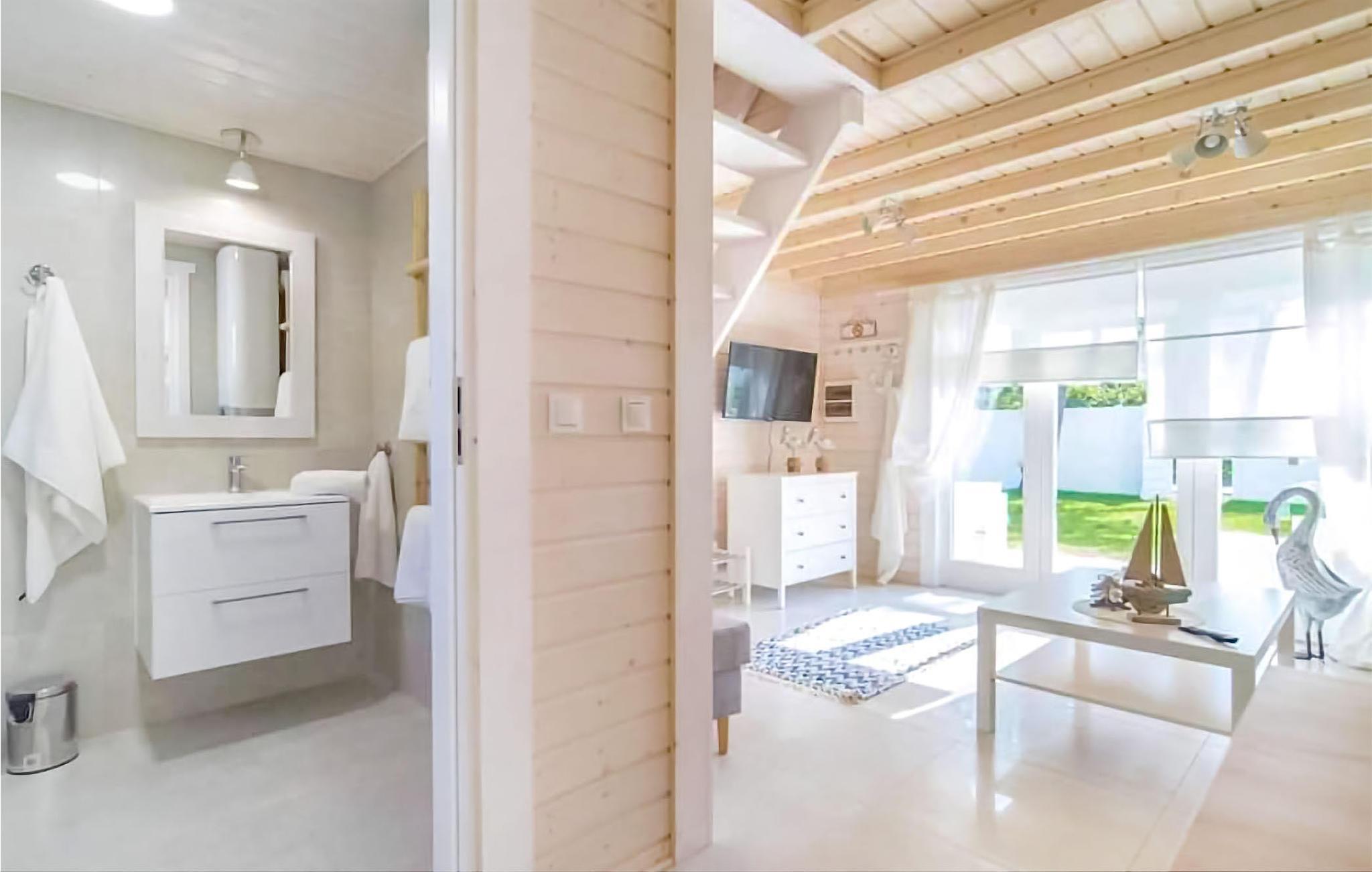 Velkommen til dette feriehus, som er praktisk indrettet, men meget hyggeligt takket være de stemningsfulde trævægge- og lofter. Nyd morgenmaden til de første solstråler på terrassen. Huset er del af en lille feriepark med en fælleshave med gynge og trampolin; her kan jeres børn lege og få nye venner. Sandstranden ligger kun 250 væk og indbyder til mange badeture og afslappede gåture. Øen byder foruden de dejlige strande på et roligt skovområde.