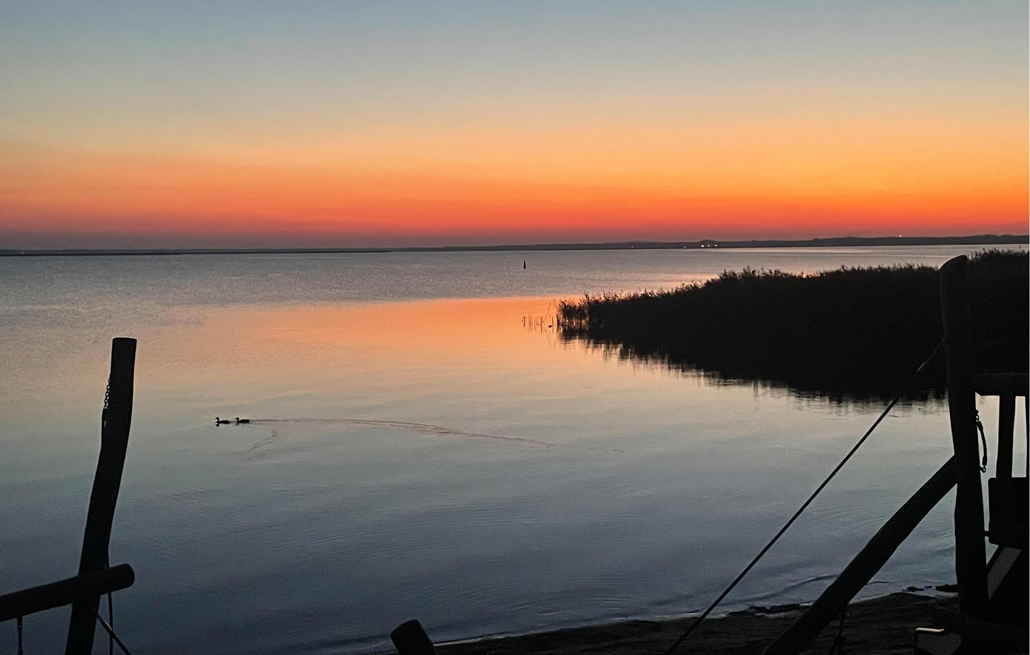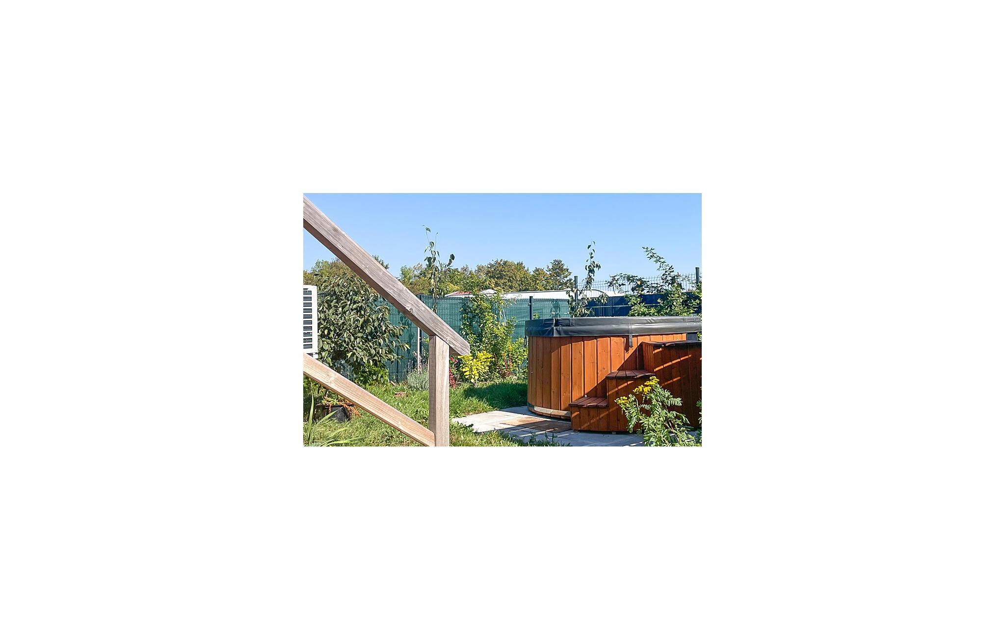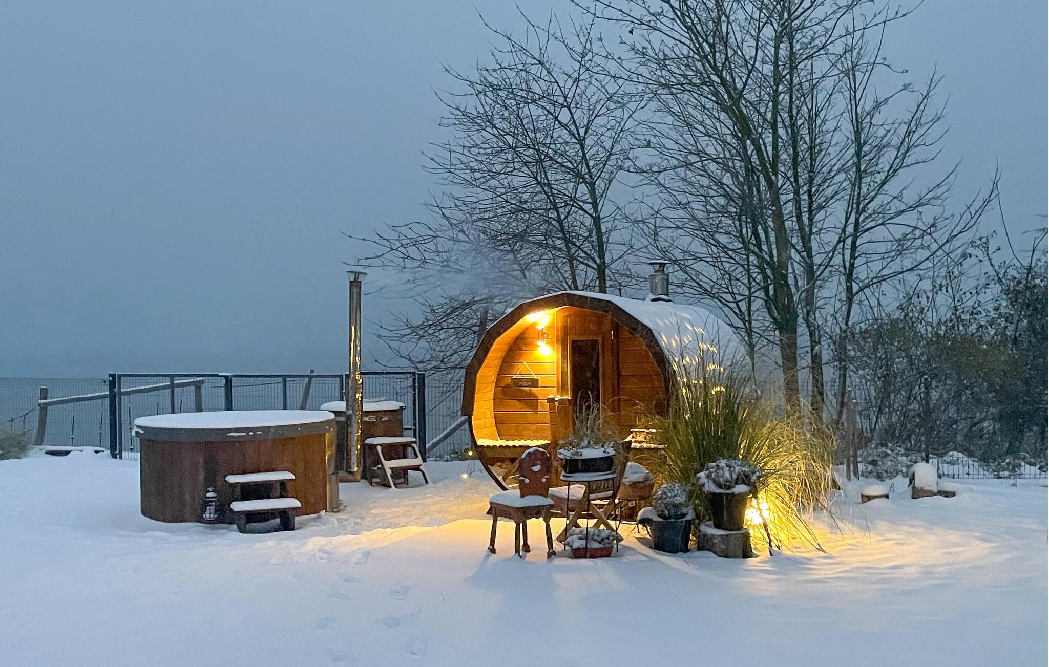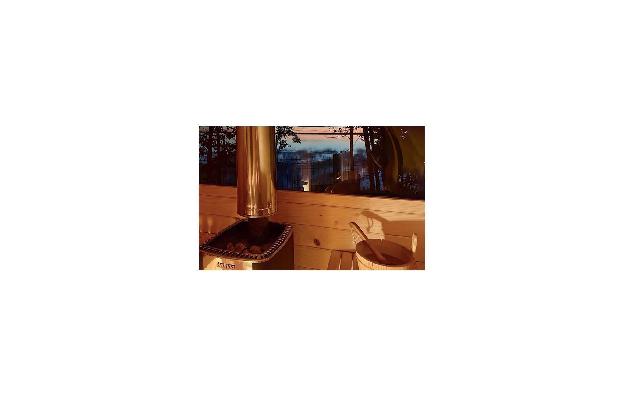 Udenfor venter en stor terrasse, hvor I kan nyde den friske luft eller afslutte dagen i vildmarksbadet og den fælles sauna med udsigt over søen. Den smukt anlagte have lover ren afslapning.