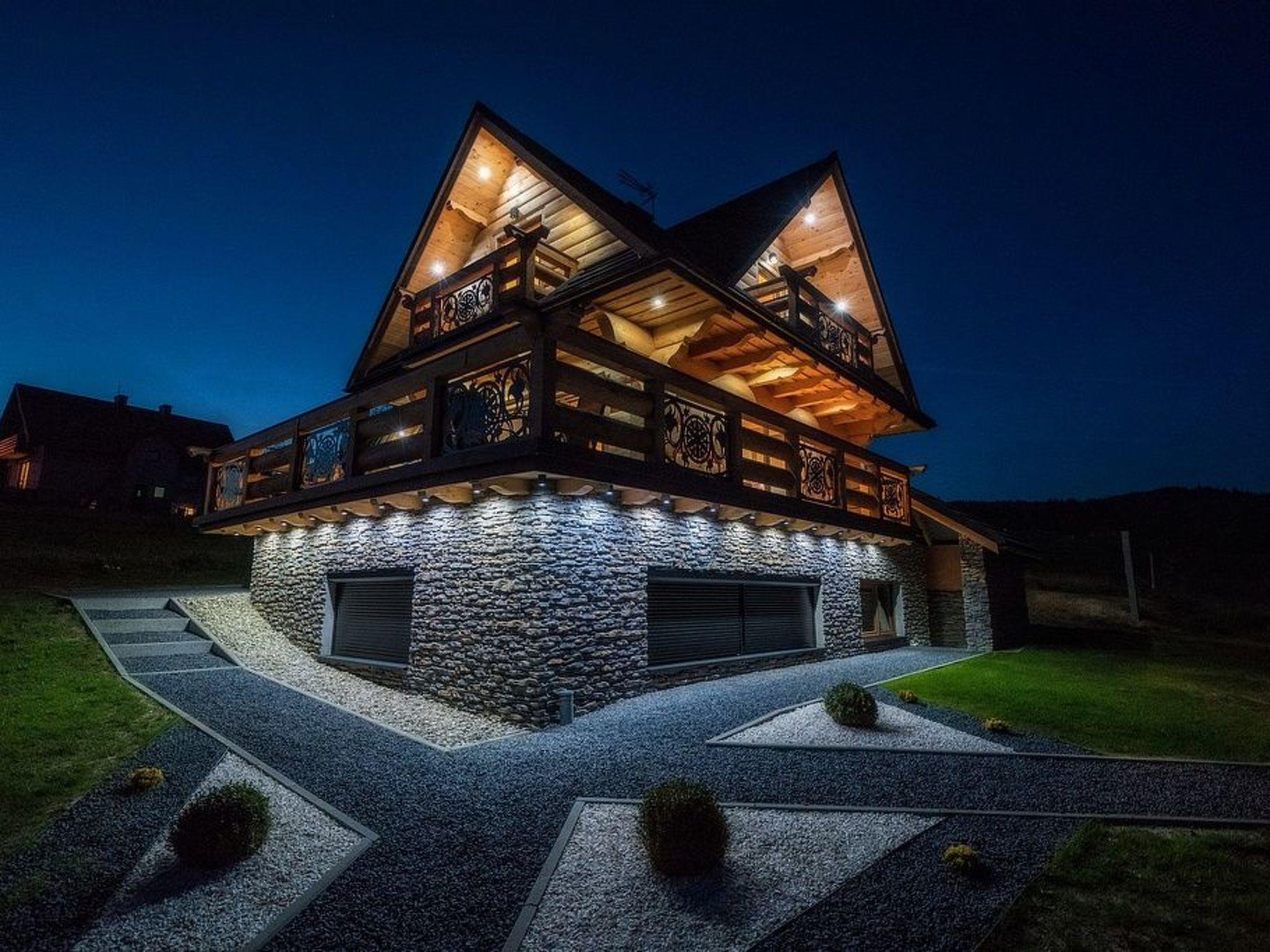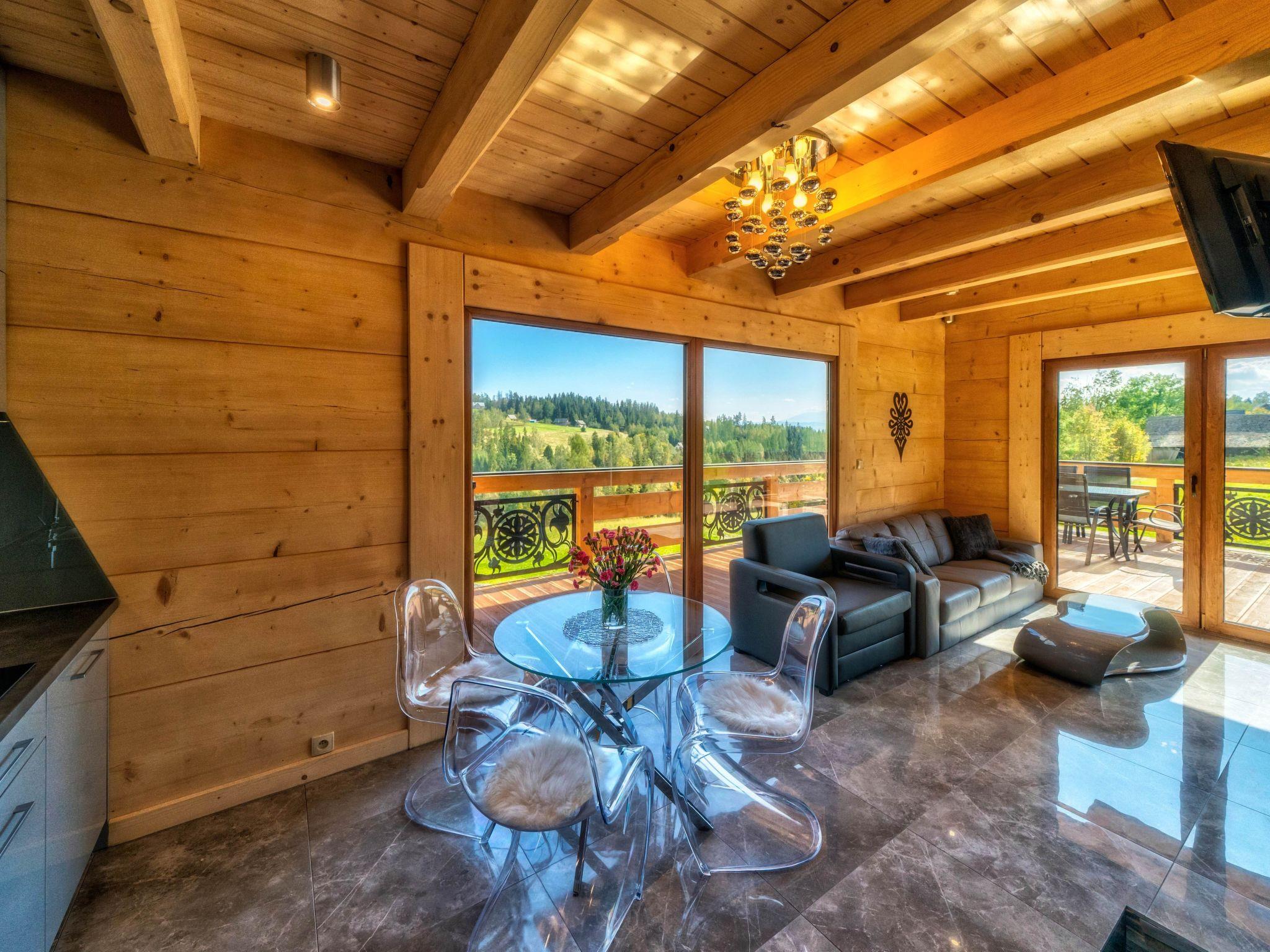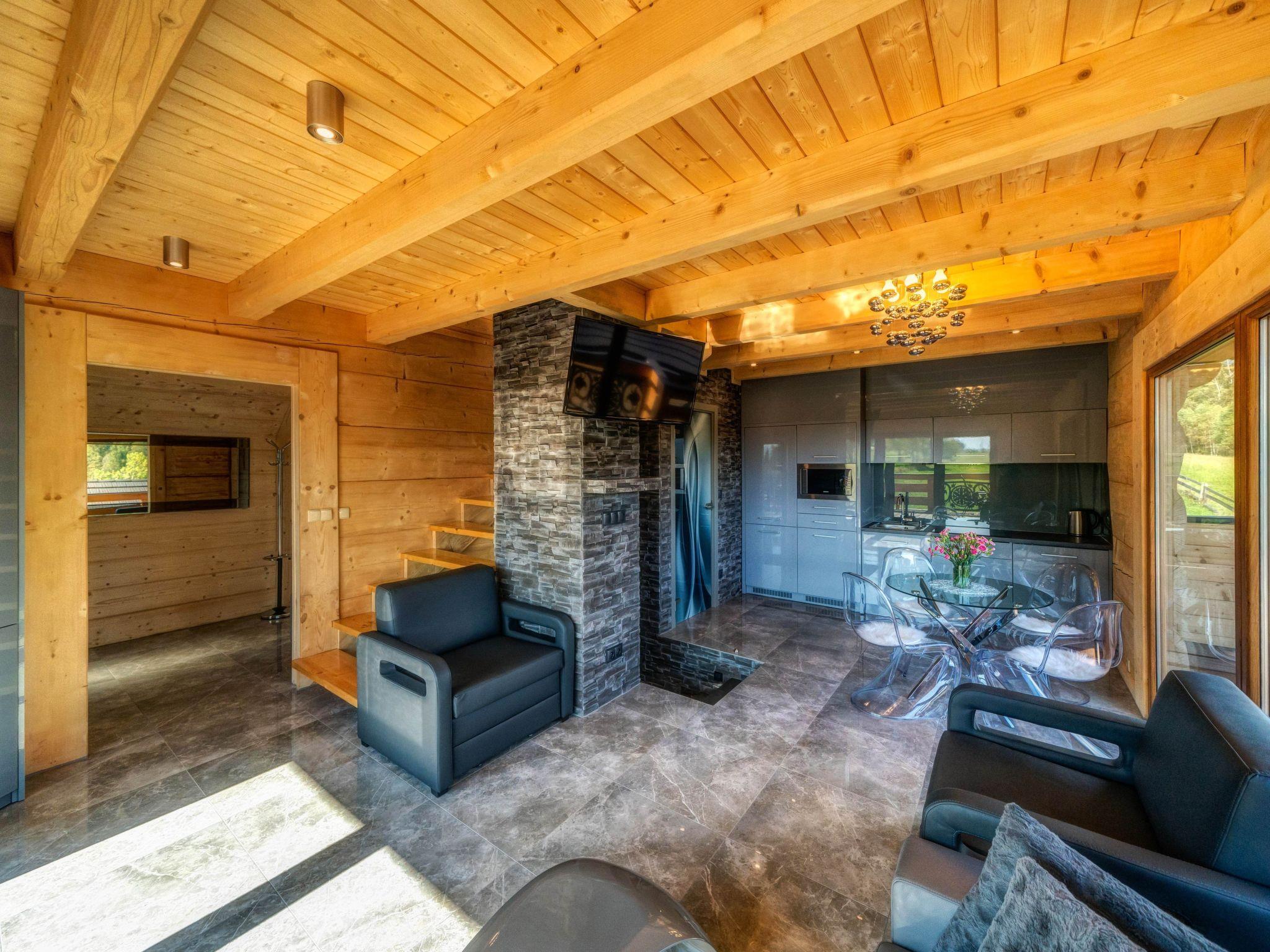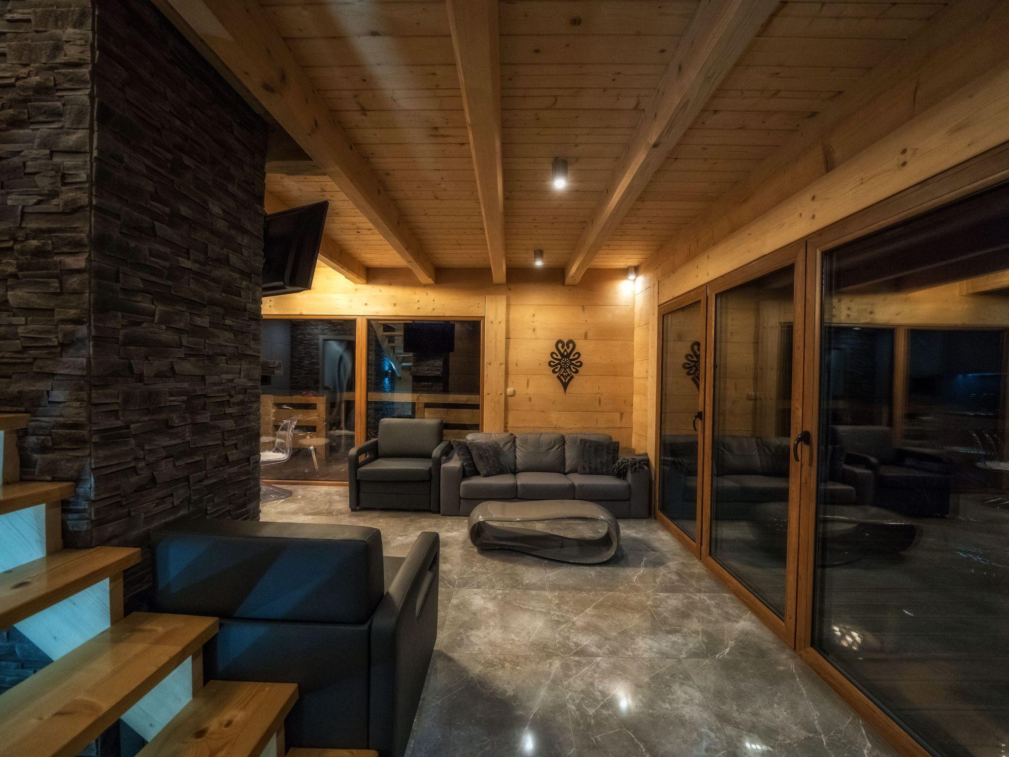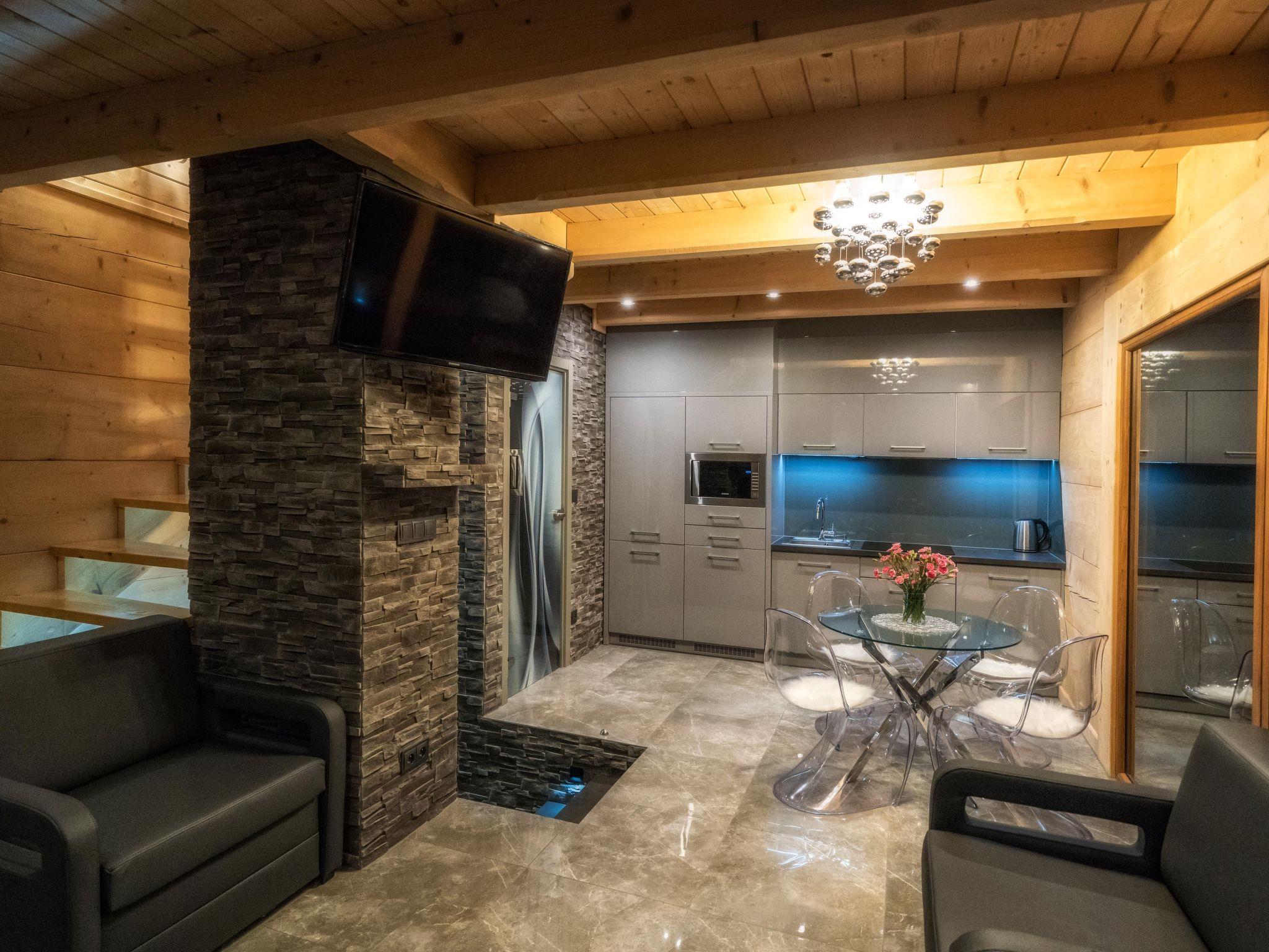 The cottage is designed in a traditional style, using natural materials of wood and stone. It has large windows that allow you to enjoy the view of the mountains. The interior of the cottage is decorated in an elegant, modern style with attention to every detail.