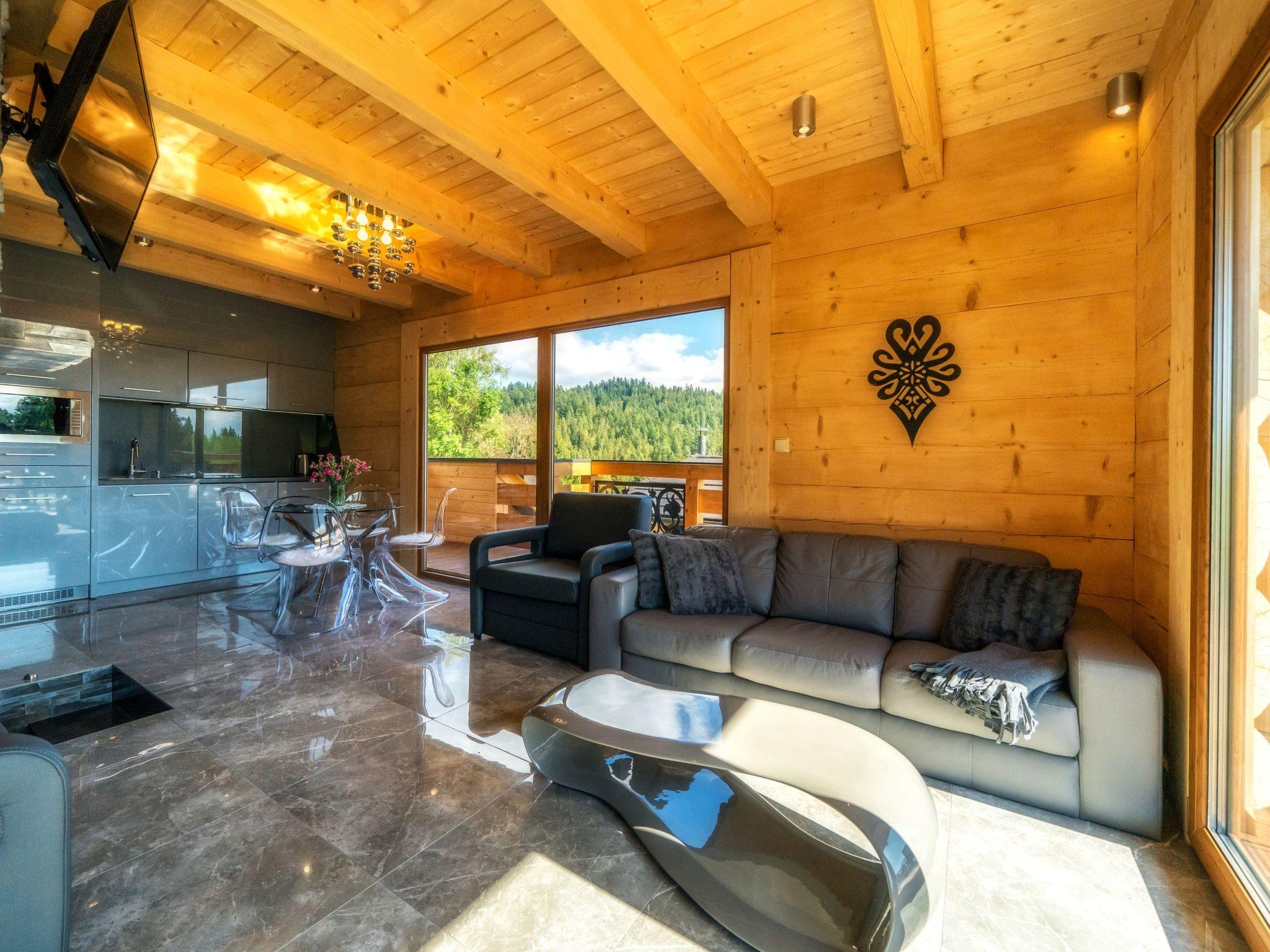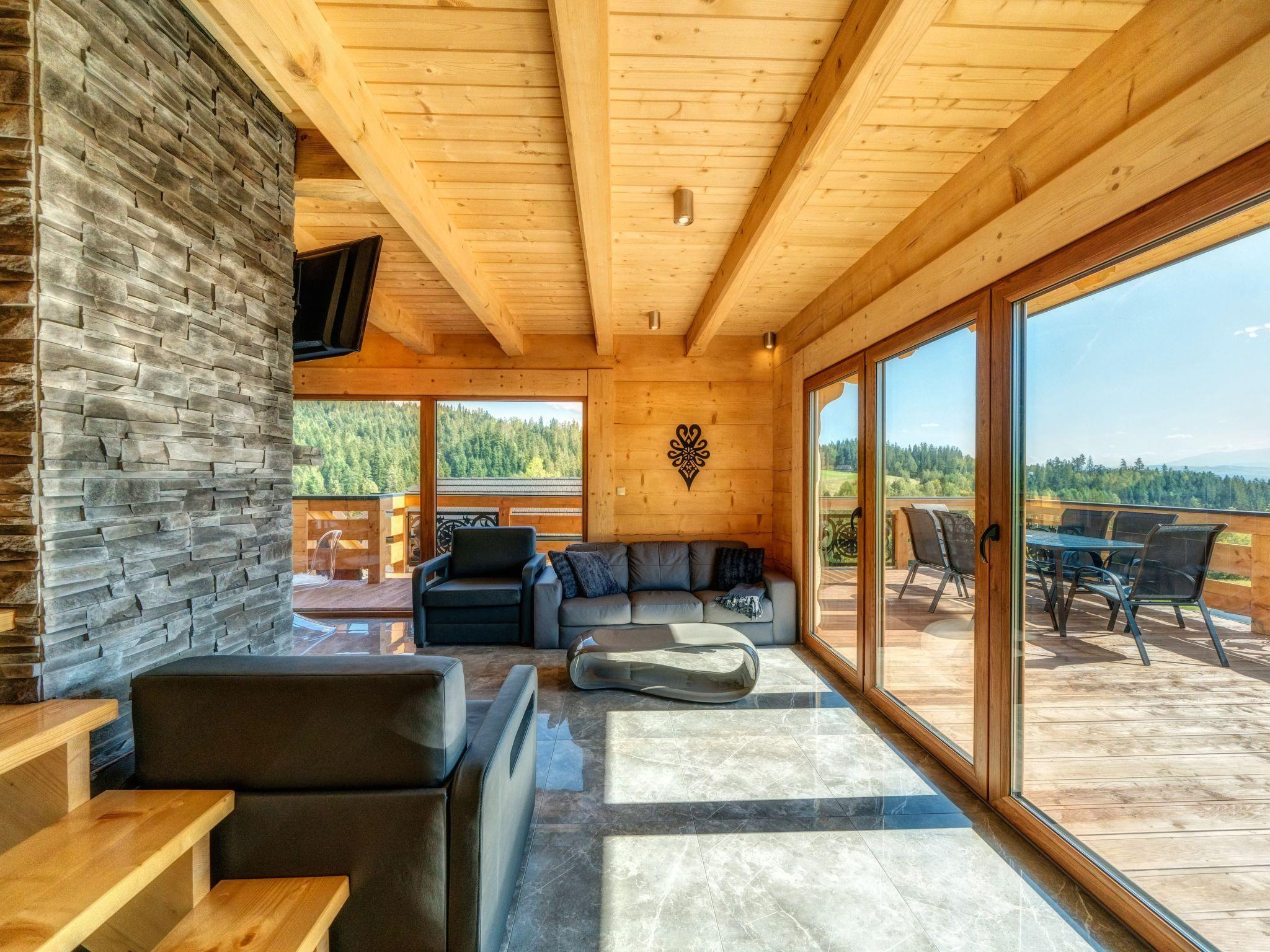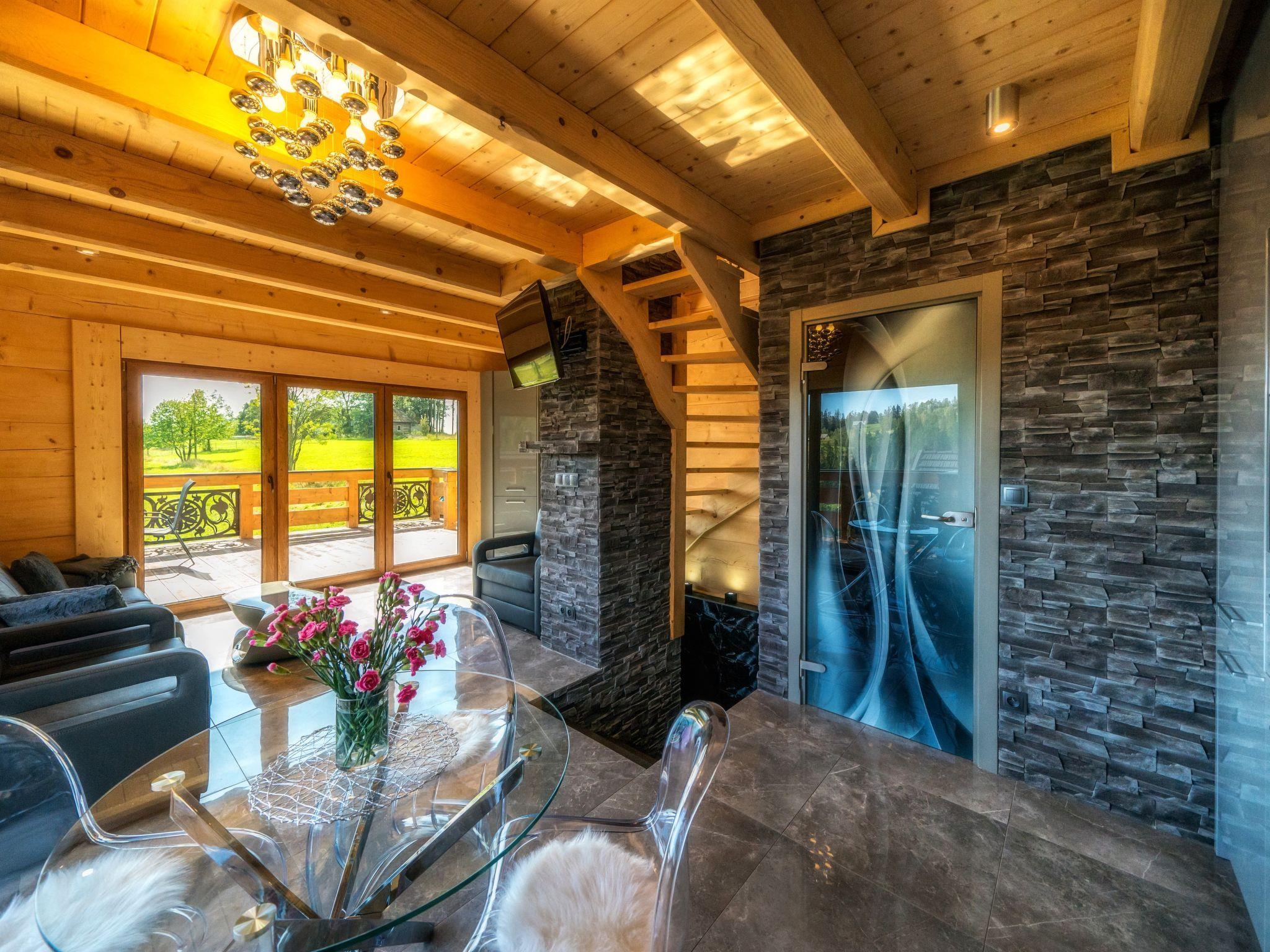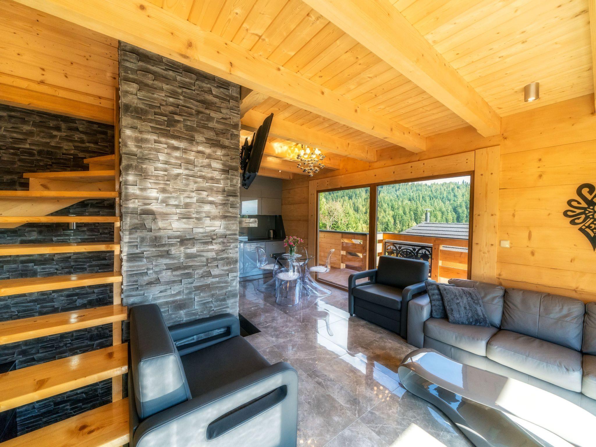 The cottage is designed in a traditional style, using natural materials of wood and stone. It has large windows that allow you to enjoy the view of the mountains. The interior of the cottage is decorated in an elegant, modern style with attention to every detail.