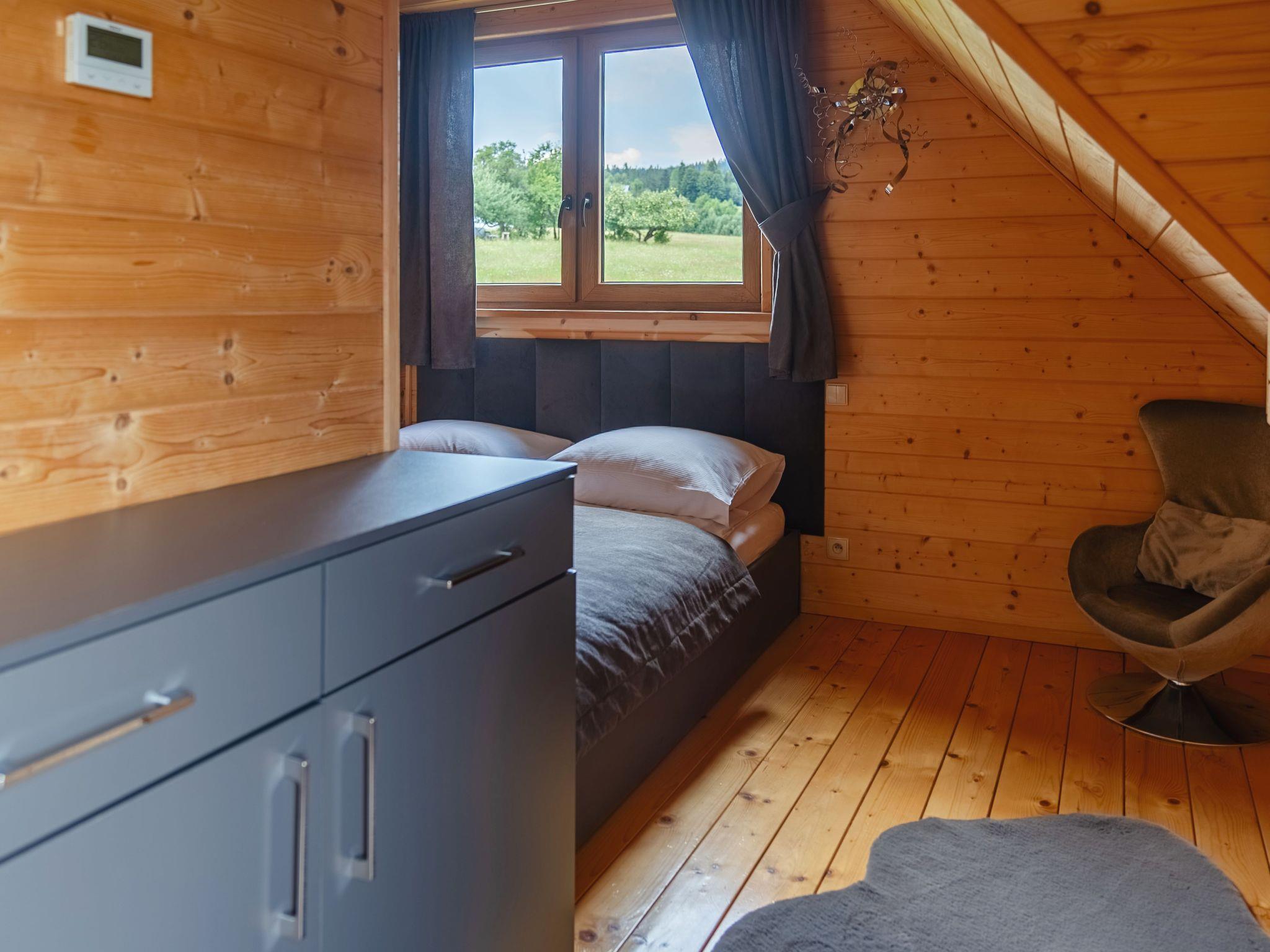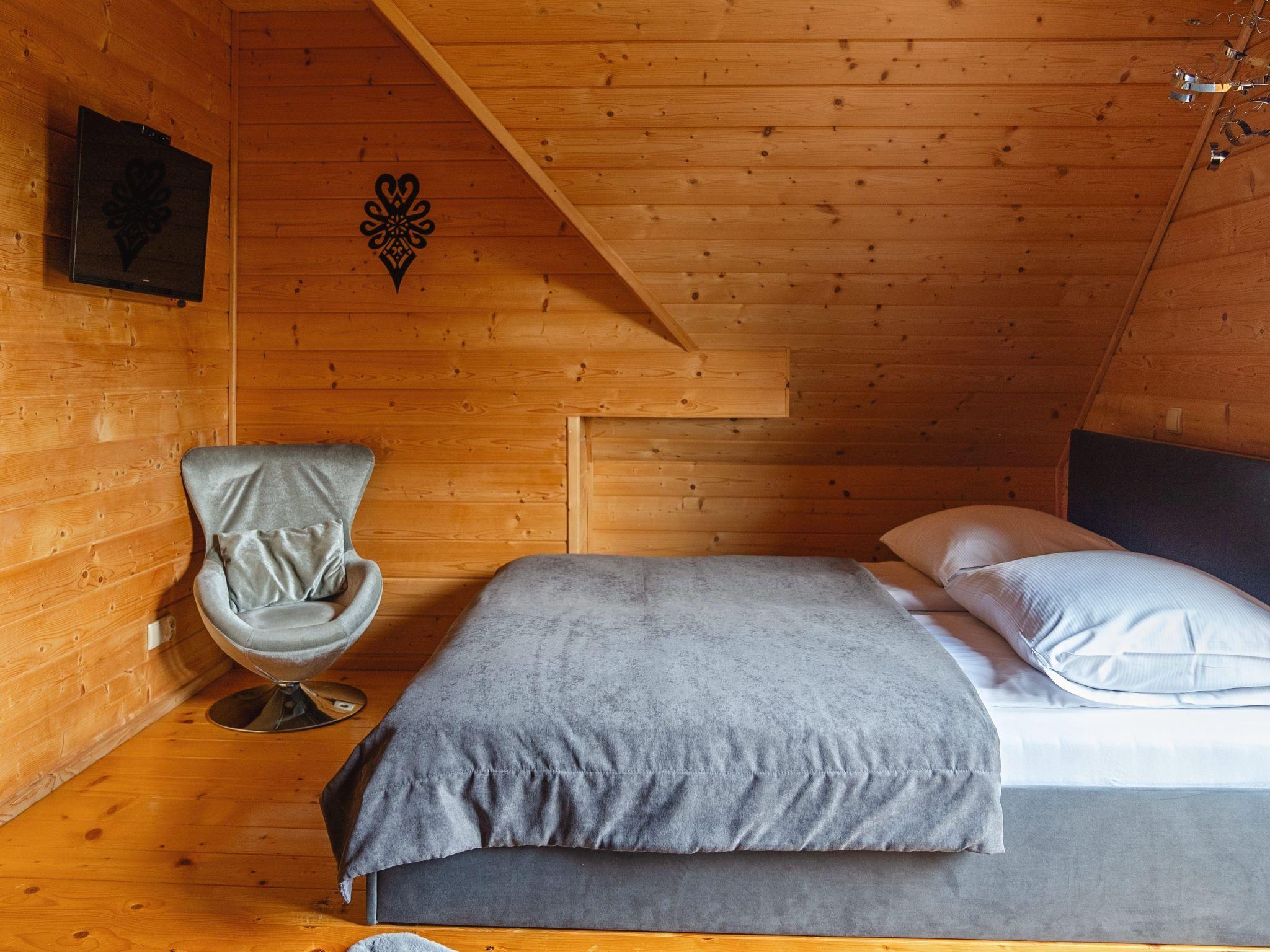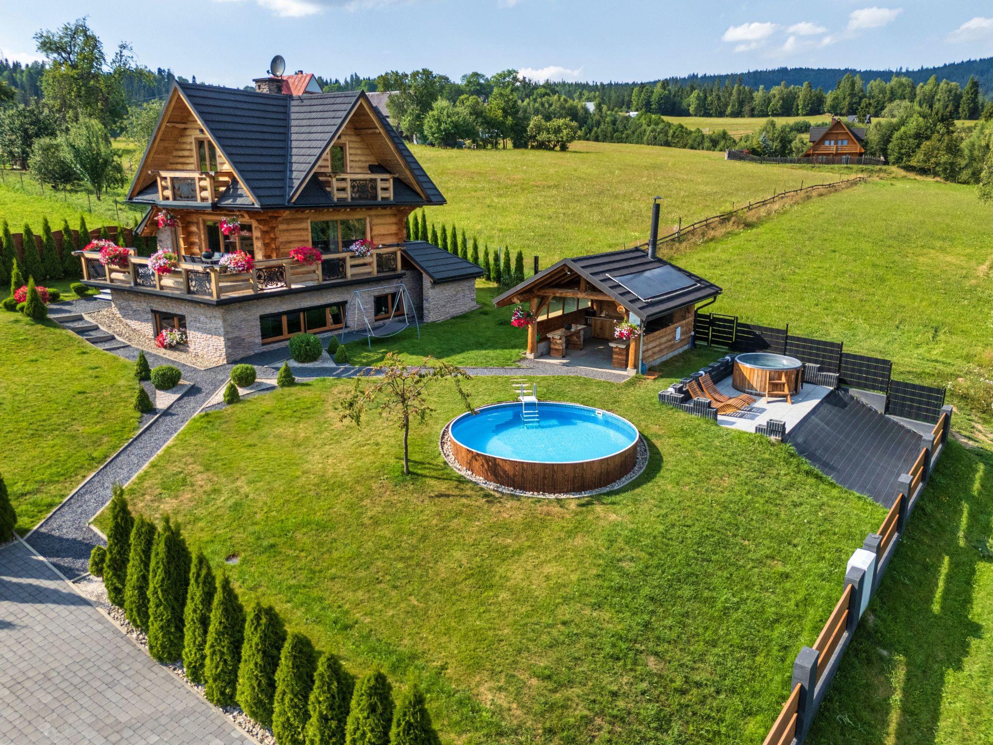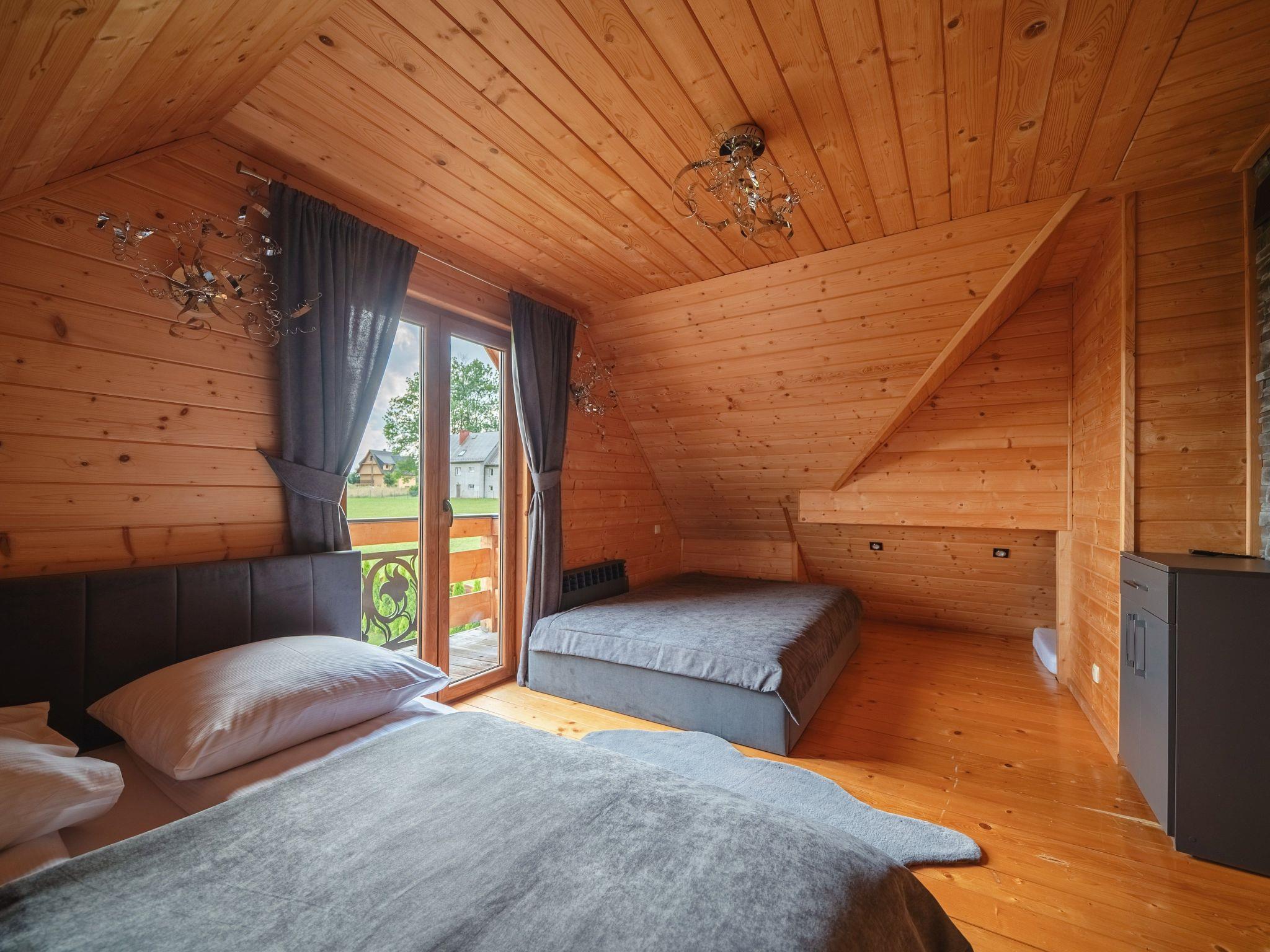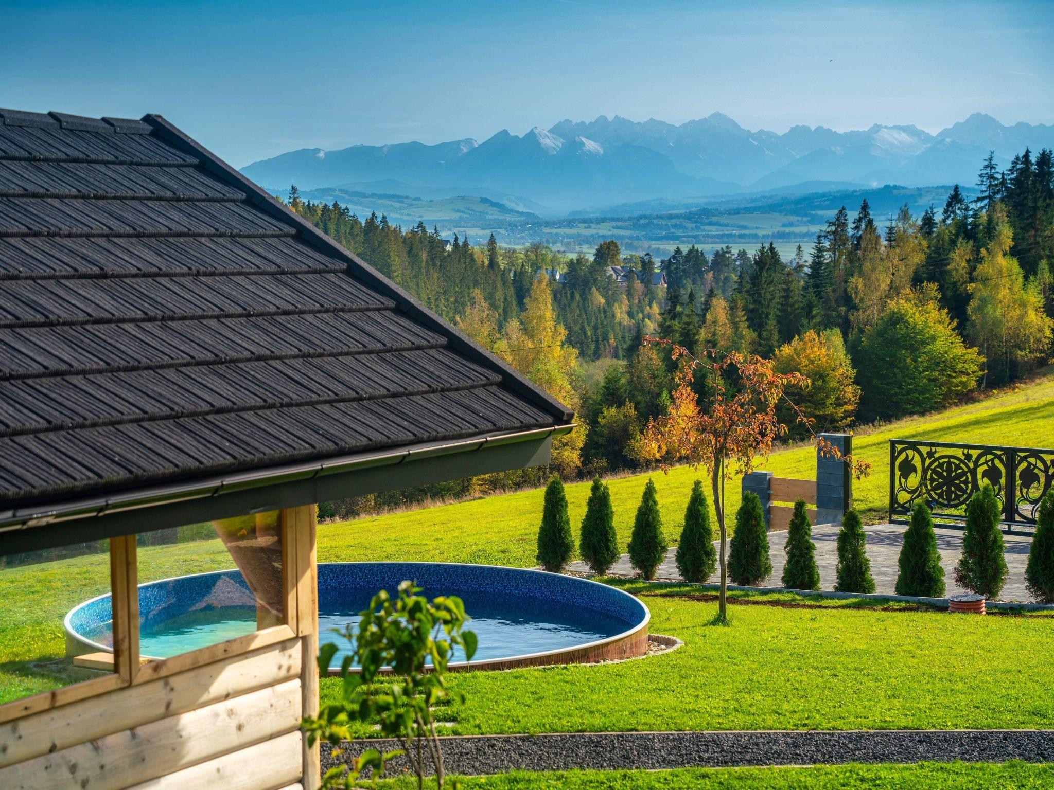 On the ground floor there is an open-plan living room with a kitchenette, a small bathroom (toilet + sink) and direct access to the terrace from which you can enjoy the view of the Tatra Mountains, the Gorce Mountains and a large garden with a swimming pool, hot tub and gazebo for evening feasts.