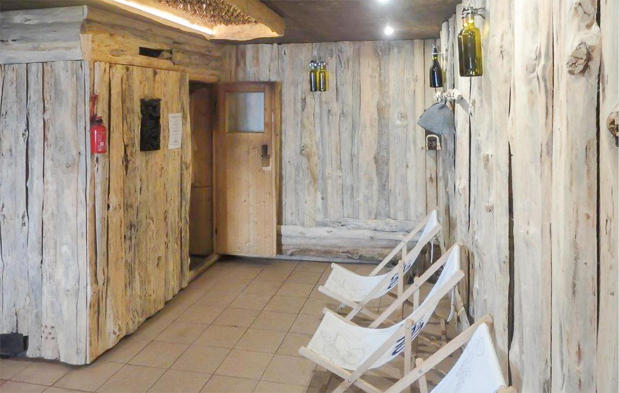 Oplev det indbydende interiør med masser af træ, der skaber en varm og rolig atmosfære. Find jer til rette i den hyggelige opholdsstue med sofa eller brug spiseområdet til fælles måltider. Tilbered enkle måltider i det åbne tekøkken. Slap yderligere af i den fælles sauna, der giver beroligende varme efter en aktiv dag.