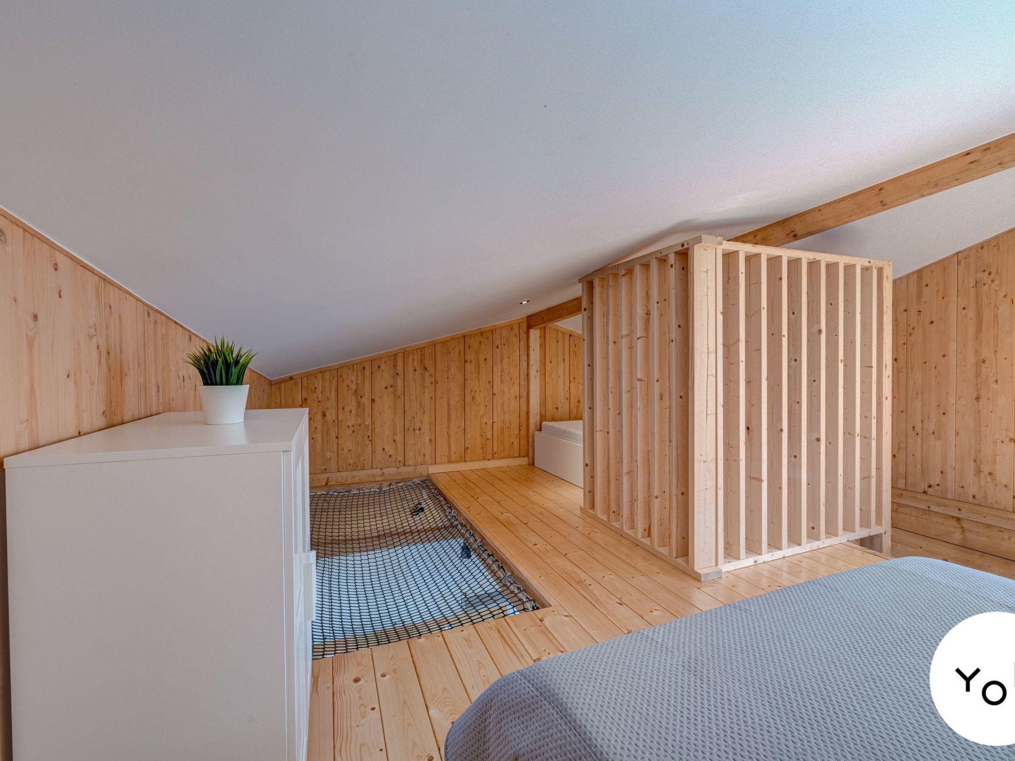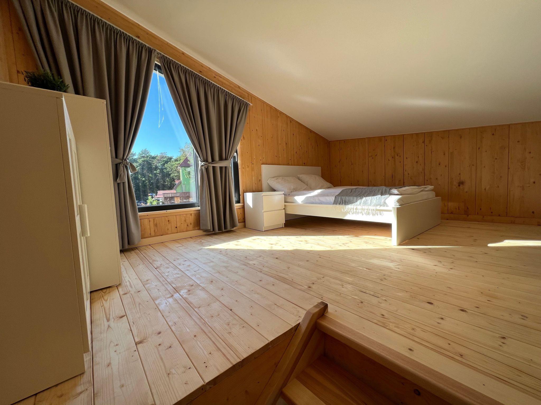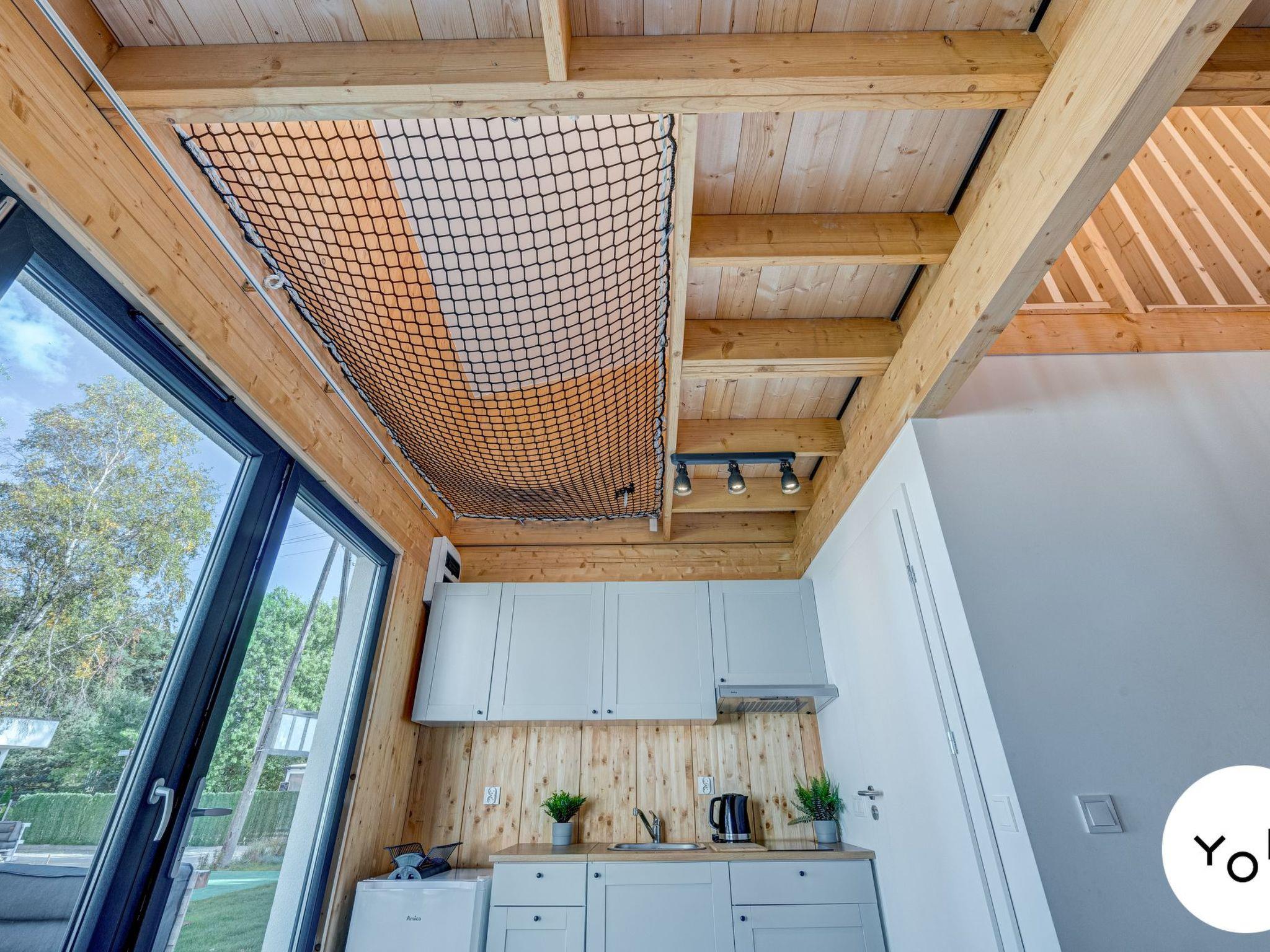 The 4-6 person cottage with mezzanine is our largest cottage, with an additional high mezzanine, measuring 44-52 m2, with separate access to a spacious (15m2) terrace dedicated to the cottage. The 4-6 person cottage with mezzanine is ideal for a holiday for a large family of 6 or even 2 families. Inside, guests have a comfortable living room with space to relax and spend time together. The fully equipped kitchen with dining area allows for the preparation of daily meals and also encourages culinary experiments. After an actively spent day, a comfortable double bed in the Parents' space, separated by a blackout curtain, will ensure a well-deserved and peaceful sleep. A fold-out 2-person sofa is provided for children. On the mezzanine there is a unique hammocking area, as well as two connected single beds and a comfortable double bed, and a space for relaxation.
