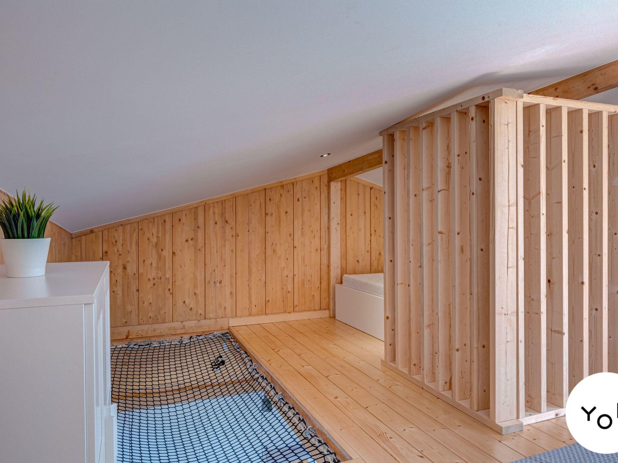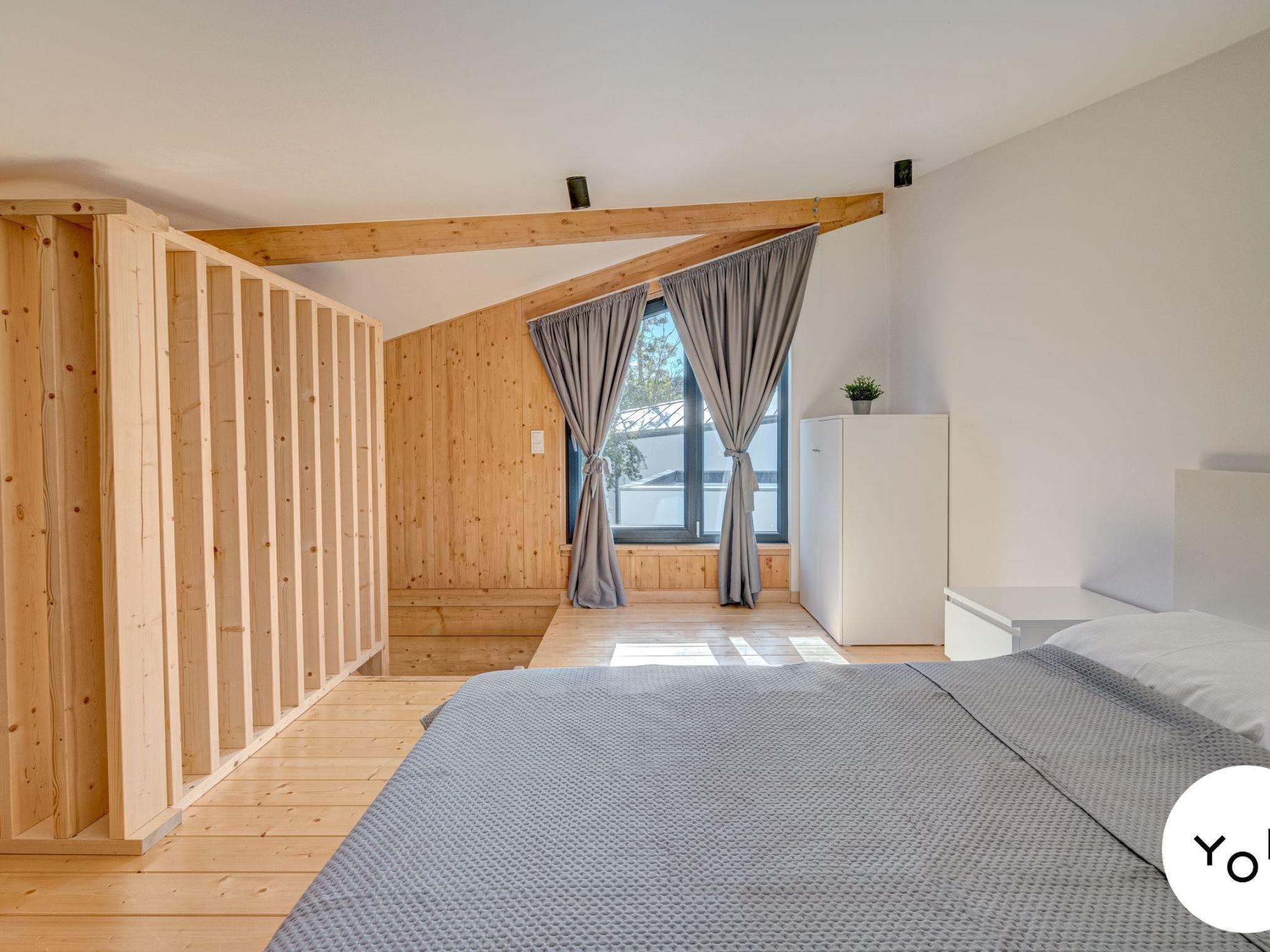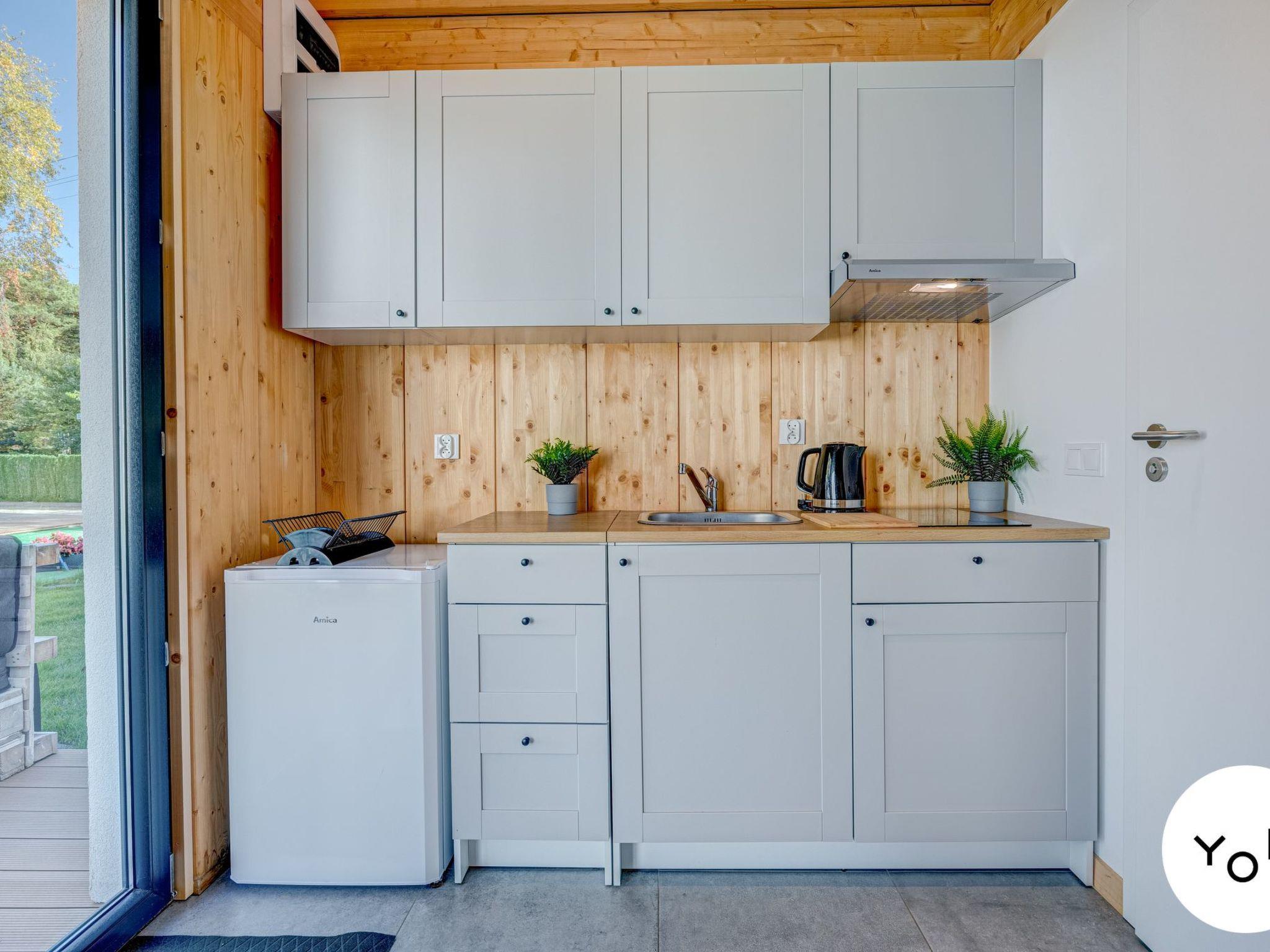 The 4-6 person cottage with mezzanine is our largest cottage, with an additional high mezzanine, measuring 44-52 m2, with separate access to a spacious (15m2) terrace dedicated to the cottage. The 4-6 person cottage with mezzanine is ideal for a holiday for a large family of 6 or even 2 families. Inside, guests have a comfortable living room with space to relax and spend time together. The fully equipped kitchen with dining area allows for the preparation of daily meals and also encourages culinary experiments. After an actively spent day, a comfortable double bed in the Parents' space, separated by a blackout curtain, will ensure a well-deserved and peaceful sleep. A fold-out 2-person sofa is provided for children. On the mezzanine there is a unique hammocking area, as well as two connected single beds and a comfortable double bed, and a space for relaxation.