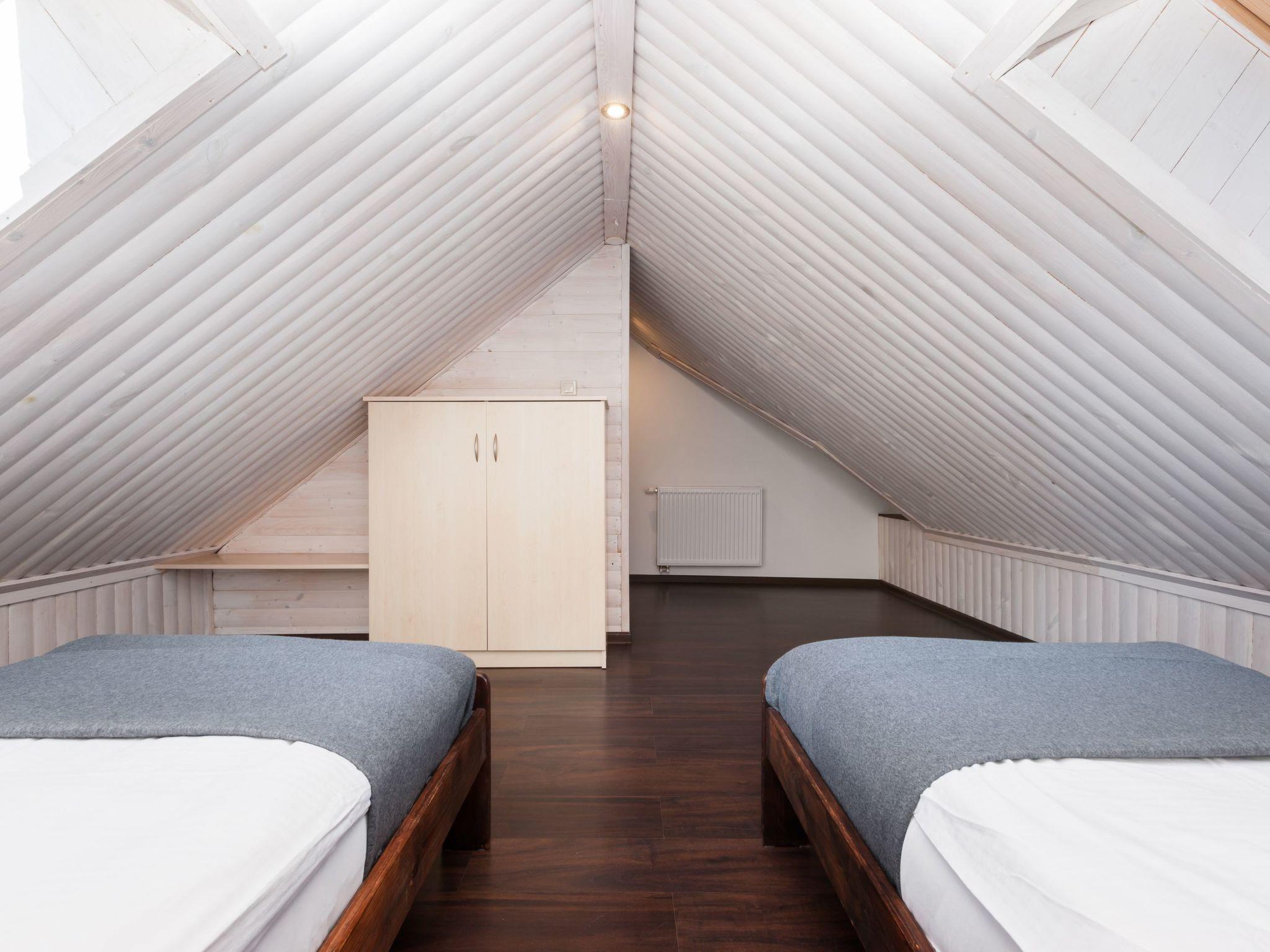 There are two types of cottages in our complex: the northern and southern cottages, each measuring approximately 60 m² and designed to comfortably accommodate up to 6 people. In the northern cottages, a comfortable seating area, a kitchen with dining table and a bathroom are available on the ground floor. The first floor is a spacious bedroom with a double bed and a sofa bed. In the attic there is another bedroom with two single beds and a sea view. The southern cottages have similar facilities, except that they have two separate bedrooms on the first floor.