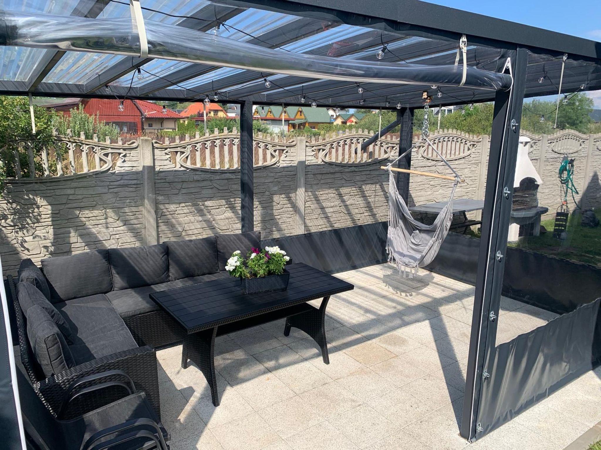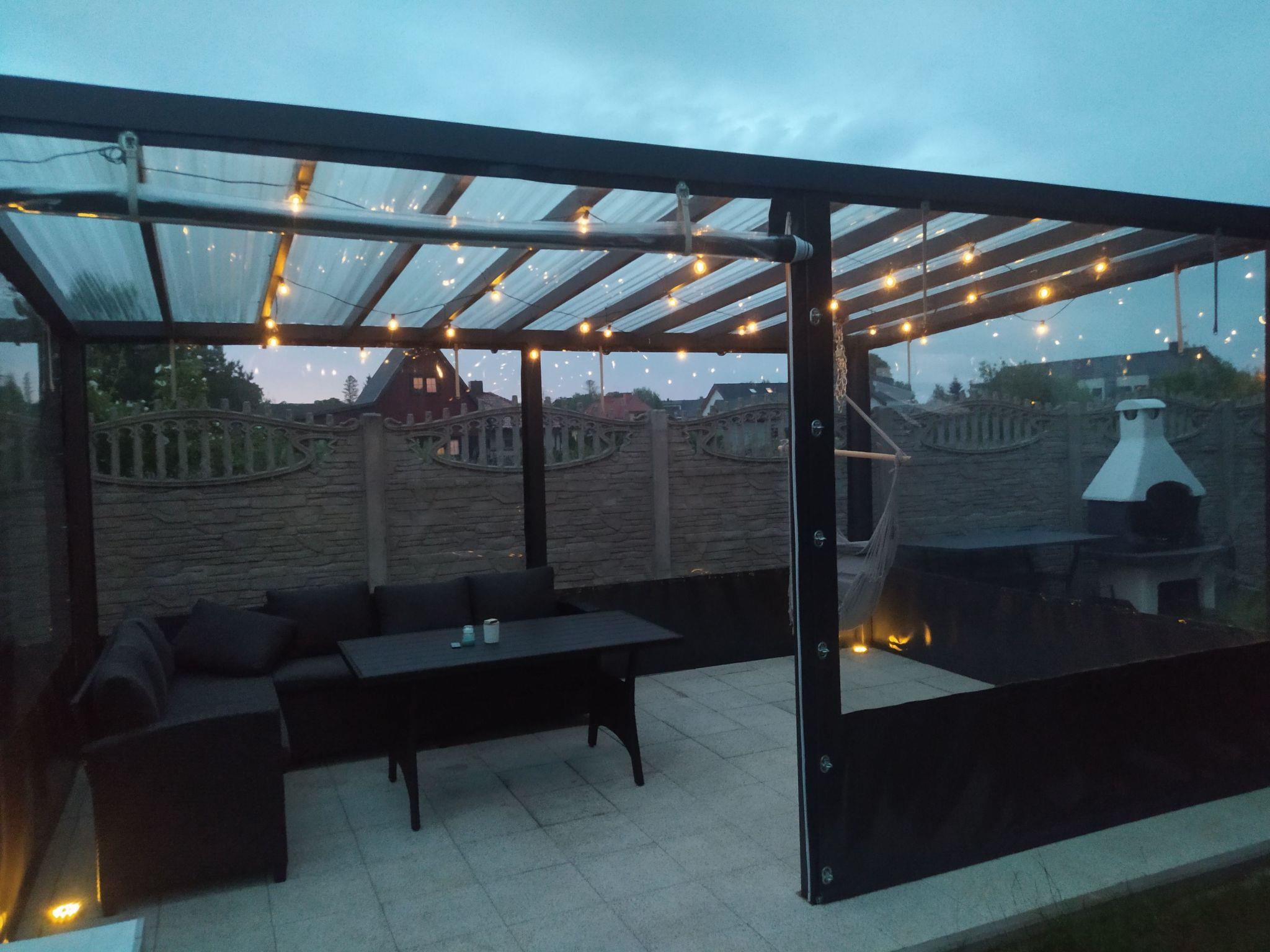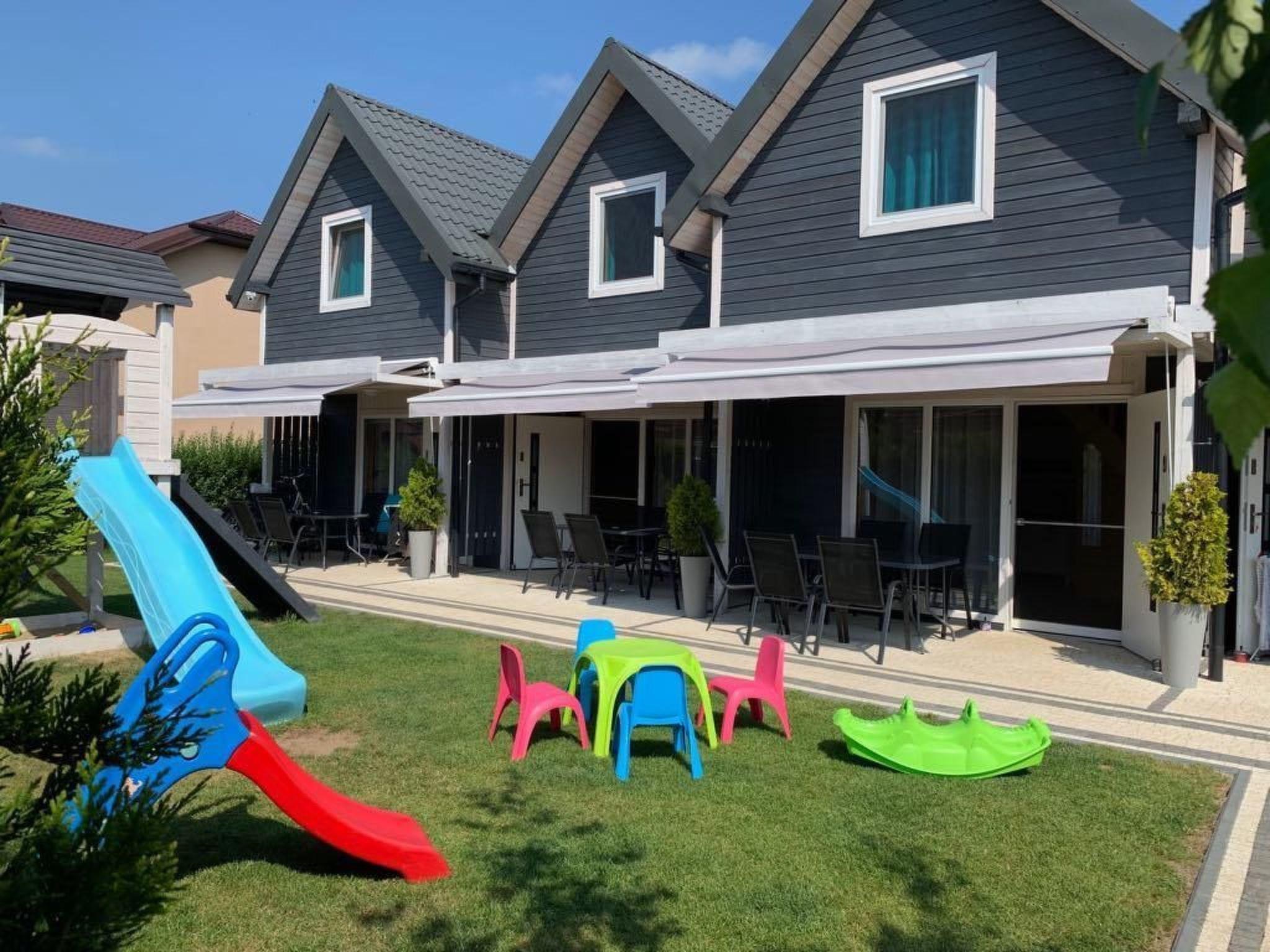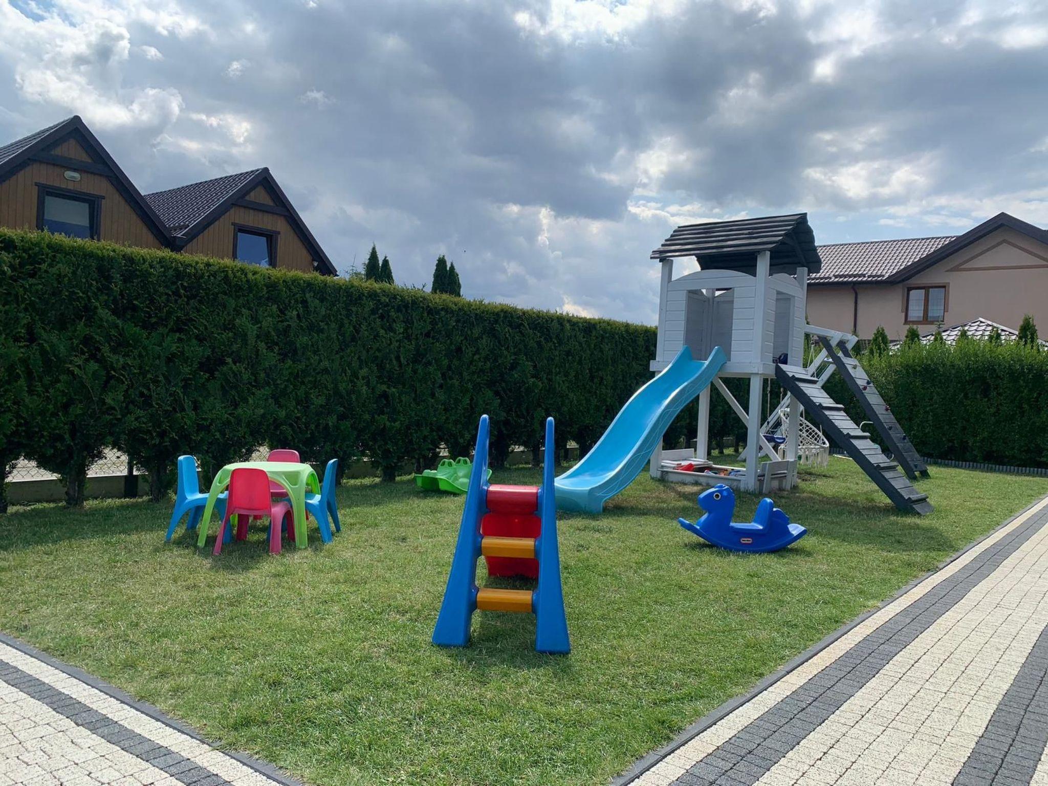 The property is monitored. We offer 1 parking space per house on the property.In the common area: children's playground, sandpit with toys, bicycles and barbecue area.Individual furnishings for the terrace: garden furniture (table + 6 chairs), awning.