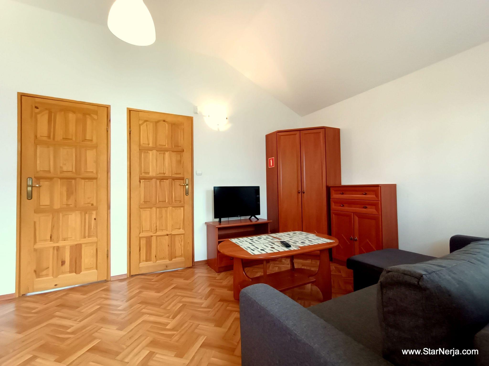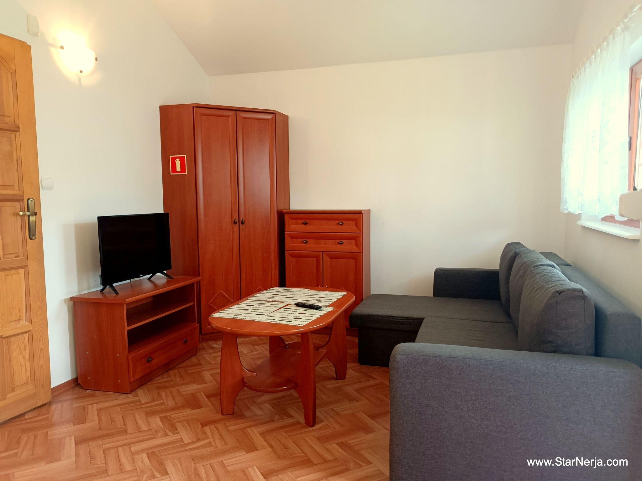 Living room with sofa bed for 2 persons, TV, table, other furniture.