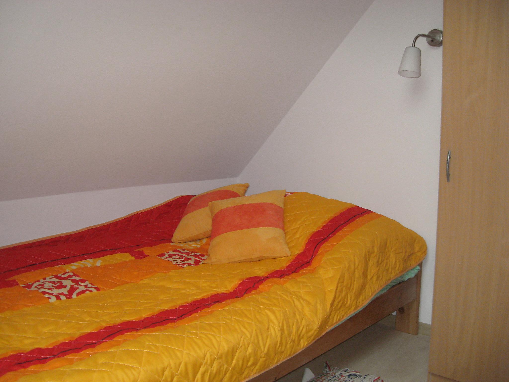 4-room house 150 m2 on 2 levels. Partly with sloping ceilings, comfortable and beautiful furnishings: open living/dining room with Scandinavian wood stove and satellite TV. Exit to the garden, to the terrace. Open kitchen (2 hot plates, oven, dishwasher, microwave, electric coffee machine). Shower/bidet/WC. Top floor: 2 rooms with sloping ceilings, each room with 1 double bed. 1 room with sloping ceilings with 2 beds. Bath/WC. Wood heating. Terrace 16 m2. Terrace furniture, deck chairs (2). View of the countryside. Please note: smoke alarm.