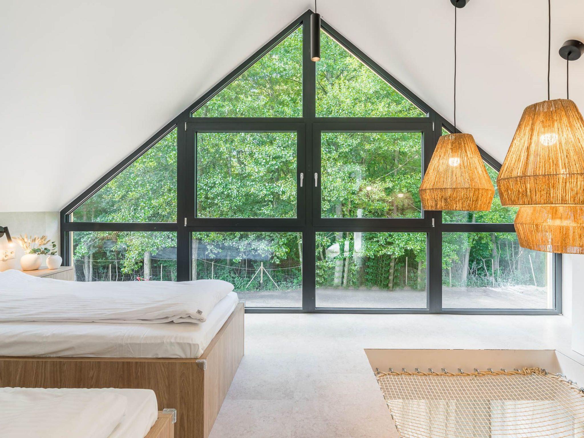 One bedroom is furnished with 2 single beds and a unique openwork relaxation area with a panoramic window facing the forest. The second bedroom, on the other hand, features a large double bed together with a private free-standing bathtub and a dressing table with mirror and a view of the garden and the stream.