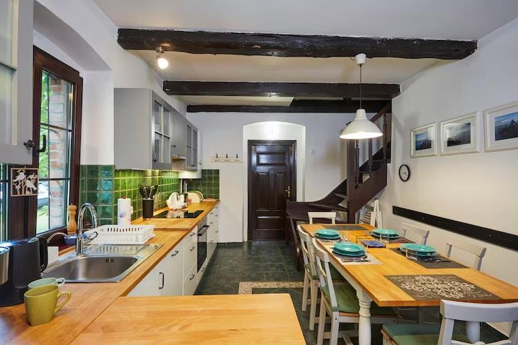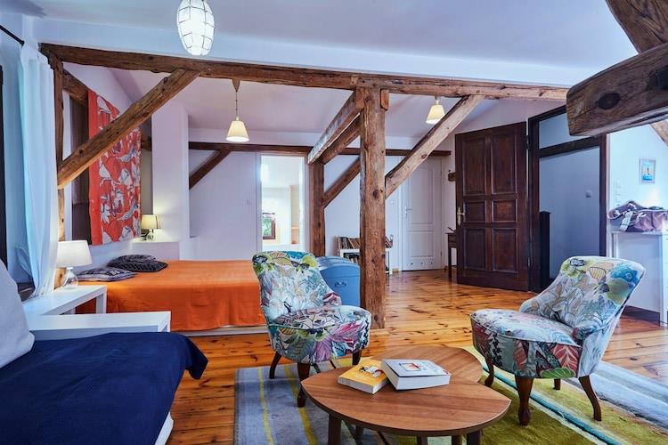 En charmerende ferielandsby beliggende i hjertet af en vild skov, nær Slowinski Nationalpark. Unik beliggenhed i den maleriske landsby Sasino (en kasjubisk landsby nær Leba og Stilo Fyrtårn). Stranden ved kysten ligger 5 km væk, med en sti gennem en fyrreskov. Dette komfortable, rummelige toetagers feriehus kan prale af en privat, indhegnet grund og privat adgang til swimmingpool, sauna og spabad. Stueetagen har en rummelig stue (TV og sofa), et veludstyret køkken (inklusive ovn, opvaskemaskine, vaskemaskine og kaffemaskine) med spiseplads (stort bord), to soveværelser (et med TV og pejs) og et badeværelse med bruser. Ovenpå er der to soveværelser: det første er stort med en dobbeltseng, en sovesofa og et separat rekreationsområde med en spillekonsol (plus en ekstra sovealkove med to enkeltsenge). Det andet soveværelse er mindre med to enkeltsenge. Der er også et andet badeværelse ovenpå, denne gang med et badekar. Centralvarme (gas) og pejs i soveværelset i stueetagen (med varmefordeling til andre rum). Der er gulvvarme i begge badeværelser. Der er trådløst internet. Det rummelige, velholdte og indhegnede område (til eksklusiv brug for gæster) omfatter en sommerpool (åben fra 15. maj til 15. oktober, uopvarmet), en sauna (mod et ekstra gebyr på PLN 500 pr. uge), et spabad (mod et ekstra gebyr på PLN 500 pr. uge) og et havepavillon med pejs og grill. En stor attraktion er den private rebpark (tre seler er tilgængelige, inkluderet i prisen). Der er også en lille legeplads og parkering. Gæsterne har adgang til to cykler og stave til stavgang. Prisen inkluderer: vand, internet, parkering, sommerpool (15. maj - 15. oktober), cykler (2), en barneseng, en højstol, en velkomstkurv og en rebpark. Stranden nær Sasino har en vild karakter, og selv om sommeren besøger få turister, hvilket sikrer fred og ro.