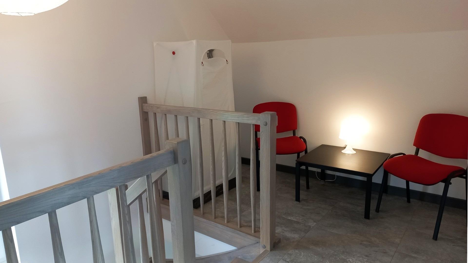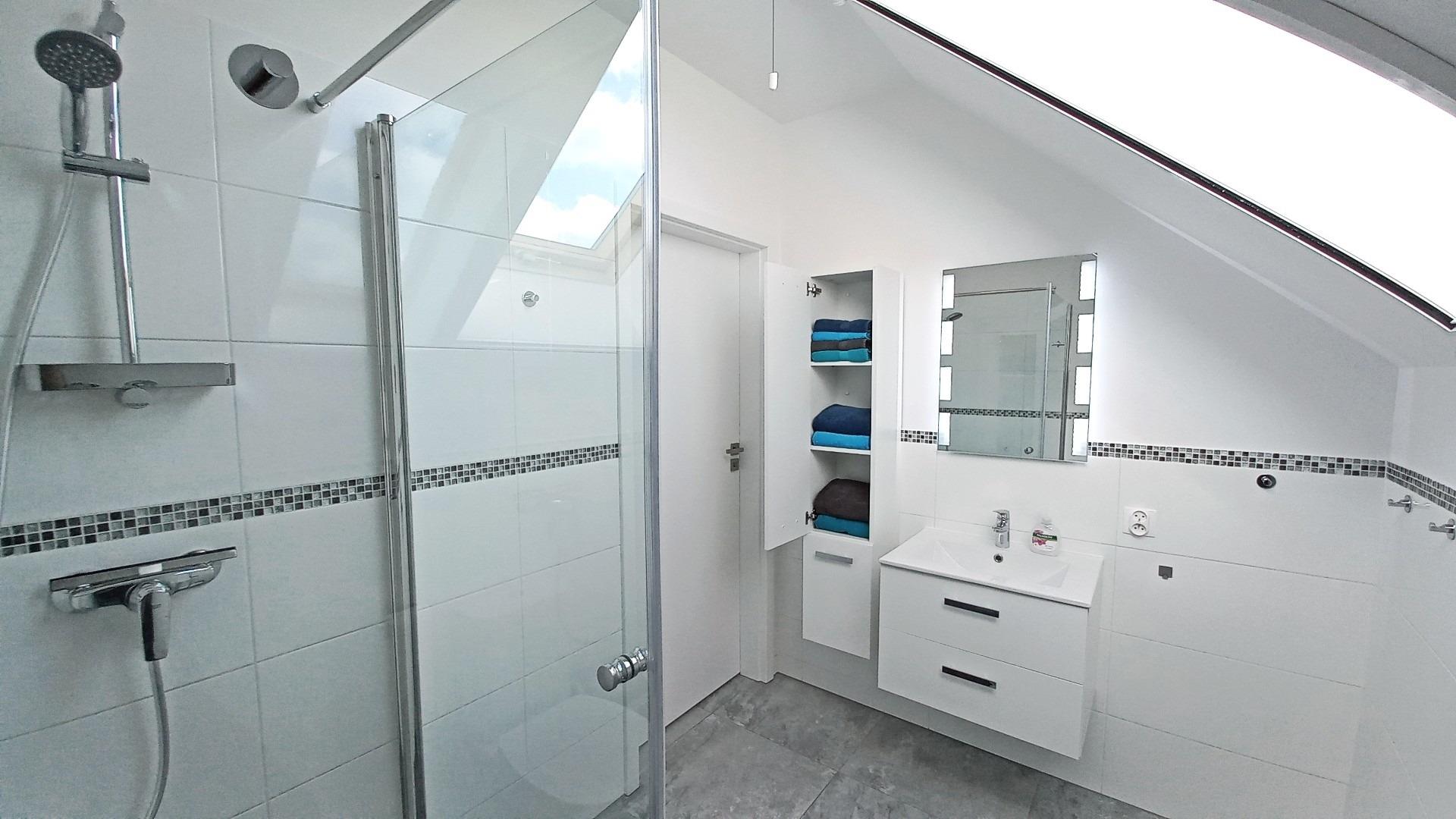 Eine offene Treppe zum Boden, wo Sie 2 Schlafzimmer und ein Badezimmer mit Dusche, Waschbecken und zweite Toilette finden. 1 Schlafzimmer mit Doppelbett und 1 Schlafzimmer mit zwei Einzelbetten. Kleiderschrank und Nachttisch in jedem Zimmer. Landung mit Stauraum (eventuell für 5. Bett in Absprache).