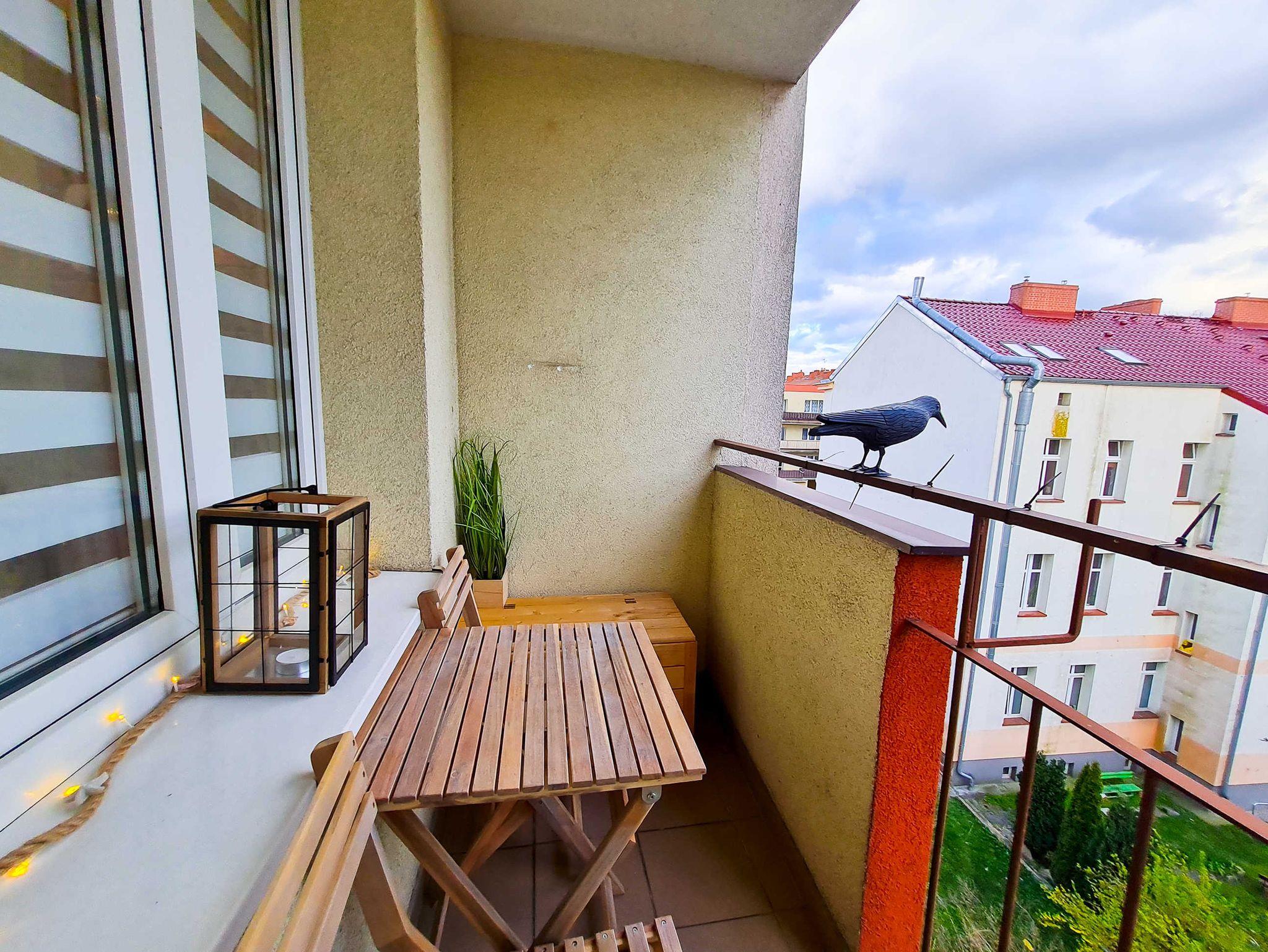 Das Wohnzimmer öffnet sich auf einen Balkon (von der Südseite), wo ein Tisch und zwei Balkonstühle zur Verfügung stehen.