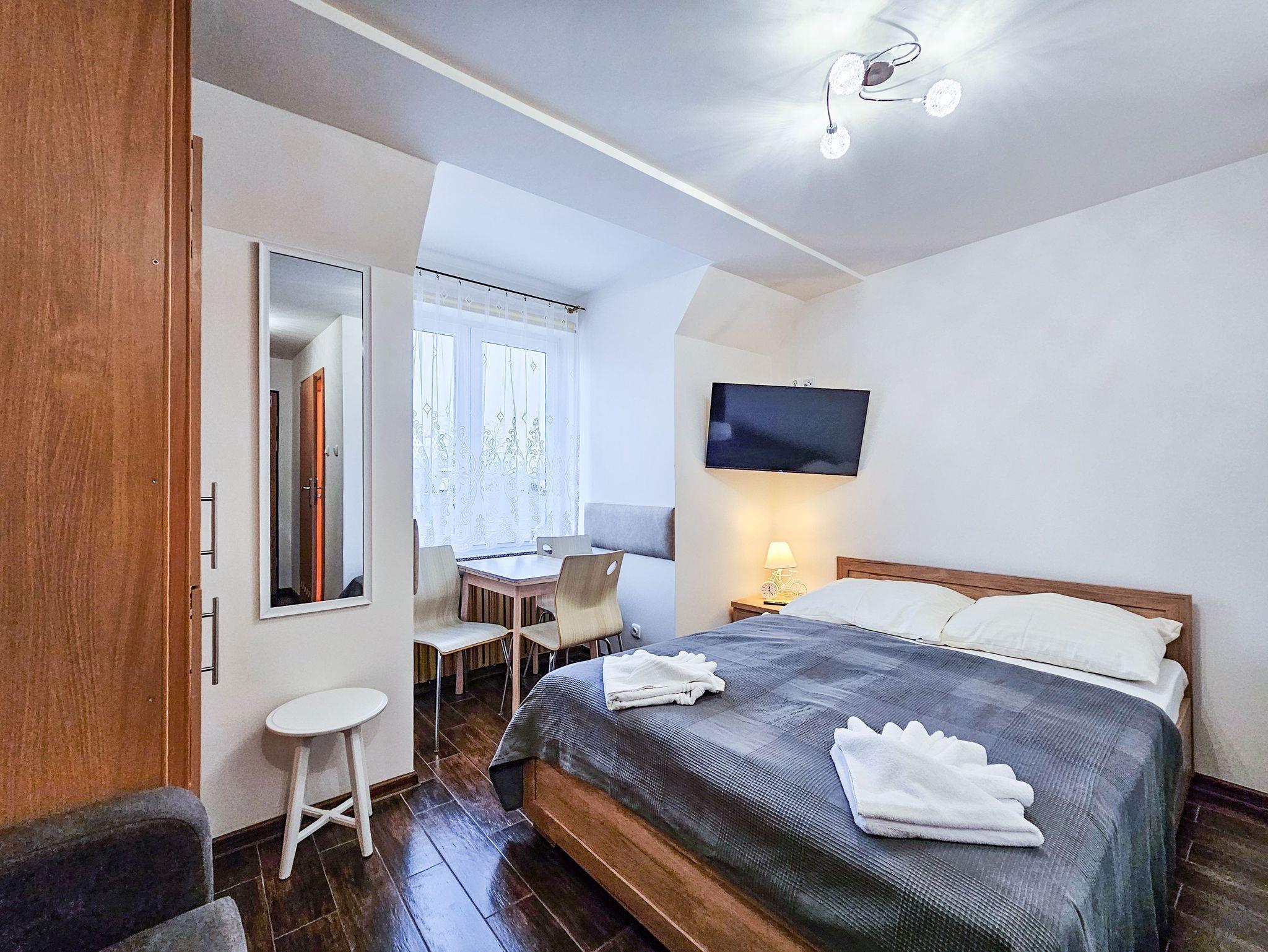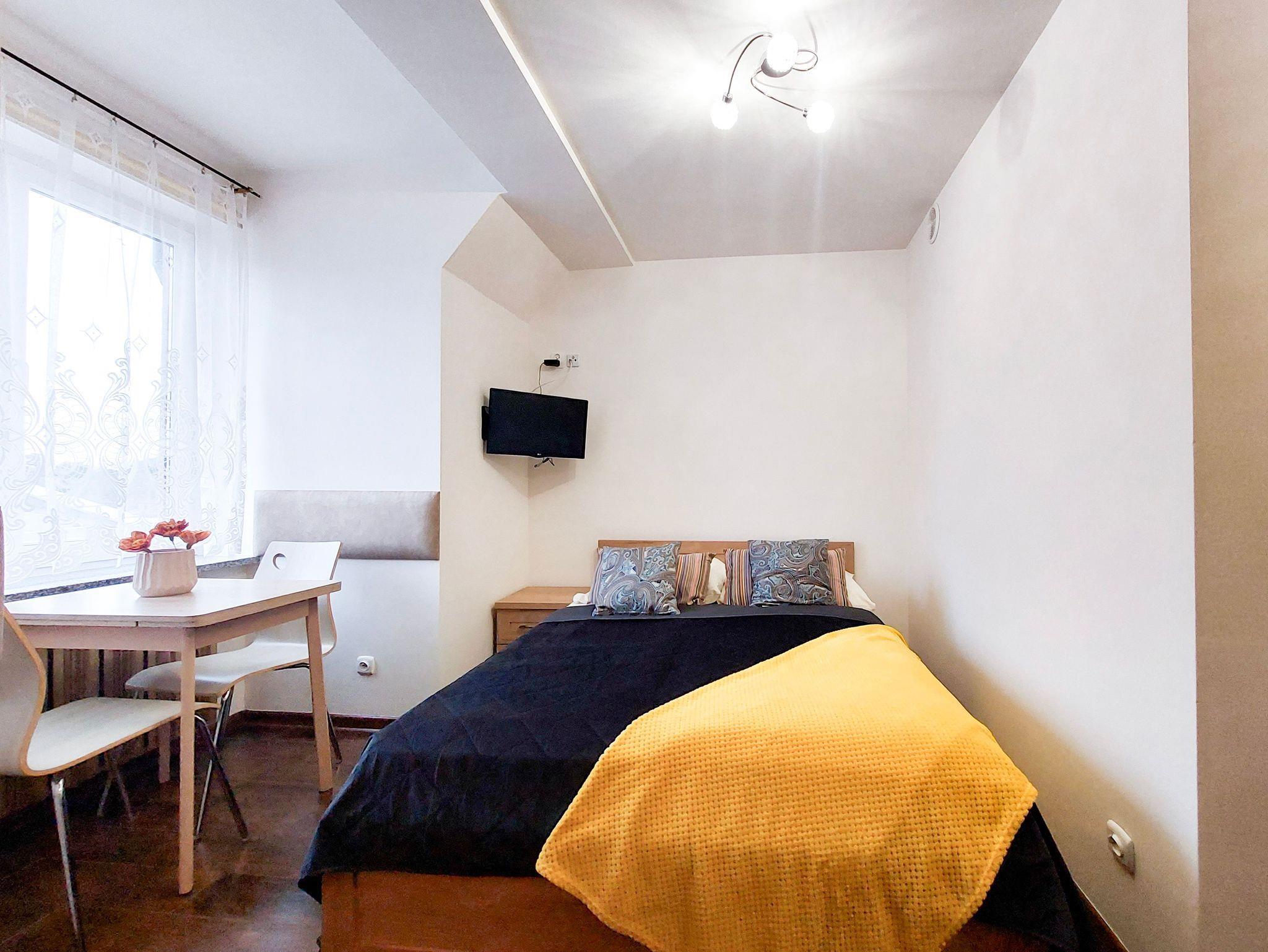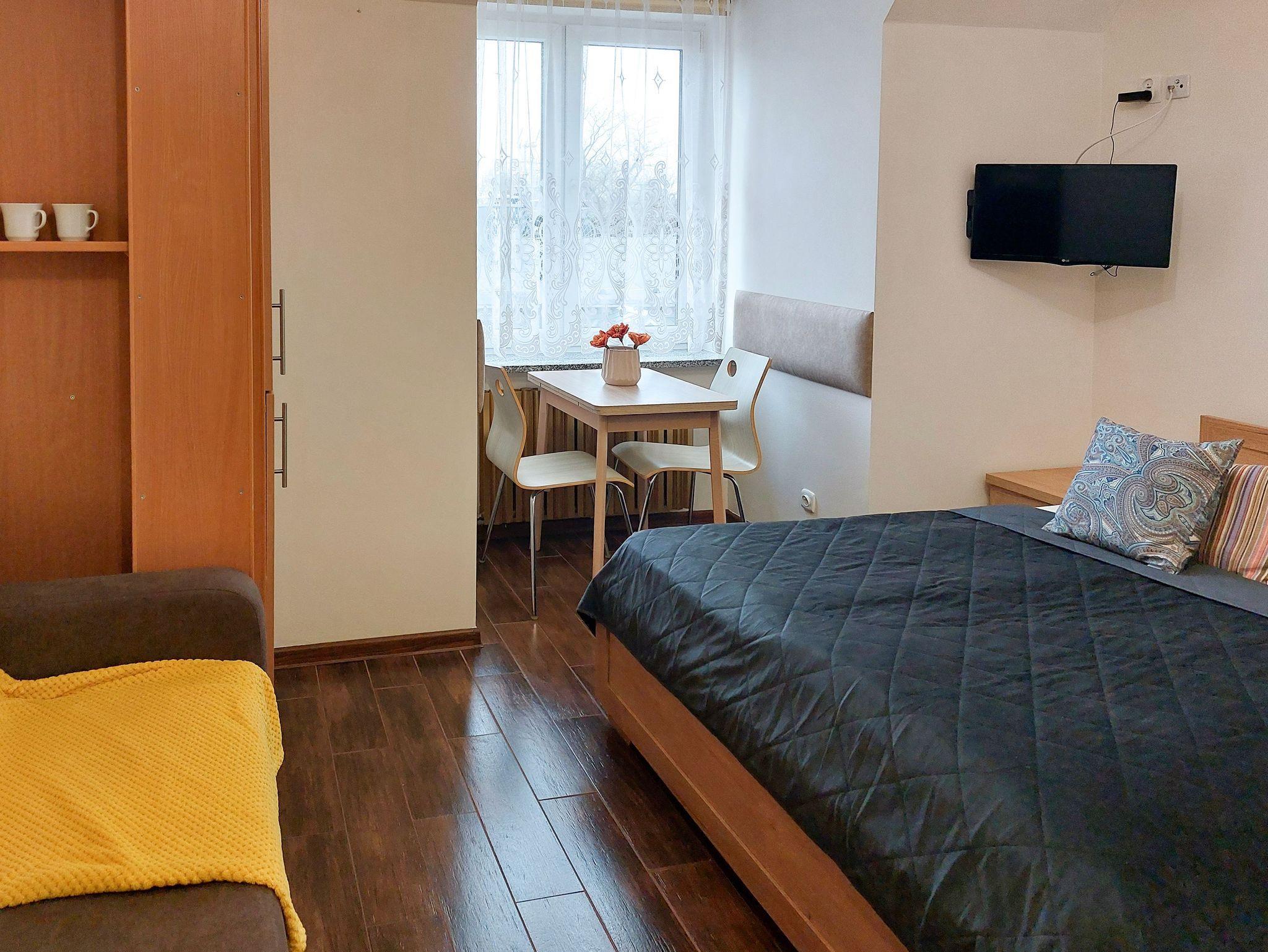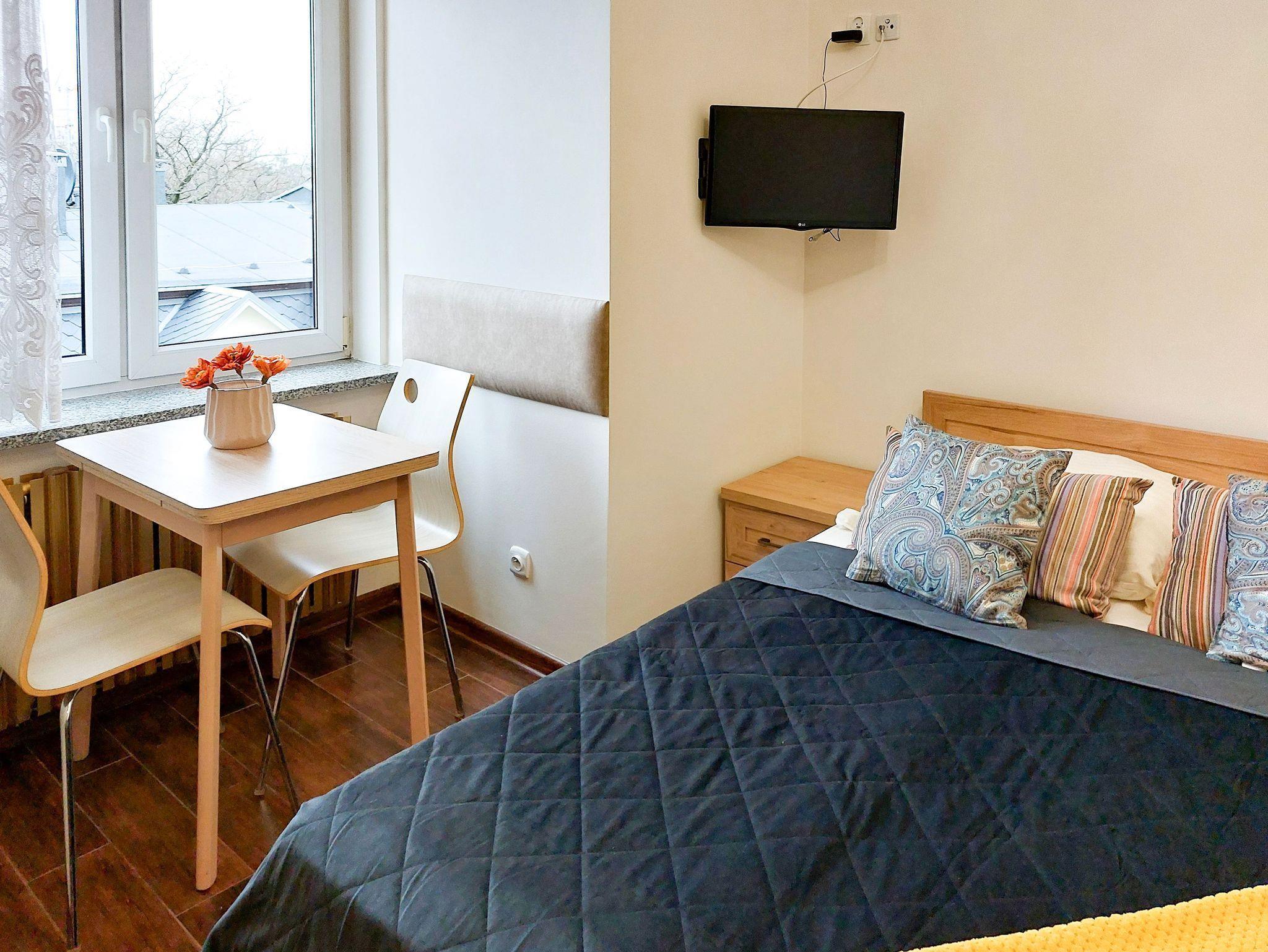 Die 1-Zimmer-Ferienwohnung mit einer Fläche von 20m2 befindet sich im 3. Stock eines mit einem Fahrstuhl ausgestatteten historischen Gebäudes an der Promenade. Sie ist für den Aufenthalt von zwei Personen und eines Kindes vorbereitet. Die Wohnung besteht aus einem Raum mit Küchenzeile und einem Badezimmer mit Dusche und einer Toilette. Sie ist mit ein Doppelbett (140x200cm), einem Esstisch, 2 Stühlenund einem Fernseher ausgestattet. Die Fenster der Wohnung sind nach Westen gerichtet.