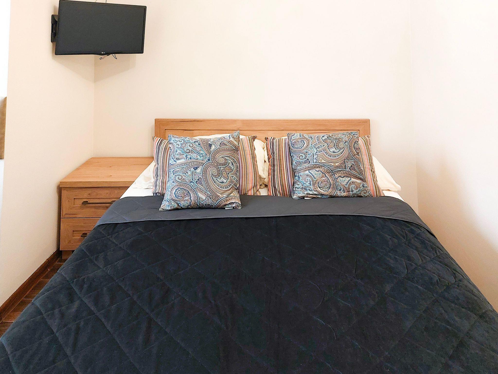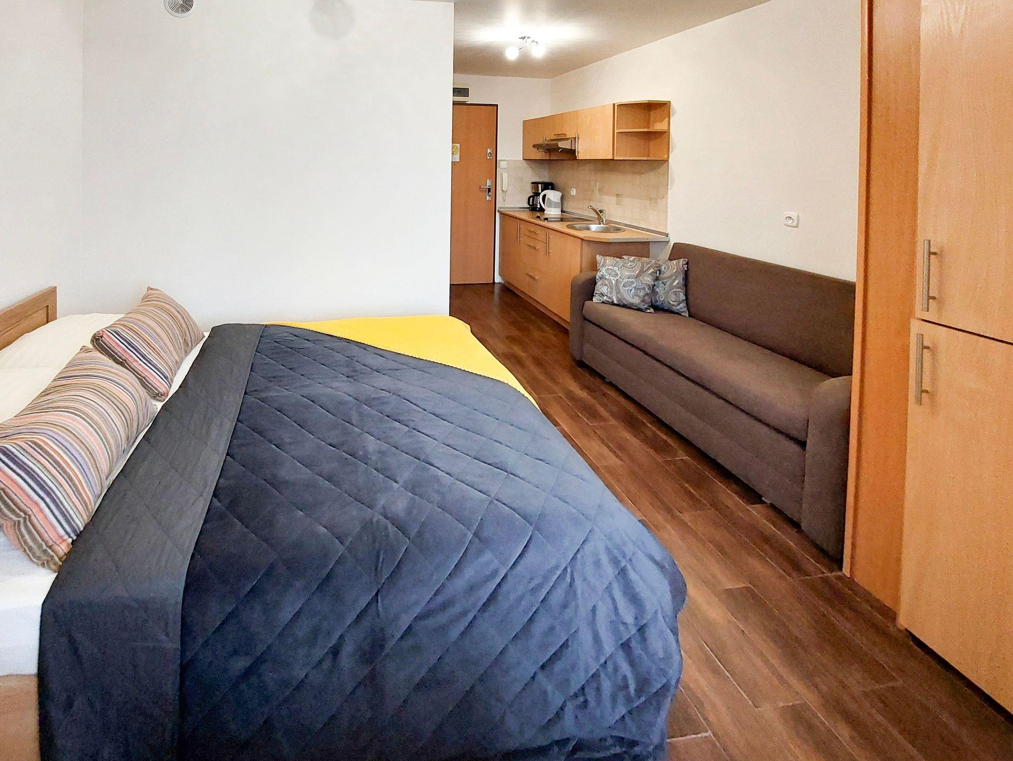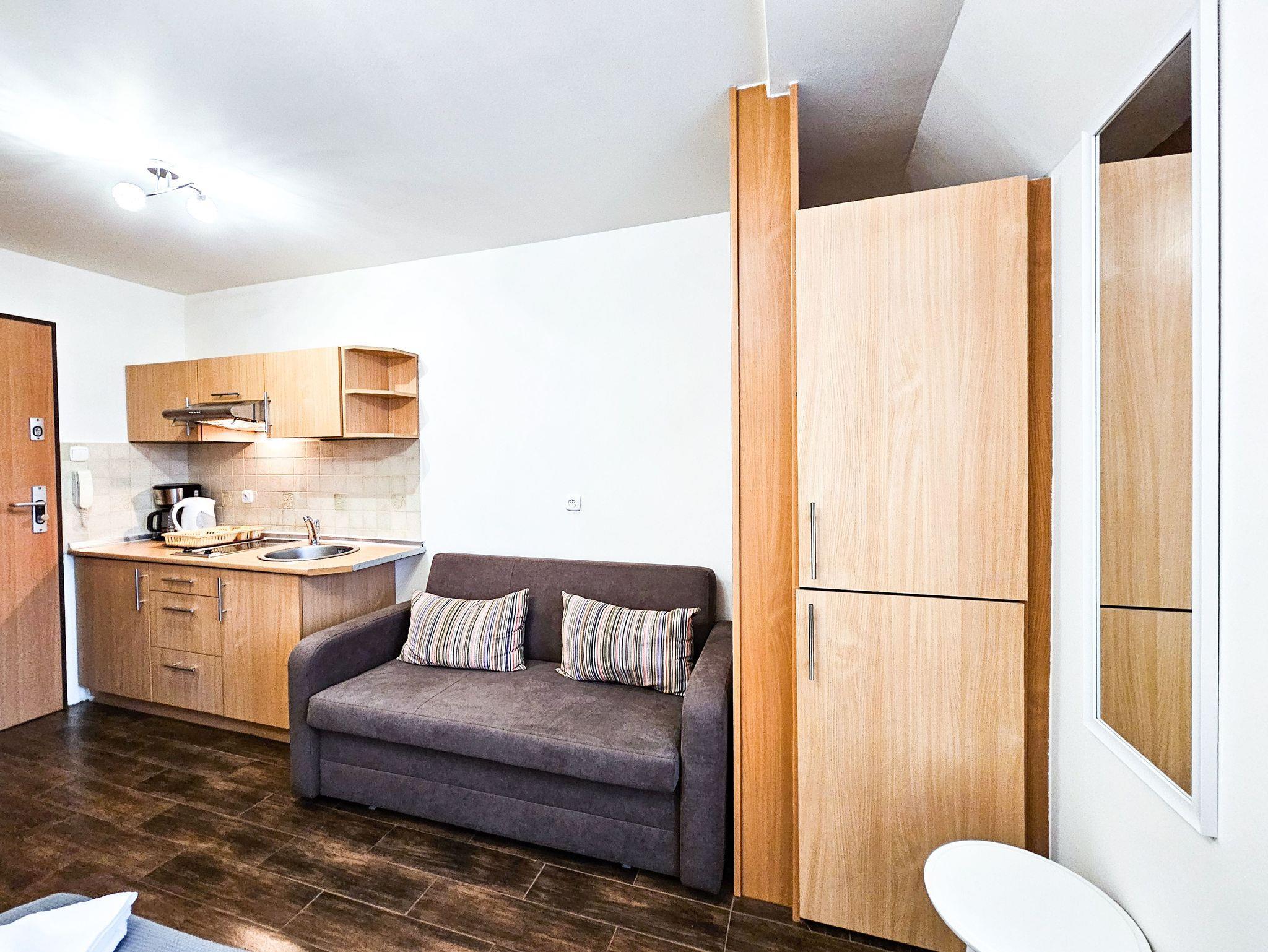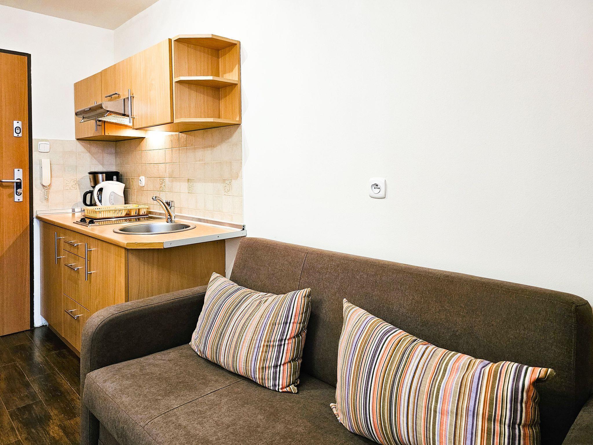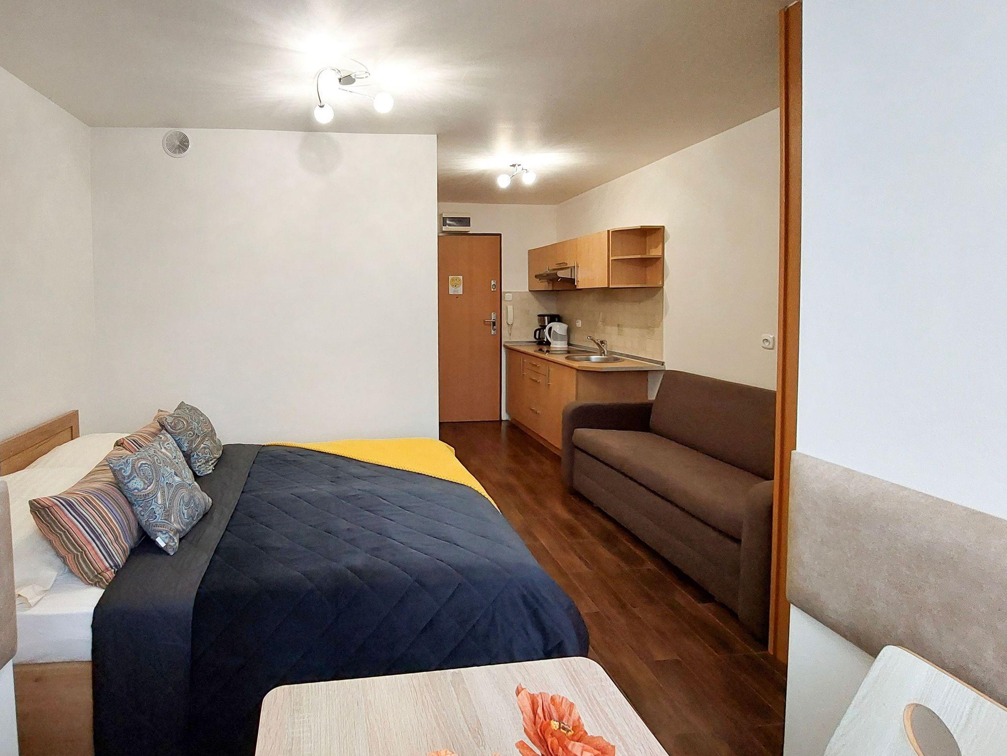 Die 1-Zimmer-Ferienwohnung mit einer Fläche von 20m2 befindet sich im 3. Stock eines mit einem Fahrstuhl ausgestatteten historischen Gebäudes an der Promenade. Sie ist für den Aufenthalt von zwei Personen und eines Kindes vorbereitet. Die Wohnung besteht aus einem Raum mit Küchenzeile und einem Badezimmer mit Dusche und einer Toilette. Sie ist mit ein Doppelbett (140x200cm), einem Esstisch, 2 Stühlenund einem Fernseher ausgestattet. Die Fenster der Wohnung sind nach Westen gerichtet.