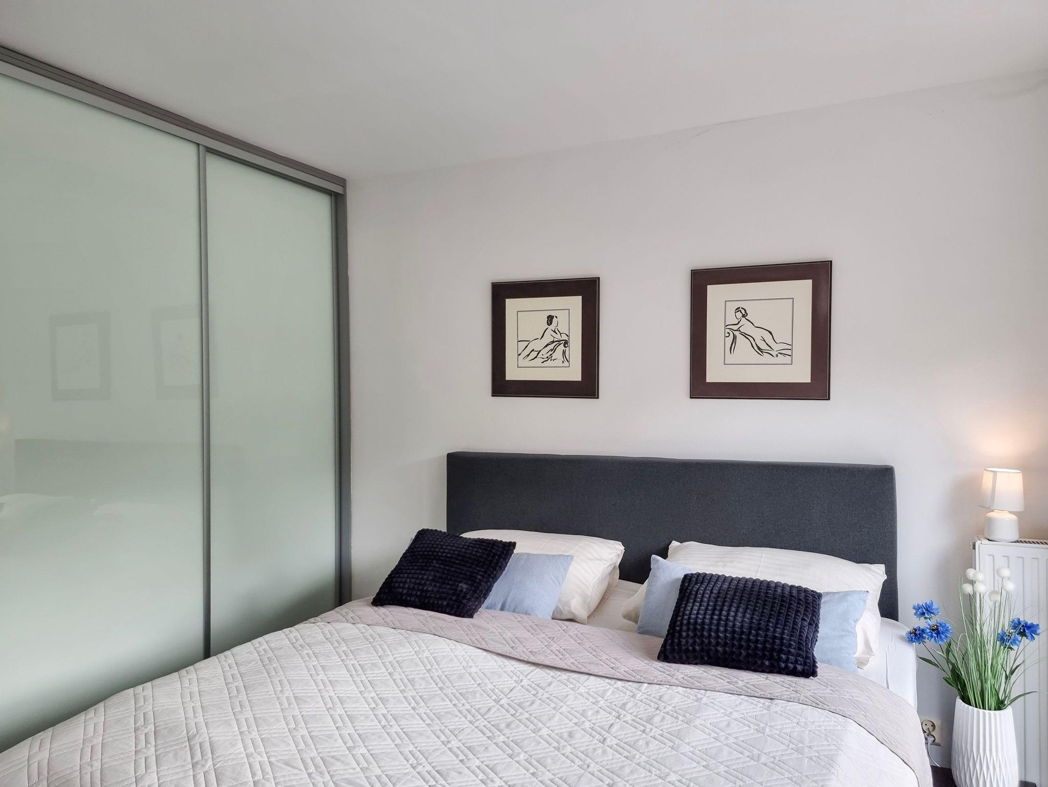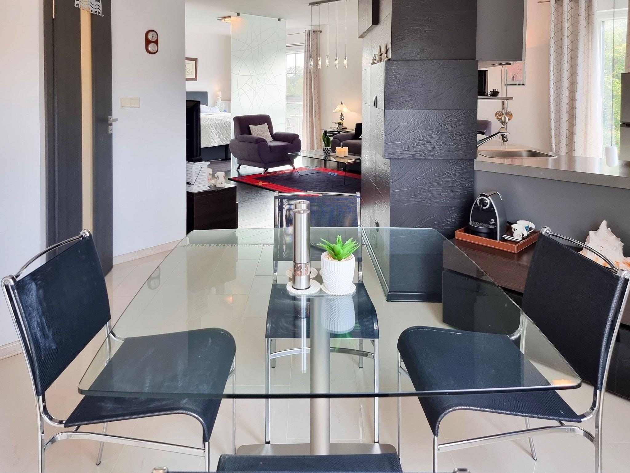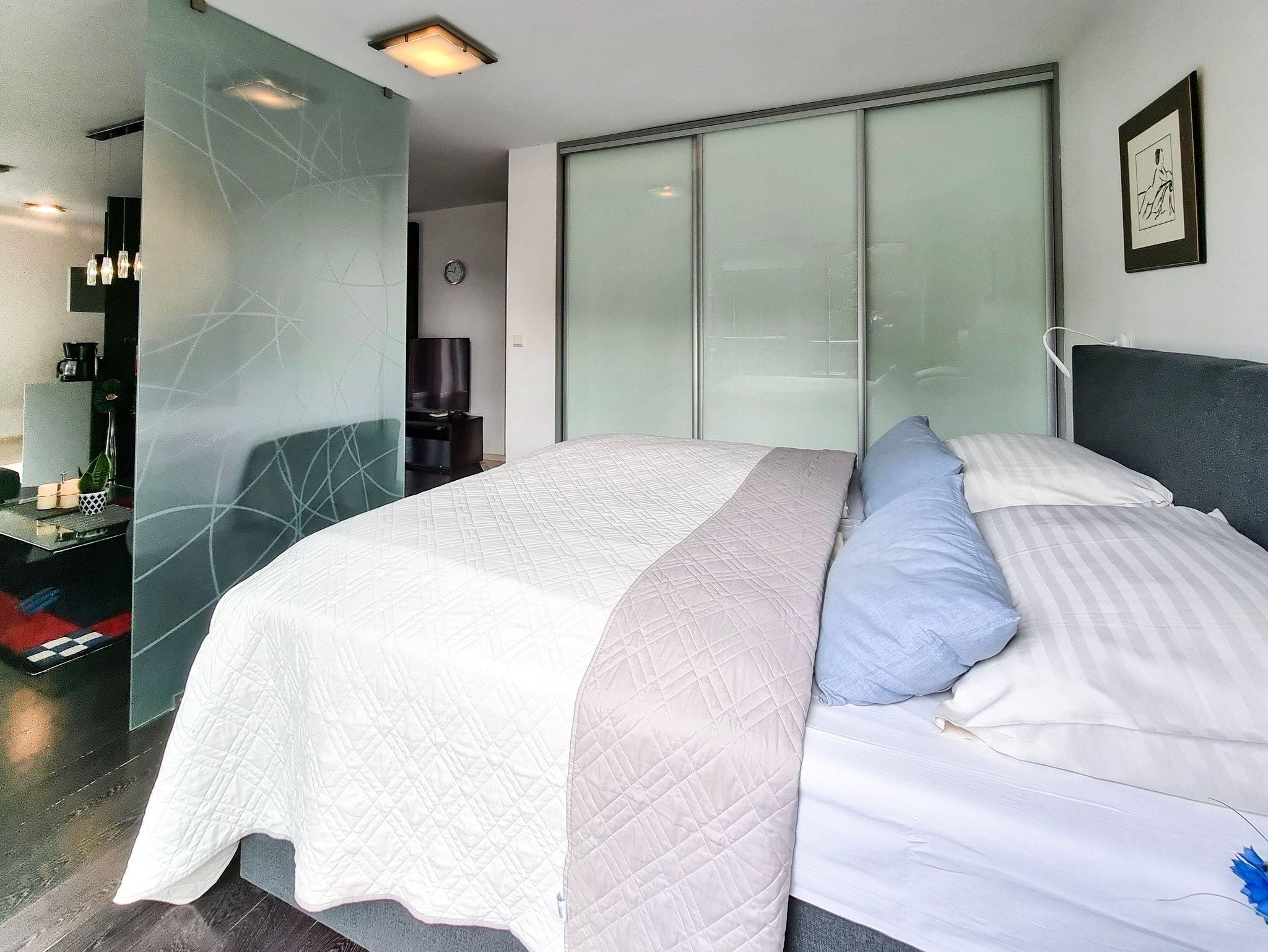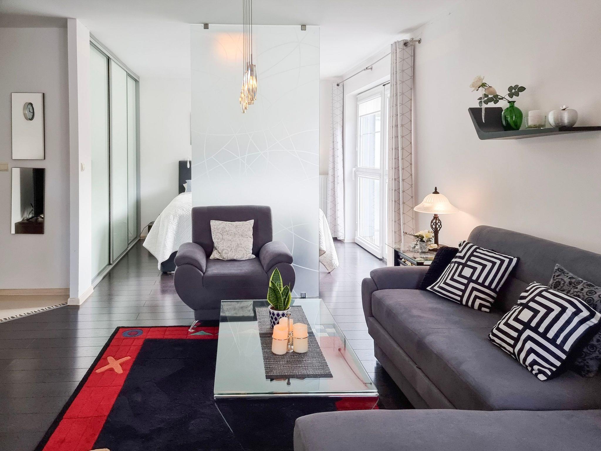 Wohnung mit Balkon von 56m2 befindet sich im 4. Stock in einem Gebäude mit Aufzug. In einem großzügigen Raum vereint es die Funktion eines Schlafzimmers, einer Sitzecke und eines Esszimmers. Die Küchenzeile ist mit allen notwendigen Utensilien für die Zubereitung und den Verzehr von Mahlzeiten ausgestattet, wie z.B. einem Kühlschrank mit Gefrierfach, einem Elektroherd mit zwei Heizstufen, einer Überlauf-Kaffeemaschine, einem Geschirrspüler, einem Wasserkocher und einem Esstisch mit 4 Stühlen. Im Wohnbereich gibt es ein Sofa mit Schlaffunktion (nach dem Ausklappen 140x200cm), einen Sessel, eine Bank und einen Fernseher. Das Schlafzimmer hat ein bequemes, hohes Doppelbett (180x200cm) und einen Kleiderschrank. Die Fenster der Wohnung und des Balkons sind nach Süden ausgerichtet. Im Essbereich gibt es Oberlichter, die nach Westen ausgerichtet sind. Das Badezimmer hat eine Duschkabine, ein Waschbecken und eine Waschmaschine.