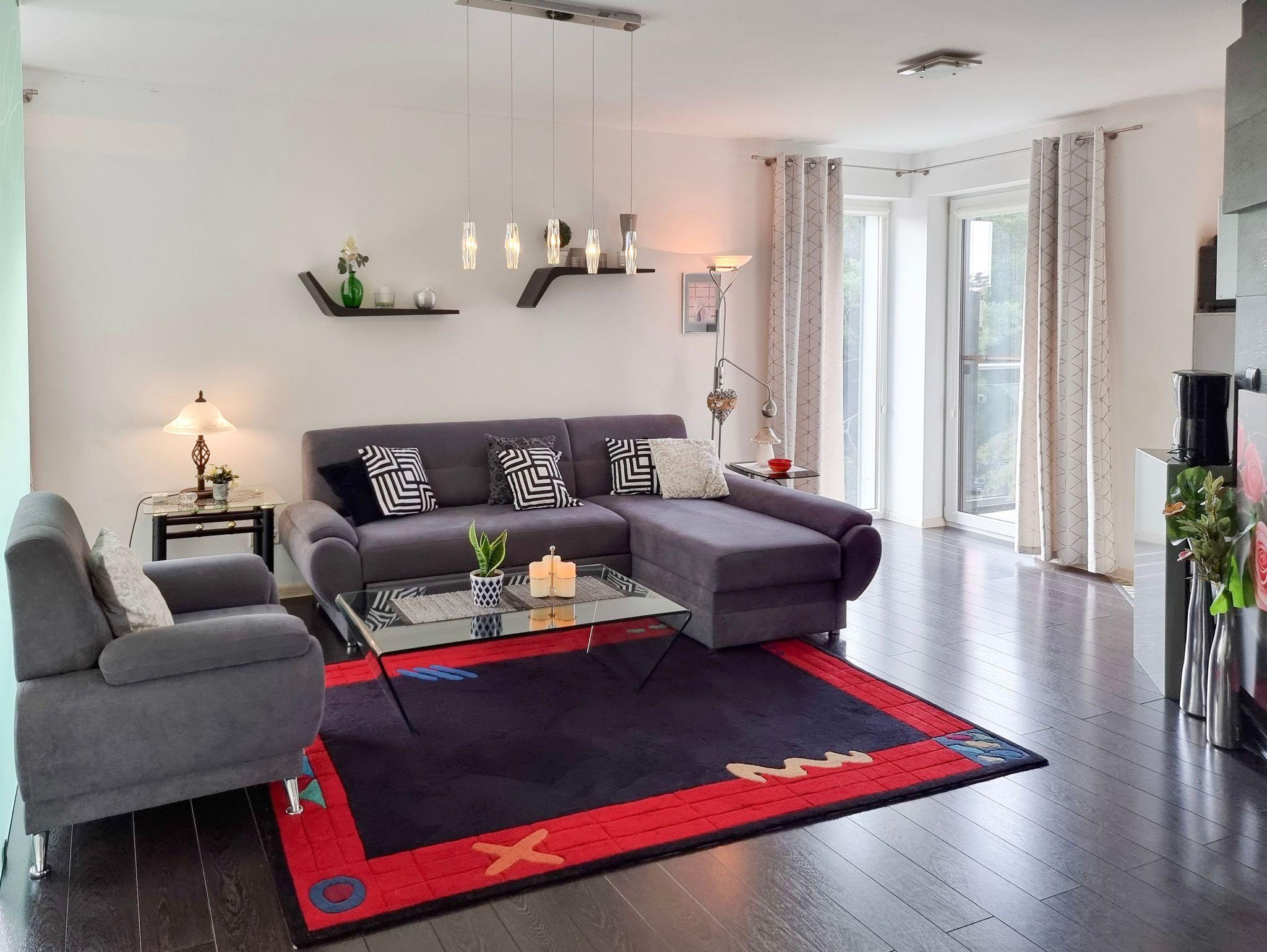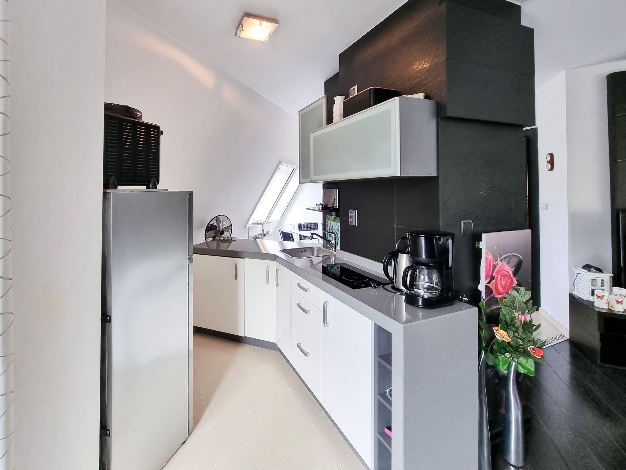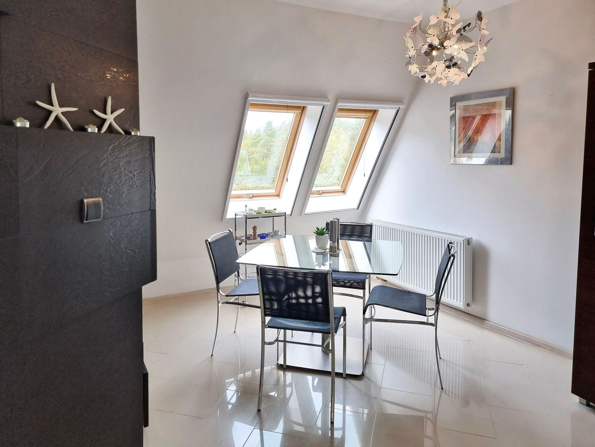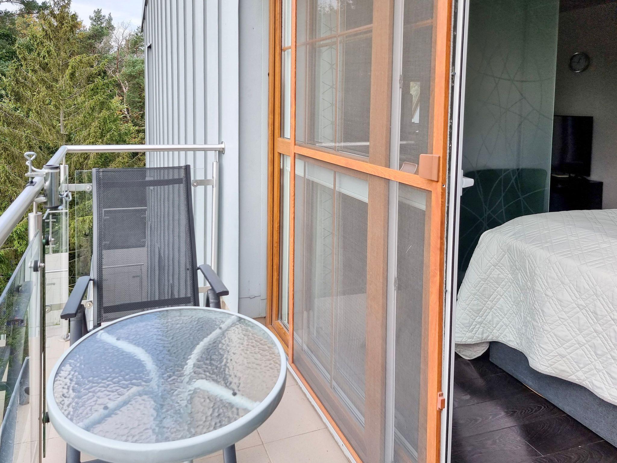 Wohnung mit Balkon von 56m2 befindet sich im 4. Stock in einem Gebäude mit Aufzug. In einem großzügigen Raum vereint es die Funktion eines Schlafzimmers, einer Sitzecke und eines Esszimmers. Die Küchenzeile ist mit allen notwendigen Utensilien für die Zubereitung und den Verzehr von Mahlzeiten ausgestattet, wie z.B. einem Kühlschrank mit Gefrierfach, einem Elektroherd mit zwei Heizstufen, einer Überlauf-Kaffeemaschine, einem Geschirrspüler, einem Wasserkocher und einem Esstisch mit 4 Stühlen. Im Wohnbereich gibt es ein Sofa mit Schlaffunktion (nach dem Ausklappen 140x200cm), einen Sessel, eine Bank und einen Fernseher. Das Schlafzimmer hat ein bequemes, hohes Doppelbett (180x200cm) und einen Kleiderschrank. Die Fenster der Wohnung und des Balkons sind nach Süden ausgerichtet. Im Essbereich gibt es Oberlichter, die nach Westen ausgerichtet sind. Das Badezimmer hat eine Duschkabine, ein Waschbecken und eine Waschmaschine.