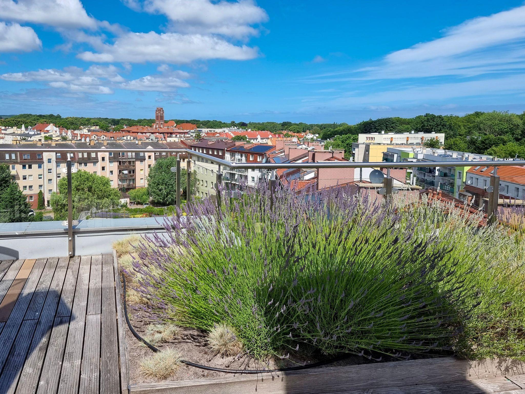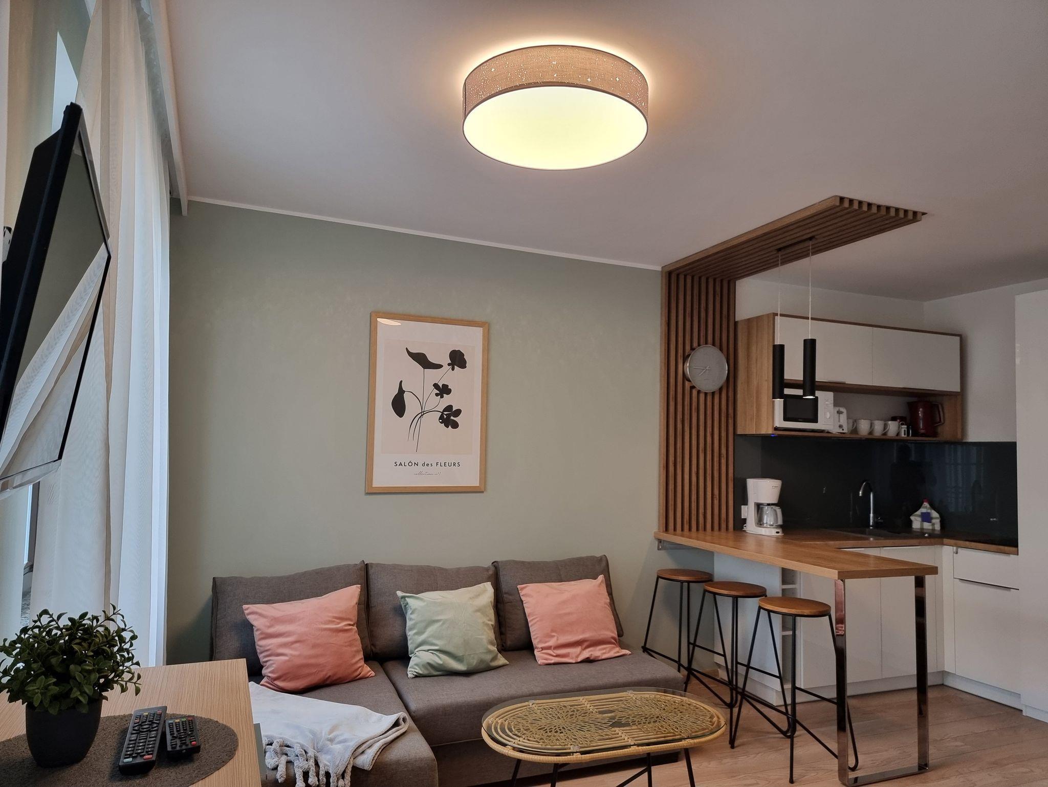 Die Ferienwohnung mit Balkon befindet sich auf der 2. Etage eines neugebauten Hauses (Baujahr 2016). Das Gebäude (Überwachung) befindet sich im Wohnviertel Windrose, am Eingang zum Kurpark. Von hieraus ist es nicht weit zur Fähranlegestelle „Bielik“, zum Stadtzentrum, Apotheke und ins Krankenhaus. Zum Strand führt ein Spazierweg durch den Kurpark. Von der I. Etage erreichen wir einen grünen Innenhof.