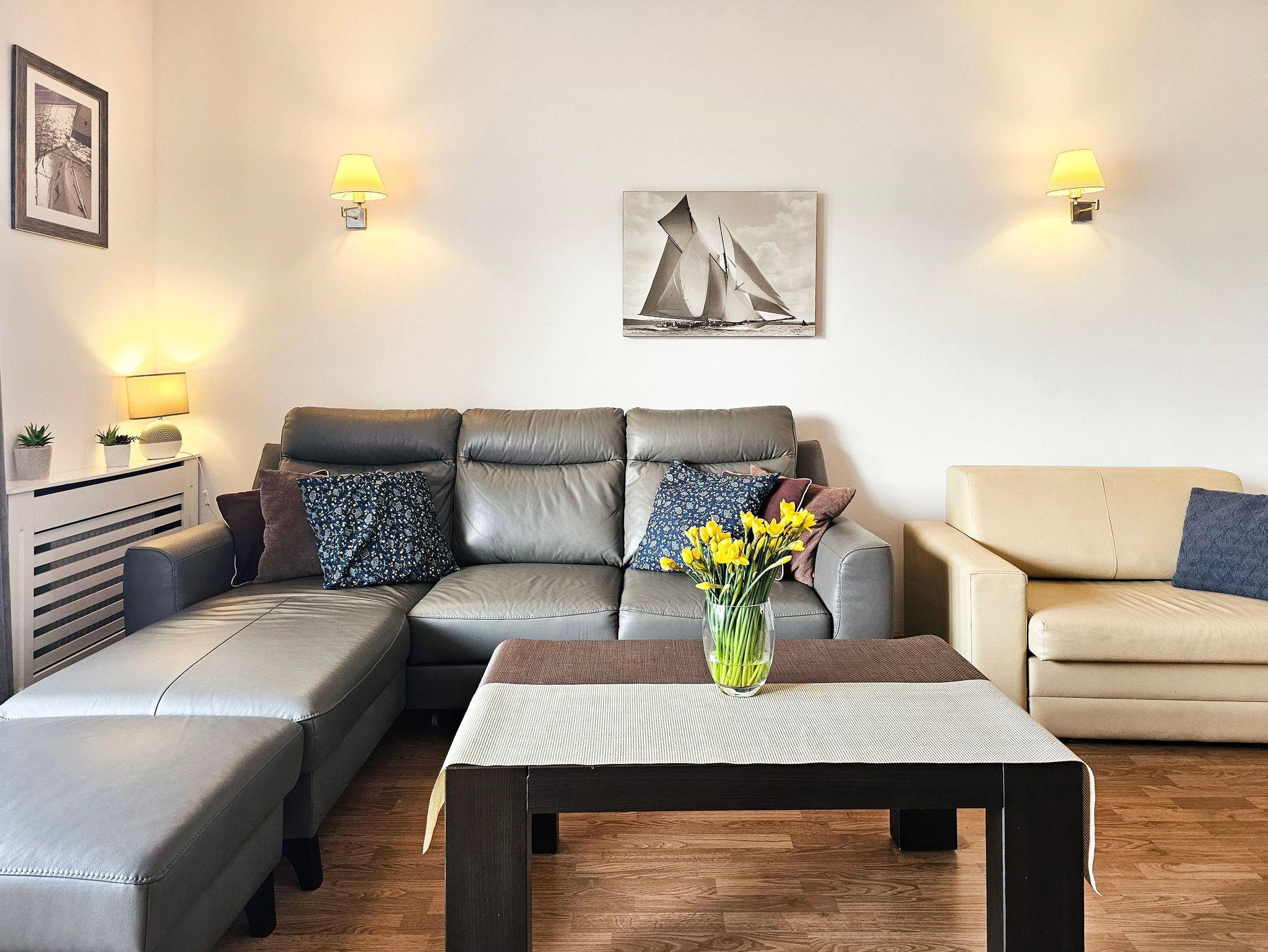 Im Wohnzimmer, mit Balkonausgang, steht eine Kommode mit einem LCD-TV mit Kabelanschluss, Glasvitrine, ein Couchtisch und zwei Schlafsofas (das erste mit einer Liegefläche von 130x190cm, das zweite mit einer Liegefläche von 90x190cm). Das Wohnzimmer schafft einen offenen Raum mit einem Flur (keine Tür). Die Fenster des Wohnzimmers, sowie der Balkon sind nach Westen gerichtet. Auf dem Balkon stehen zwei Holzstühle und ein Tisch.
