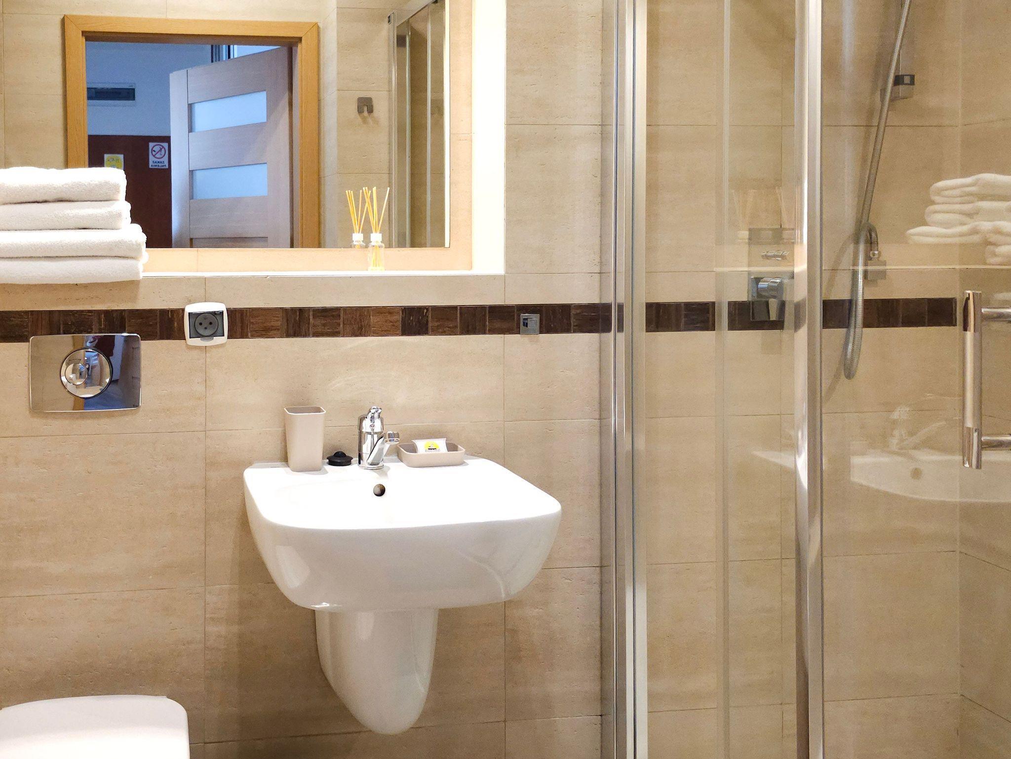 Das Badezimmer mit Dusche und WC ist zusätzlich mit einer Waschmaschine ausgestattet.