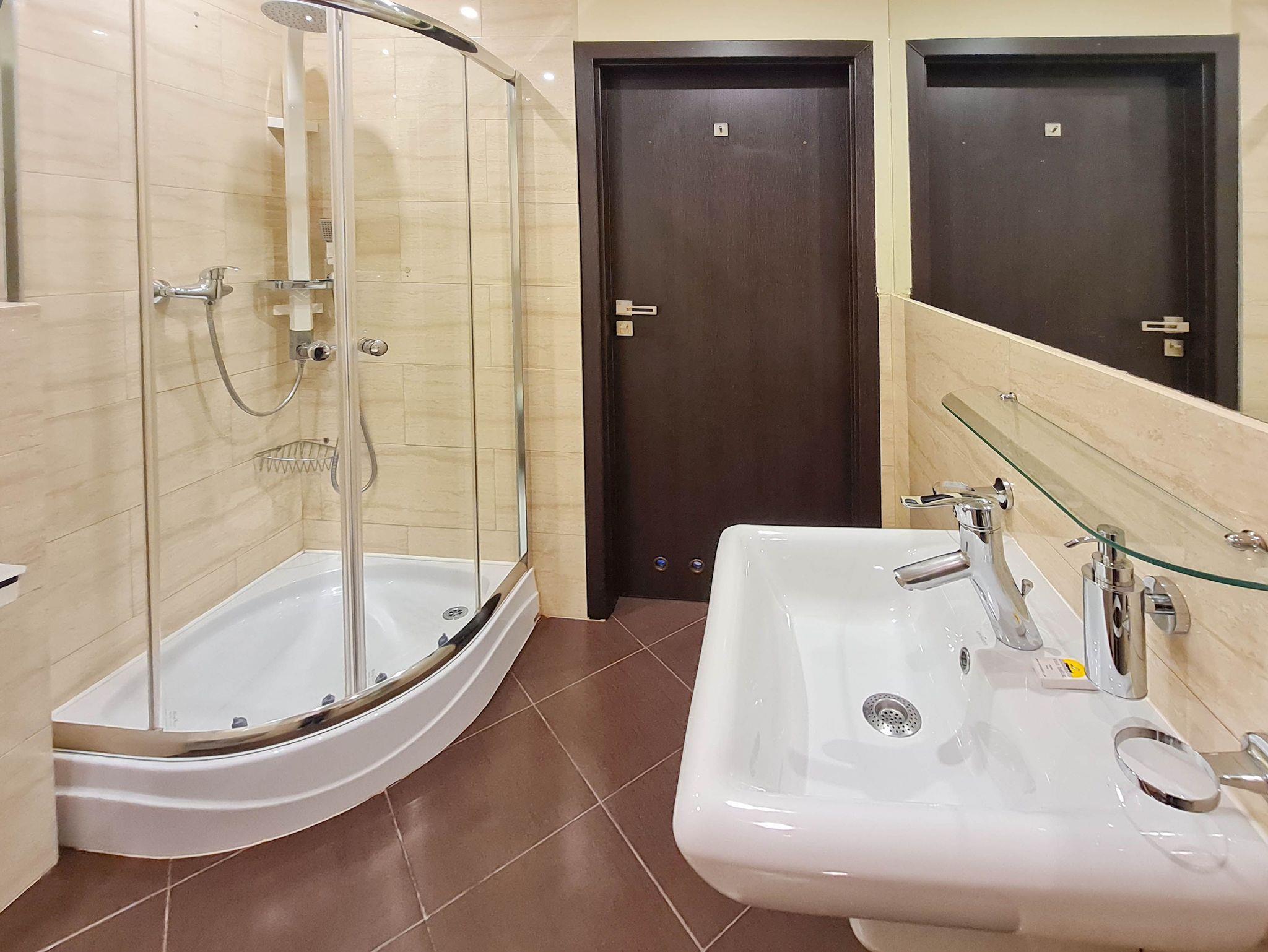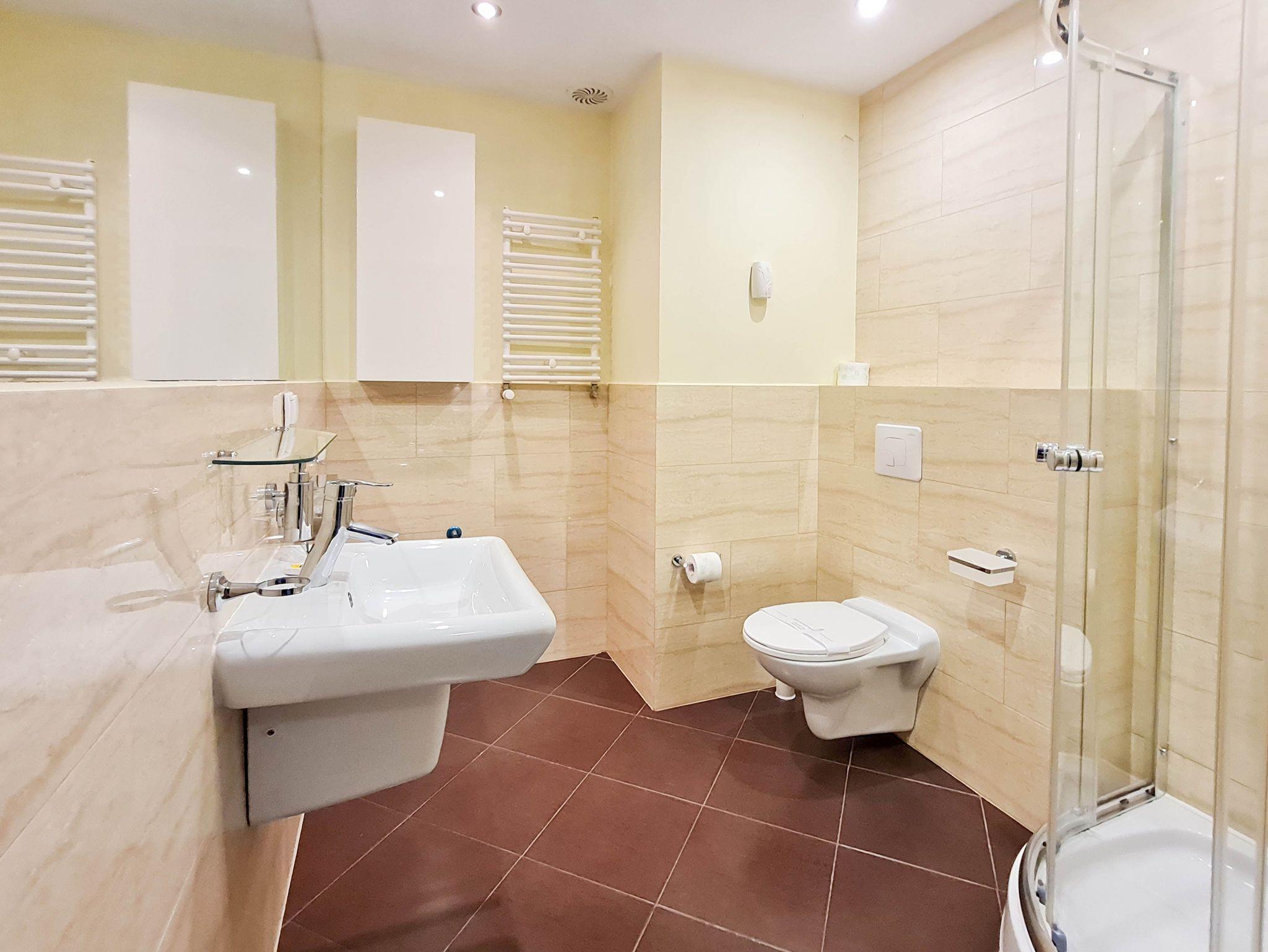 Das Badezimmer hat ein WC, eine Duschkabine und einen großen Spiegel.