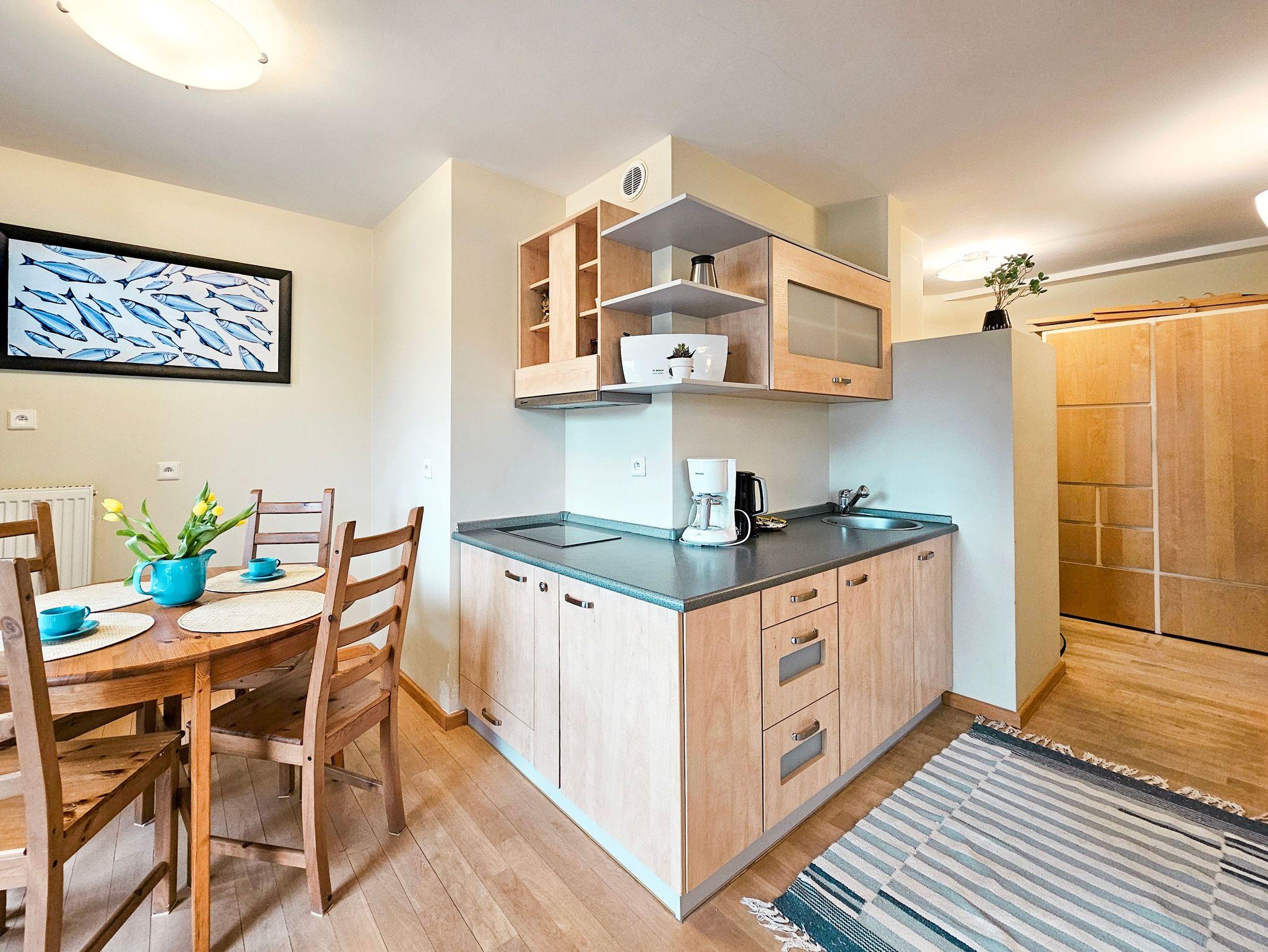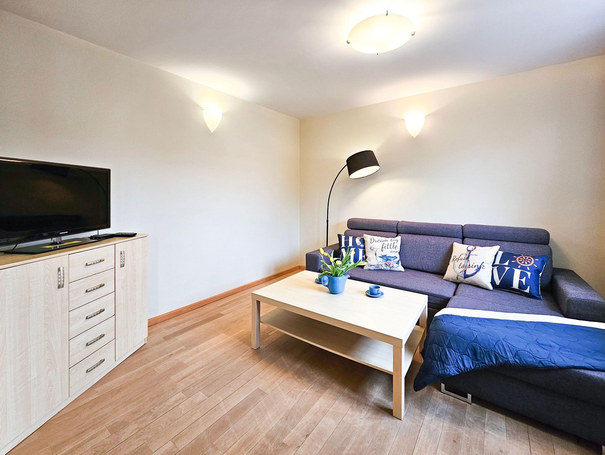 Das Schlafzimmer mit Ehebett befindet sich auf der Westseite. Die Fenster des Wohnzimmers mit einer Küchenzeile und einem Balkon sind nach Norden gerichtet, mit Blick zur Promenade. Im Wohnzimmer ist eine Schlafcouch für zwei Personen, TV und ein Esstisch mit 4 Stühlen. Die Küchenzeile ist mit einem Zwei-Platten-Herd, Kühlschrank und allen notwendigen Geräten und Geschirr ausgestattet. Das Bad hat eine Dusche. Zur Ausstattung des Appartements gehören eine Waschmaschine. Die Gäste können einen WLAN-Internetzugang nutzen. Gebührenpflichtige Parkzonen in Swinemünde: das Parken ist von Anhang Mai bis Ende September von Montag bis Samstag 8-20 Uhr kostenpflichtig. An Feiertagen ist das Parken hier kostenlos. Ein bewachter Parkplatz befindet sich in der Nähe (Entfernung 300m)