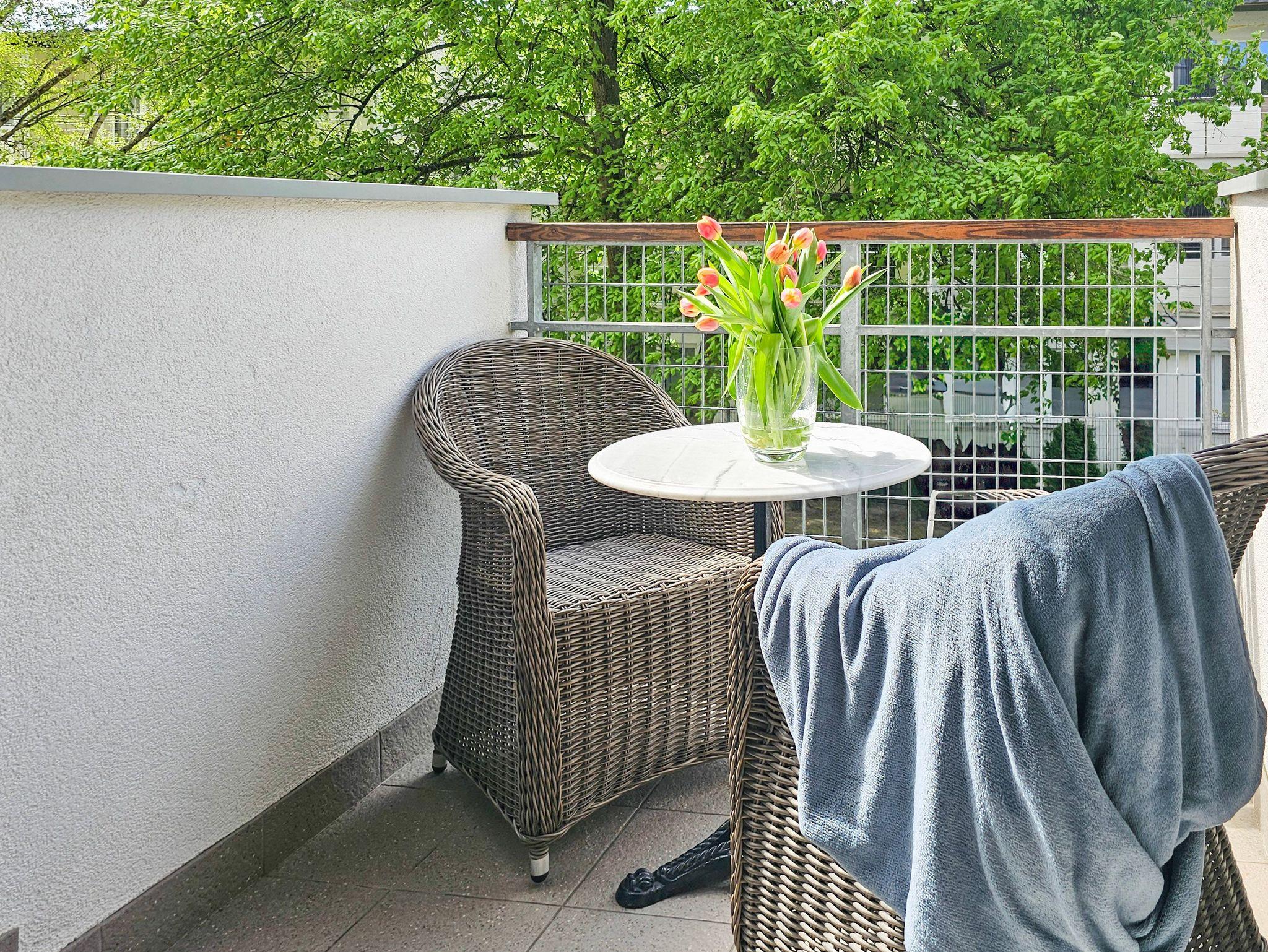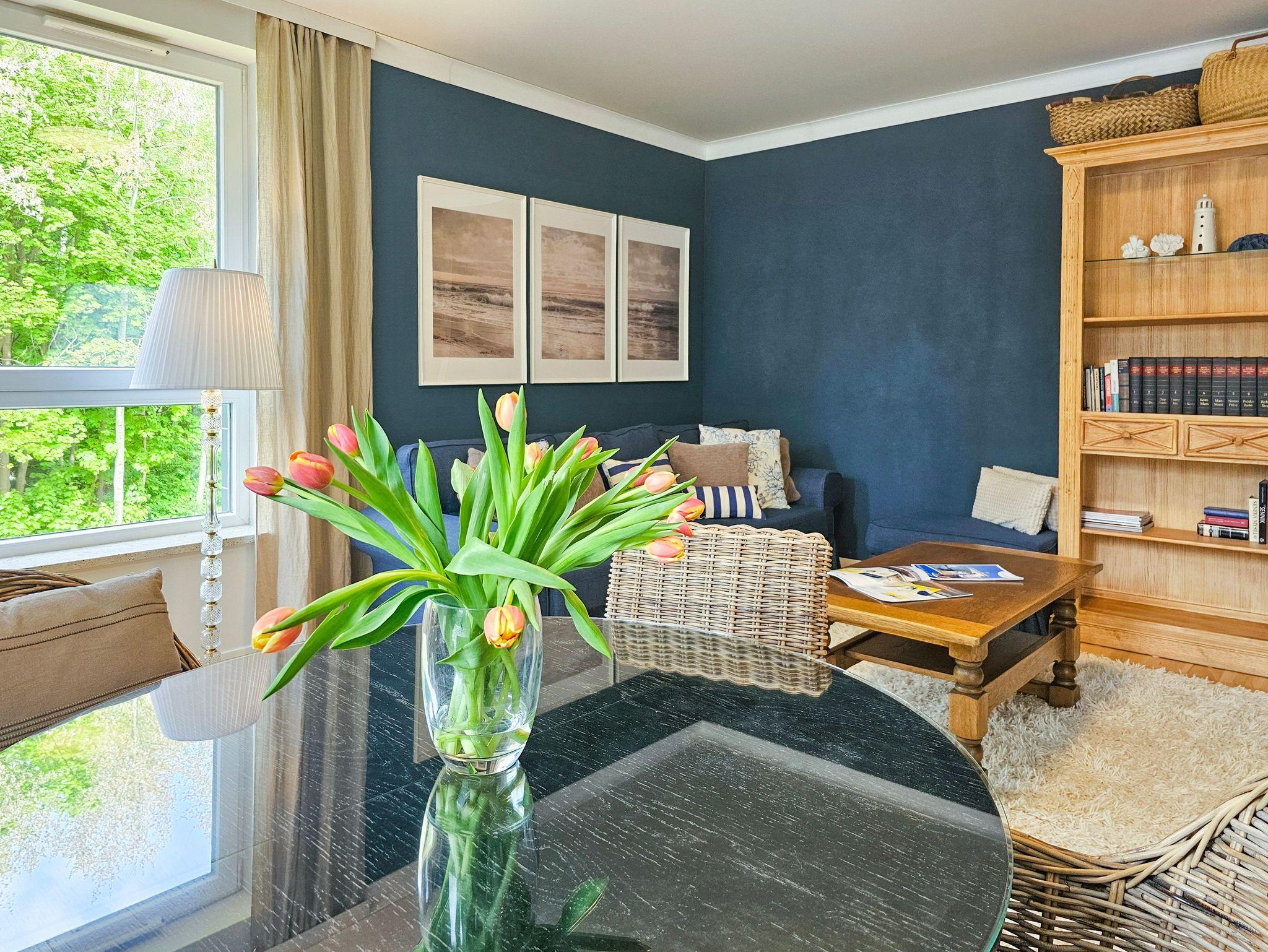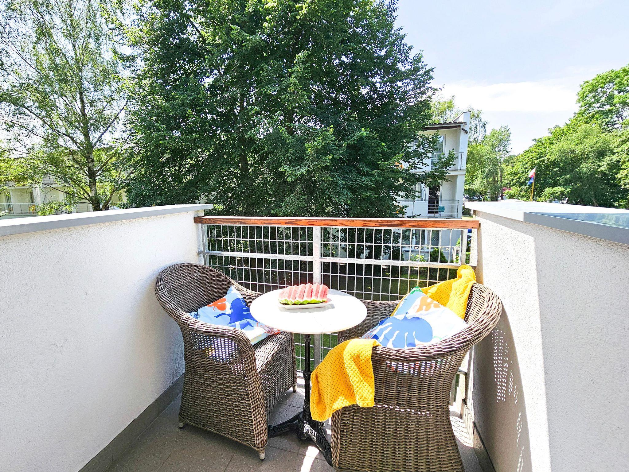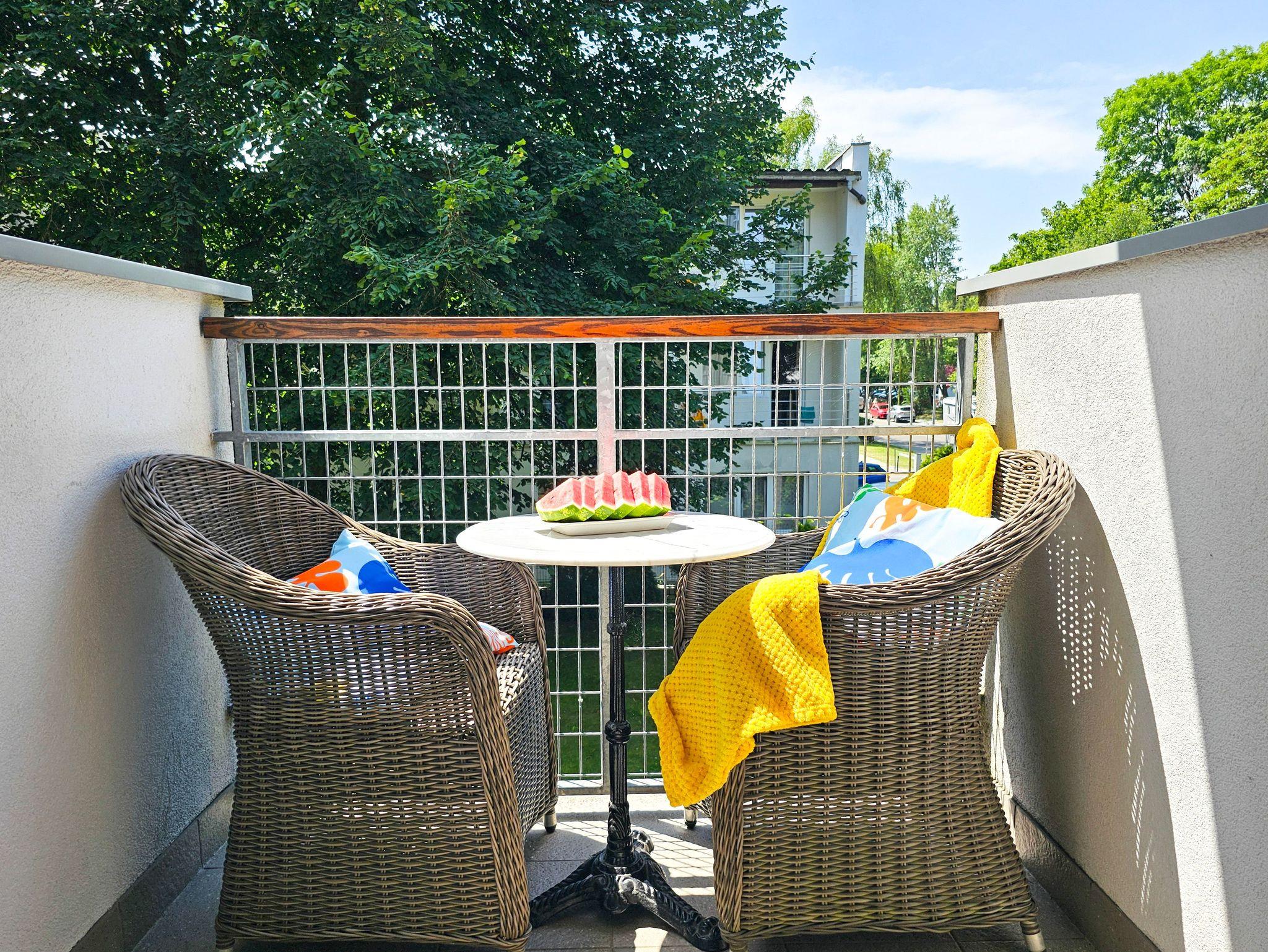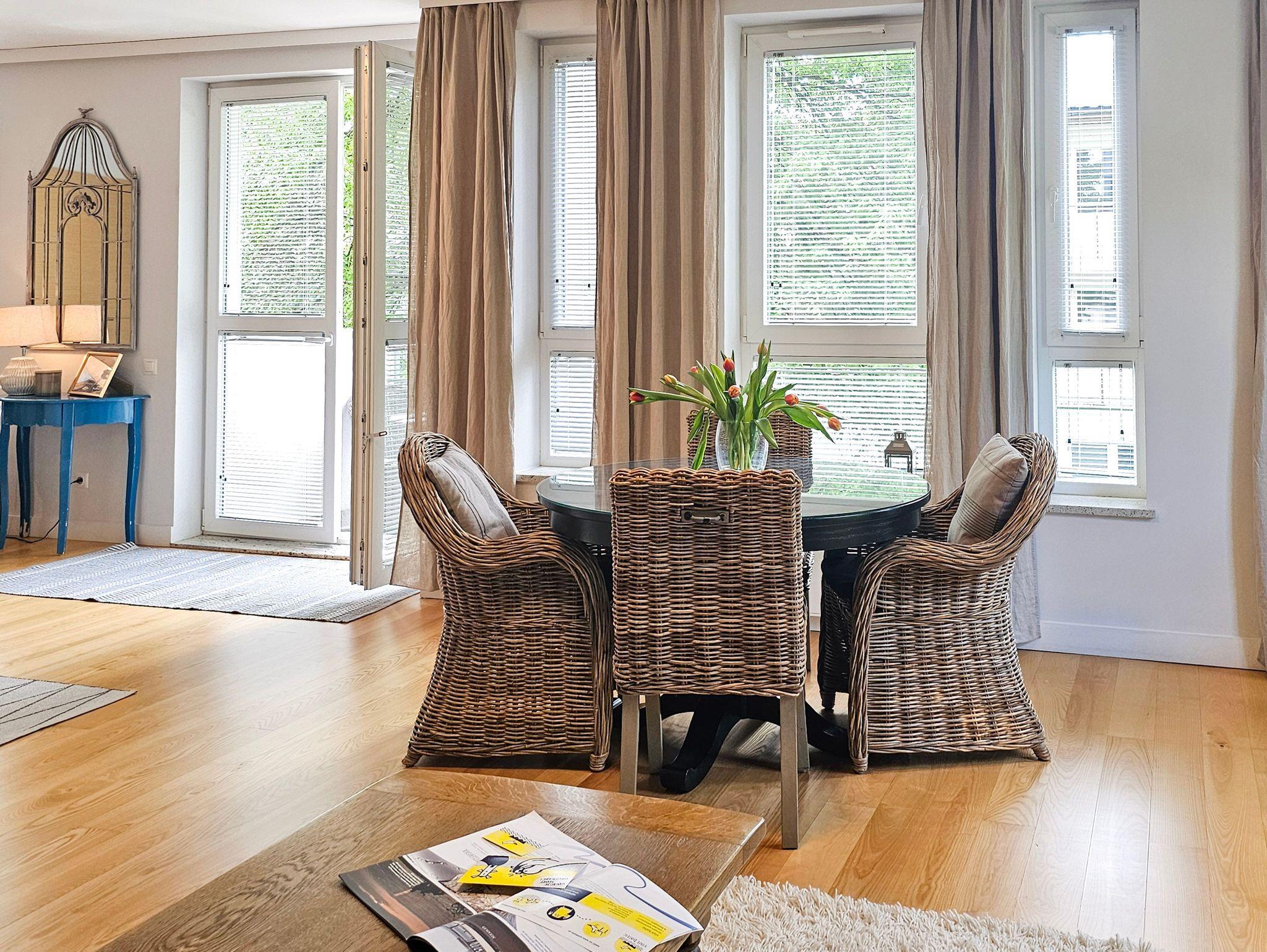 Im Wohnzimmer, von dem aus man auf den Balkon gelangt, stehen den Gästen ein bequemes Sofa (ausgeklappt mit einer Liegefläche von 140×200 cm), ein Couchtisch sowie ein Esstisch mit vier Sesseln zur Verfügung. Die Küchenzeile ist ausgestattet mit einem Kühlschrank, Wasserkocher, Filterkaffeemaschine, Toaster, Mikrowelle und Elektroherd. Zusätzlich steht ein Airfryer zur Verfügung. Die Fenster des Wohnzimmers sind nach Süden und Westen ausgerichtet, der Balkon liegt auf der Südseite.