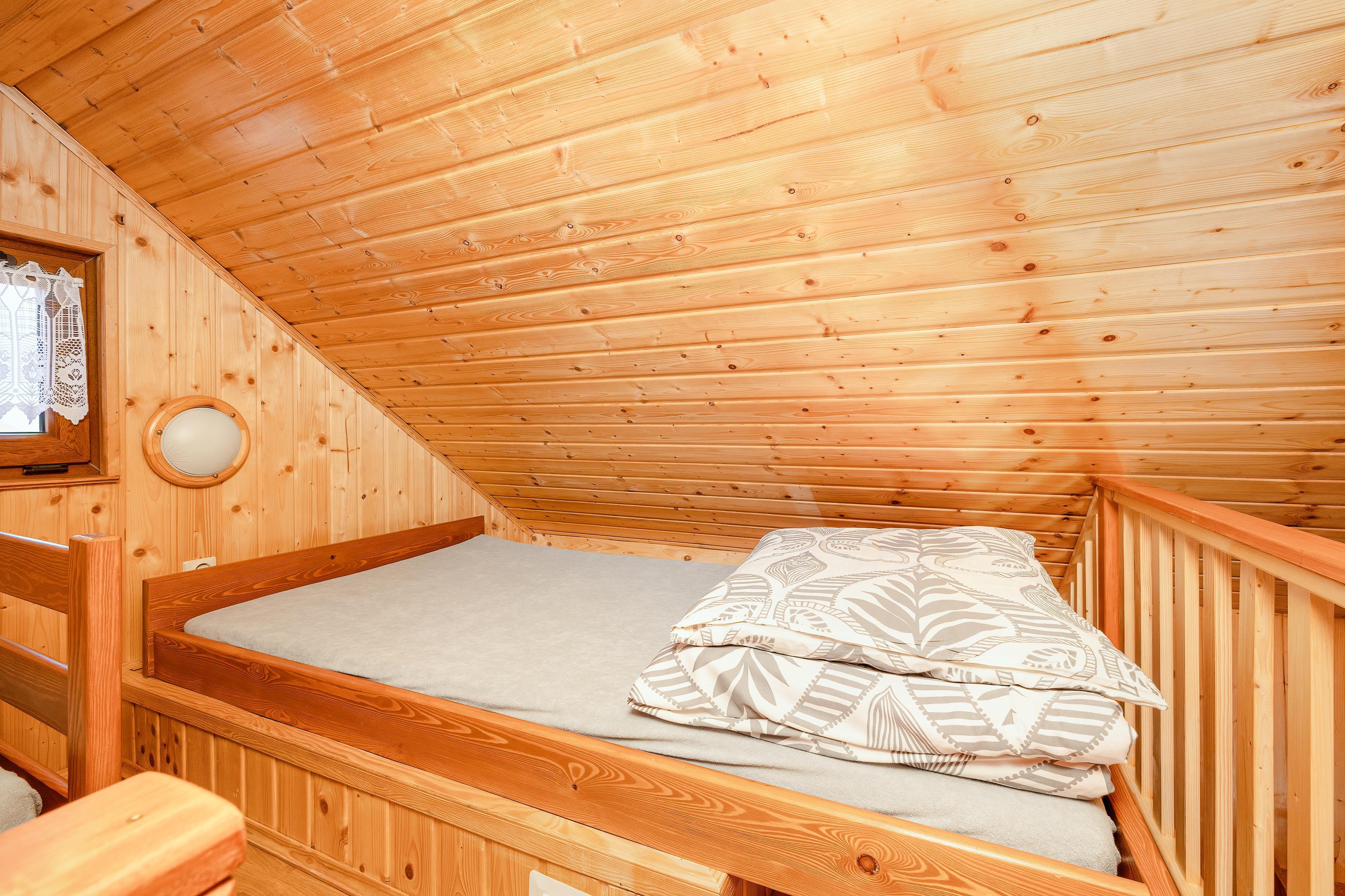 PL 50.24 Ferienhaus 2-4 Pers.: Interessant konzipiertes Ferienhaus mit ca. 25 qm Wohnfläche. Wohn-/Essraum mit Sat-TV (dt. Programme), Esstisch, Küchenzeile (Gaskocher 2 Flammen). Bad: Du, Wb, WC, Warmwasser über E-Boiler (60 l), Franz. Doppelbett und 2 versetzt darüberliegenden Etagenbetten. Terrasse mit Sitzmöbeln, Esstisch, Grill.