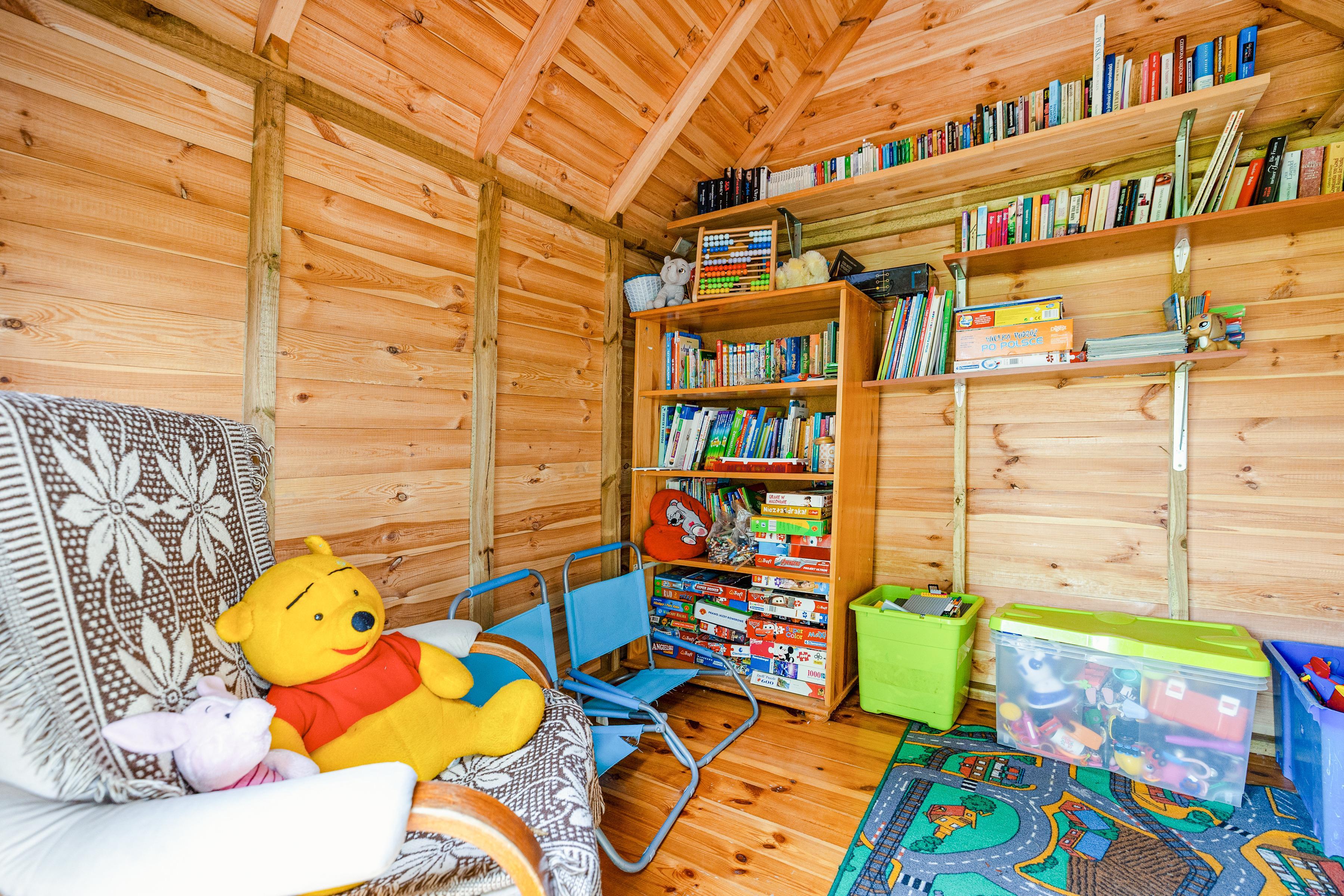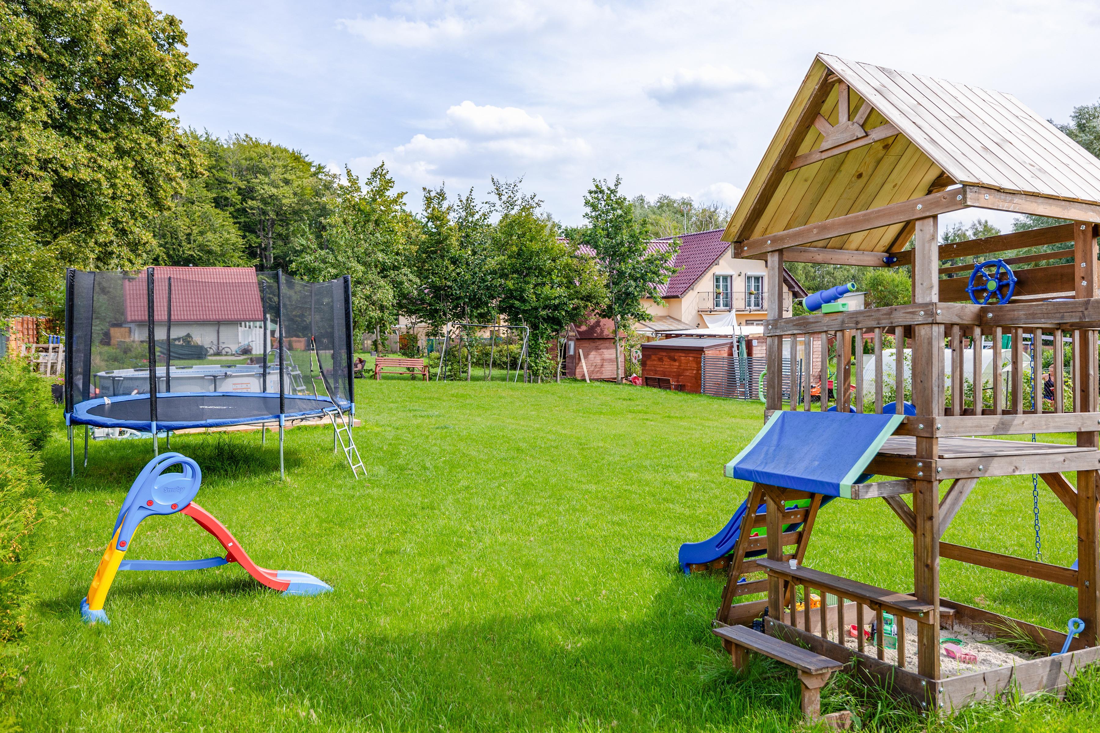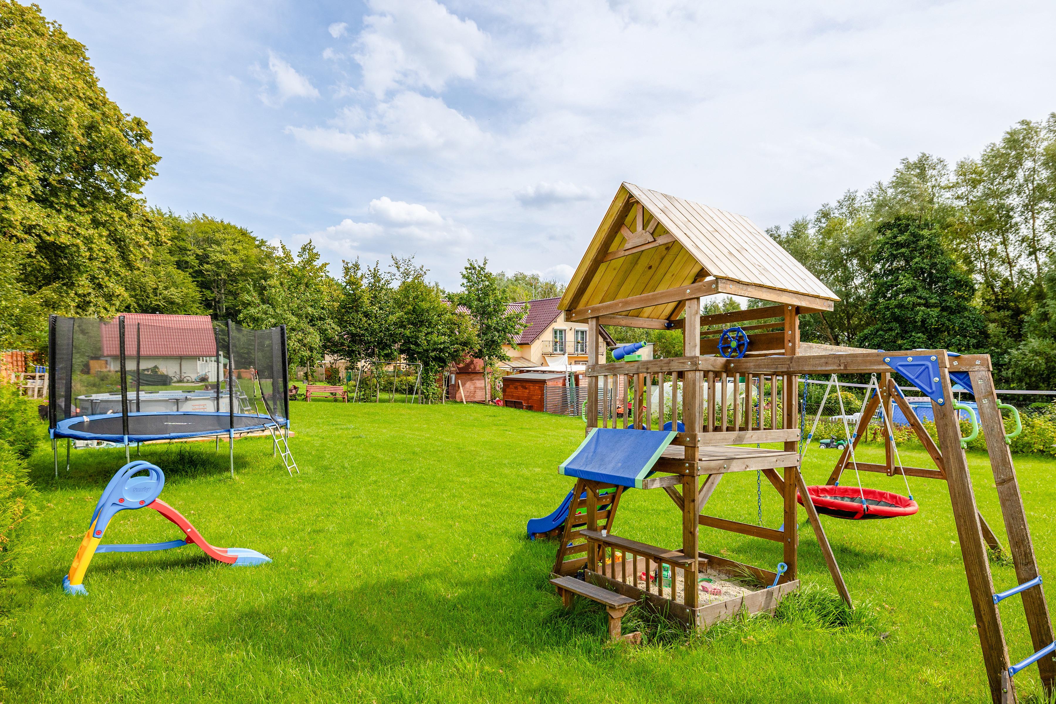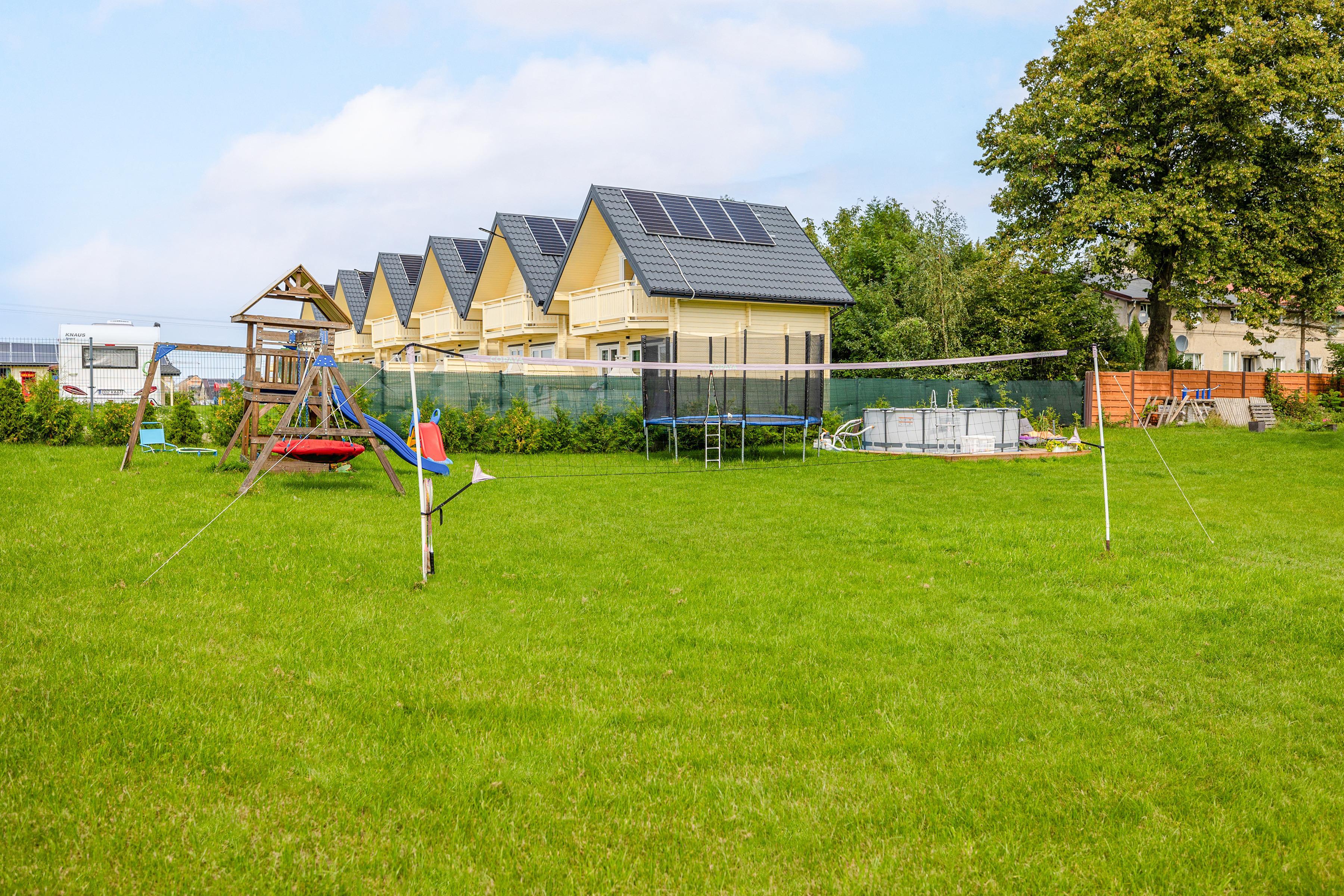 Haus: 3 Ferienhäuser auf einem gepflegten, umzäunten Rasengrundstück (1200 qm), 2019 erbaut. In der Anlage: Kleiner Spielplatz mit Sandkasten, Rutsche, Schaukel, Trampolin. Kleines, nicht überdachtes Schwimmbecken.