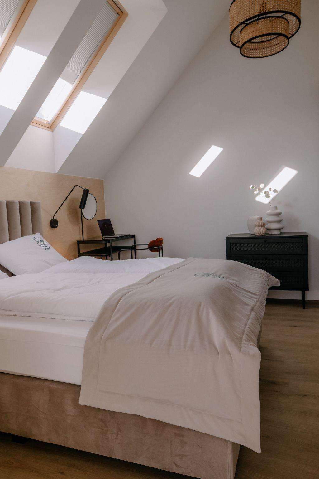 In addition to the private sauna and whirlpool bath, guests can enjoy the warmth of the wood-burning fireplace and relax on the specially prepared relaxation grid, from where you can enjoy a panoramic view of the Giant Mountains. A prepared barbecue and fireplace area invites you to spend evenings in warm, friendly company, enjoying shared conversations.