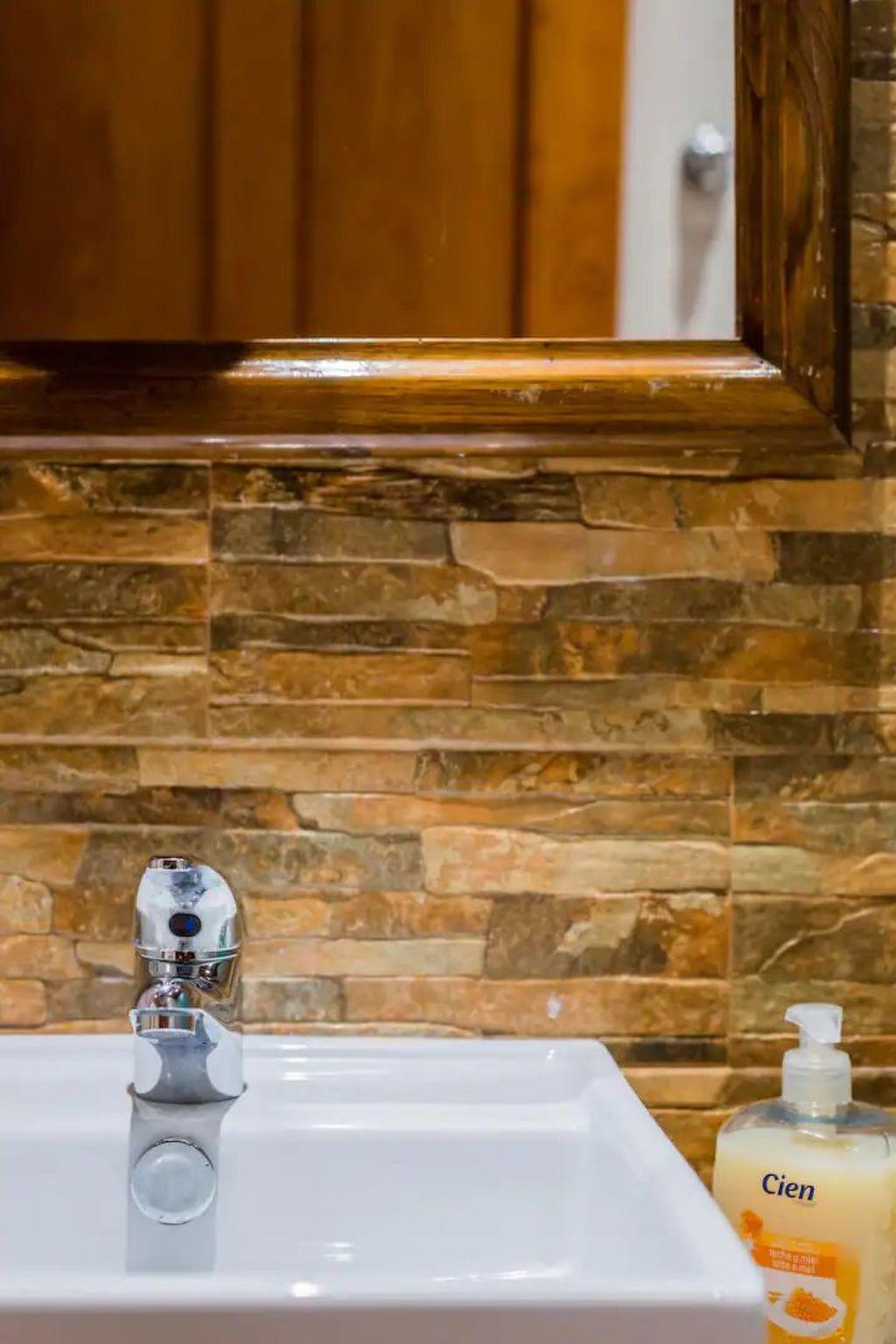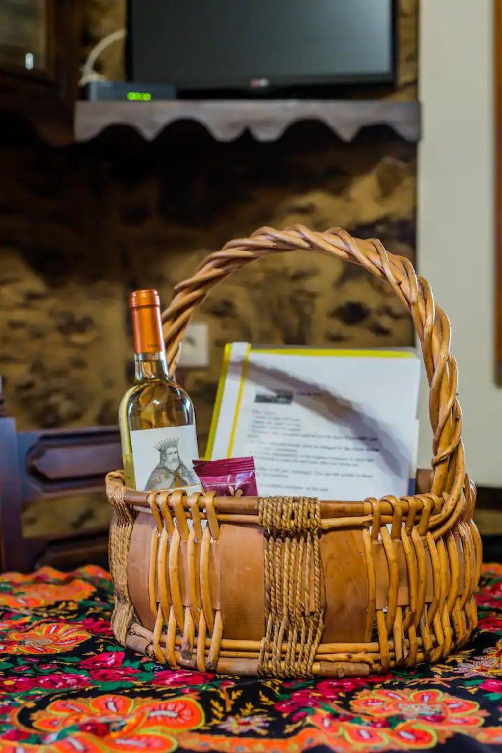 The 60 m² house is comfortably furnished and offers space for five people. It offers two bedrooms, both furnished with a double bed (180 cm) and an ensuite bathroom with a shower or a bathtub. There is an additional toilet outside. The spacious, open plan kitchen is furnished with a cosy sofa bed for one, a dining area and the kitchen unit with a gas stove, an oven, a fridge, a dishwasher, a microwave and a coffee maker. The cupboard is stocked with dishes, glassware and cutlery. Upon request, a baby bath tub and a child's cot can be provided. The house has Wi-Fi, satellite television (national and international channels), electric heating, a wood oven and a fireplace. It is comfortably warm in the winter and refreshingly cool in the summer.