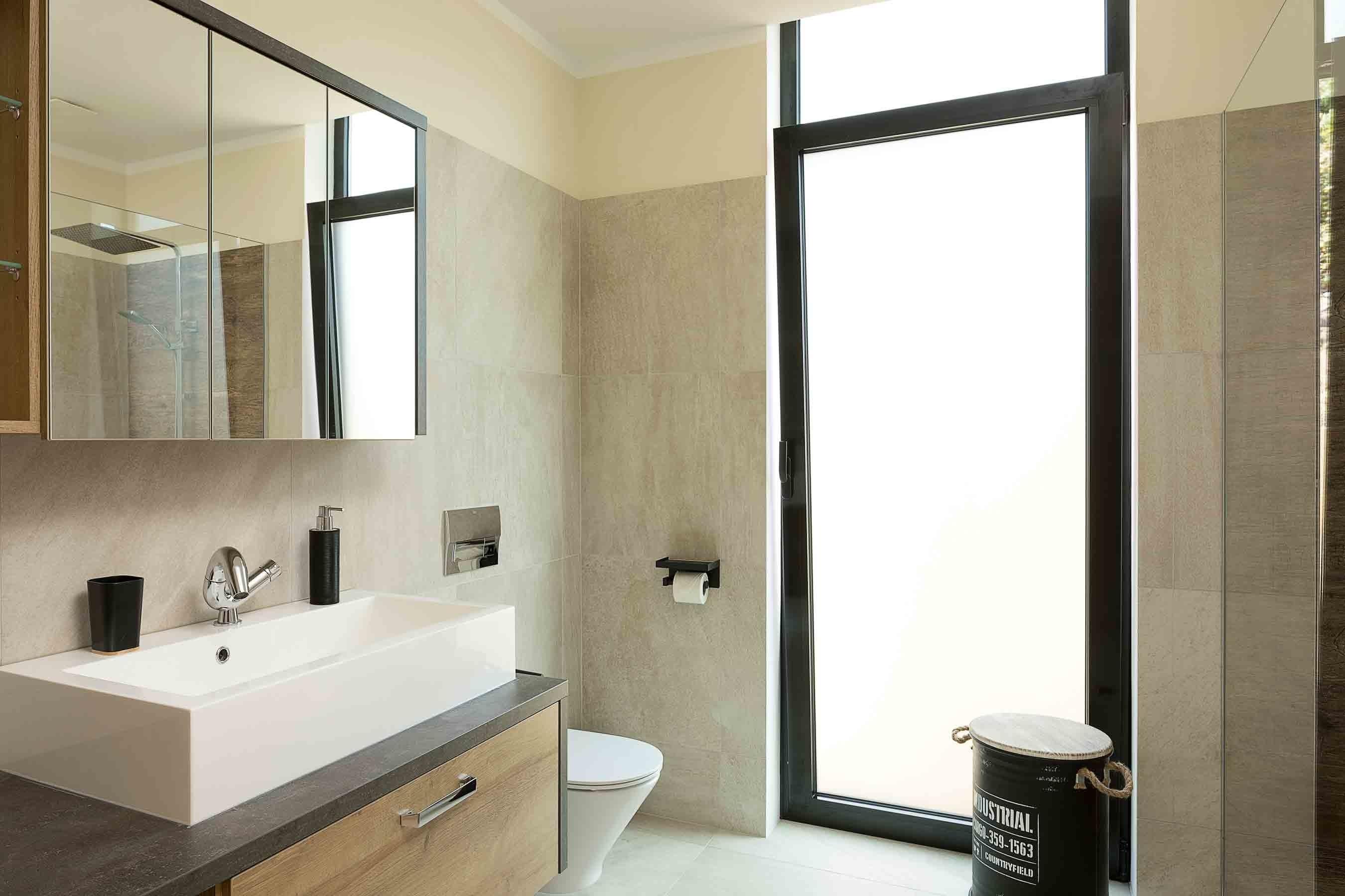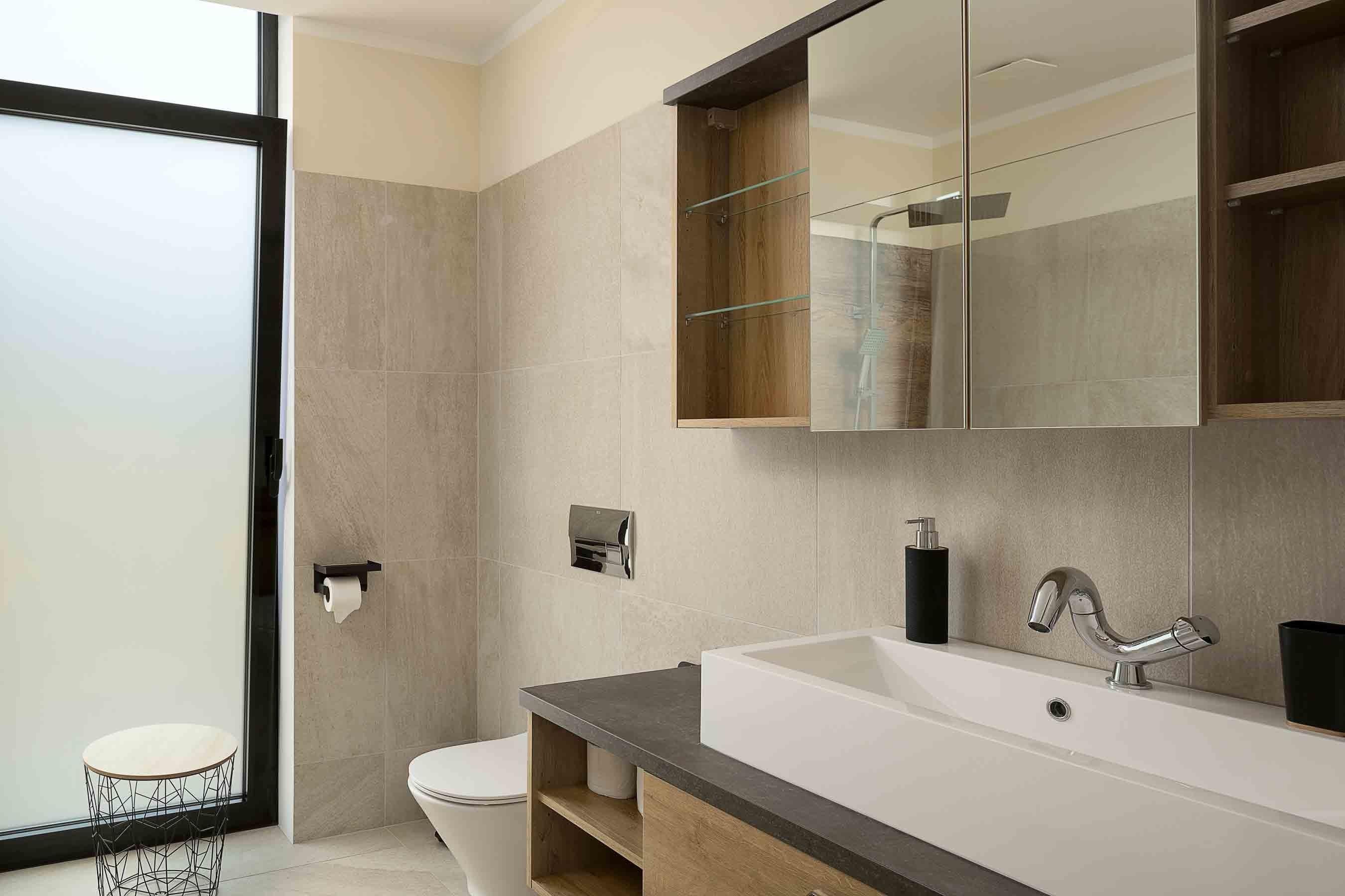 Die zwei identischen Badezimmer bieten euch eine Regendusche mit ordentlichem Wasserdruck, bequeme Toiletten, ein Waschbecken und genügend Ablagefläche und Steckdosen. Im Gäste-WC findet ihr noch eine zusätzliche Toilette plus Waschbecken.