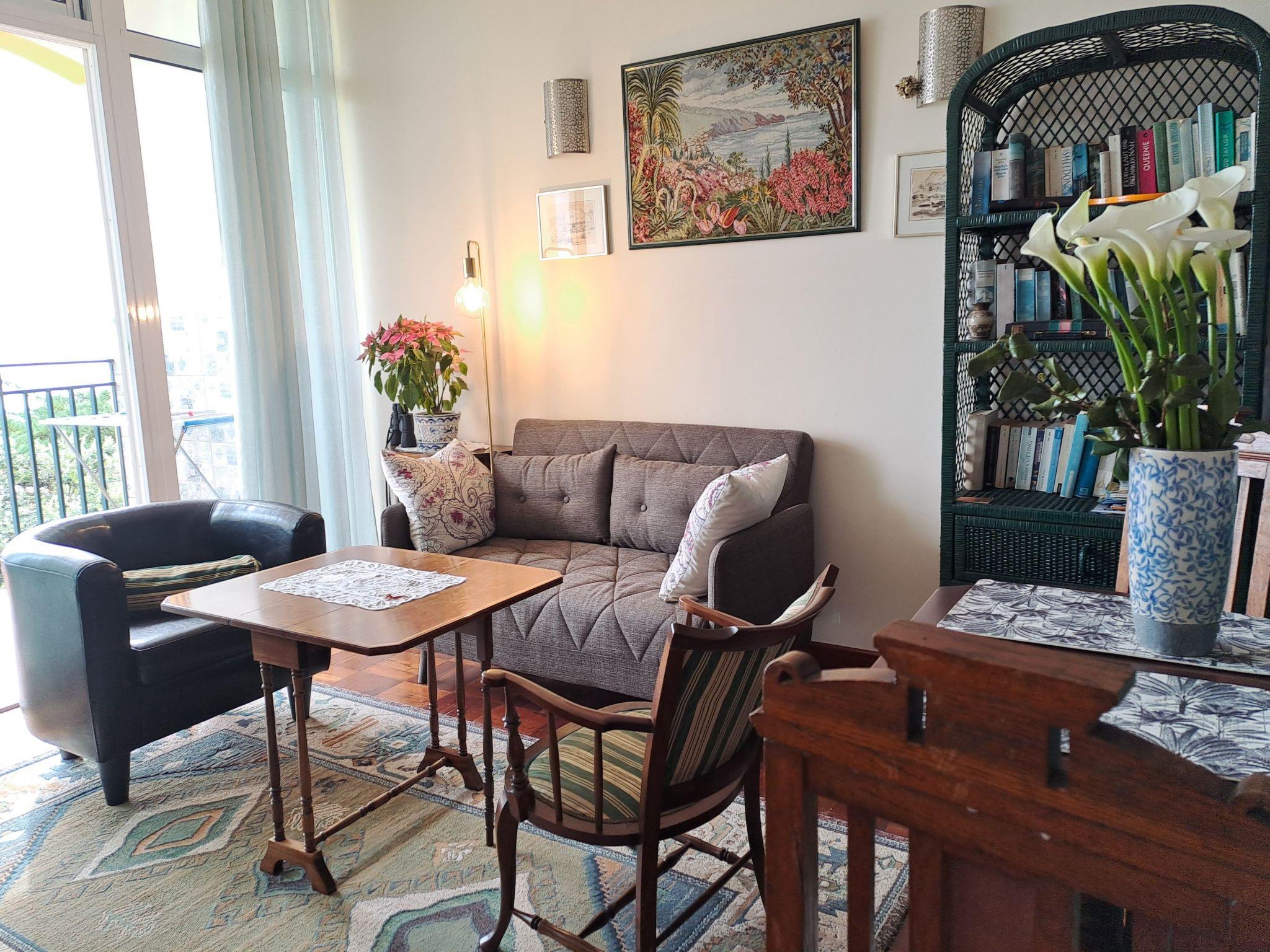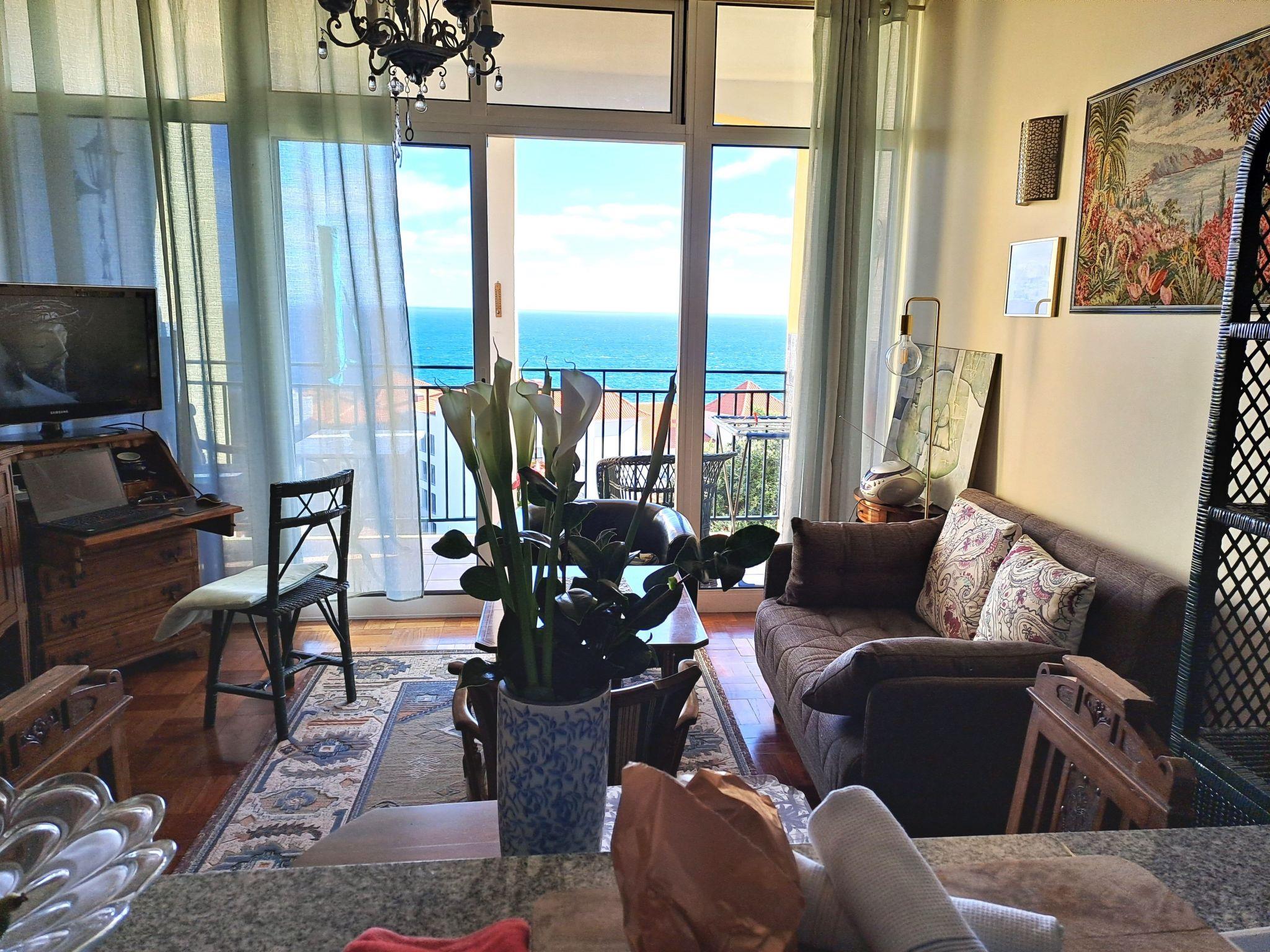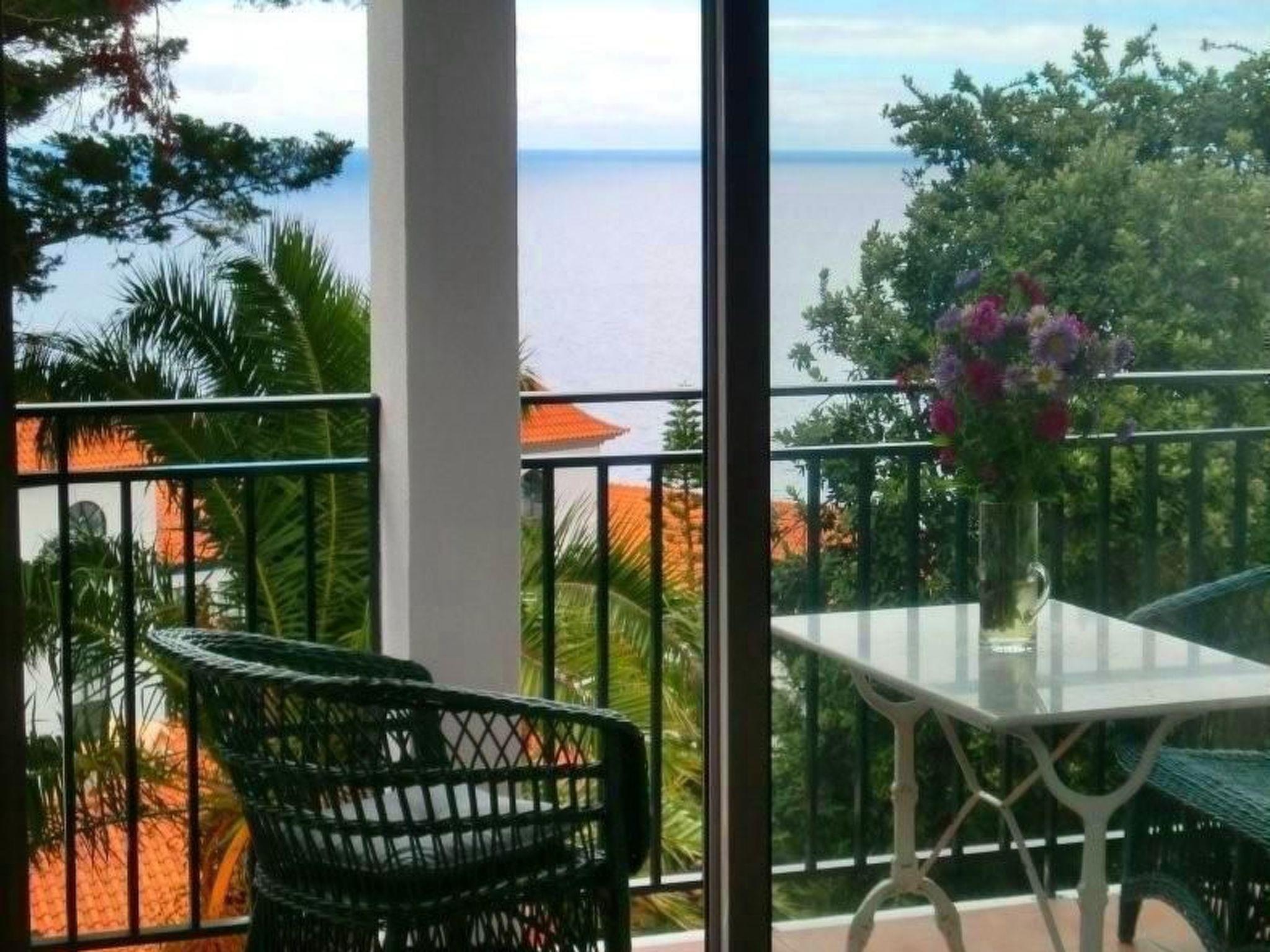 The flat has a north-facing bedroom in Madeiran style with large, new beds. A living room with a small pull-out couch, satellite TV with flat screen, a practical hatch to the kitchen, where you will find a 4-burner ceramic hob, a kettle, a coffee machine, a hand mixer, a microwave and a washing machine. And the cosy, covered breakfast balcony with a wonderful sea view.